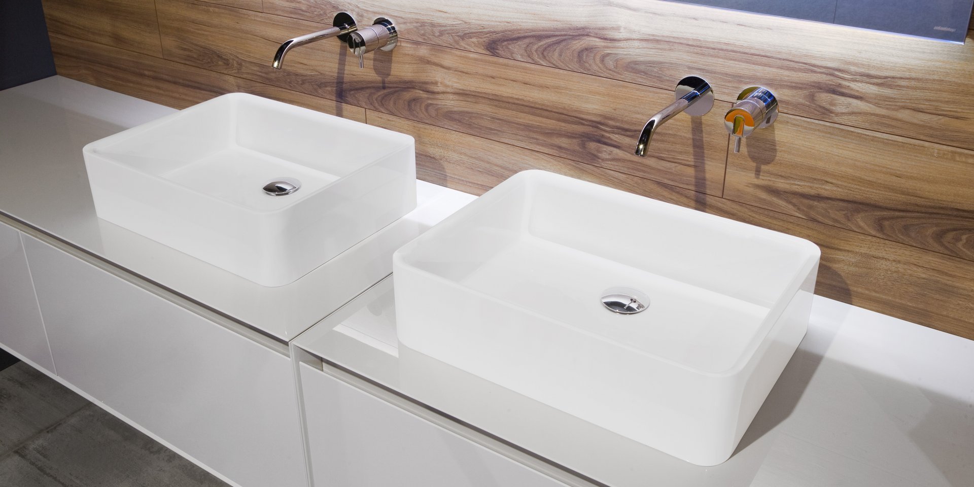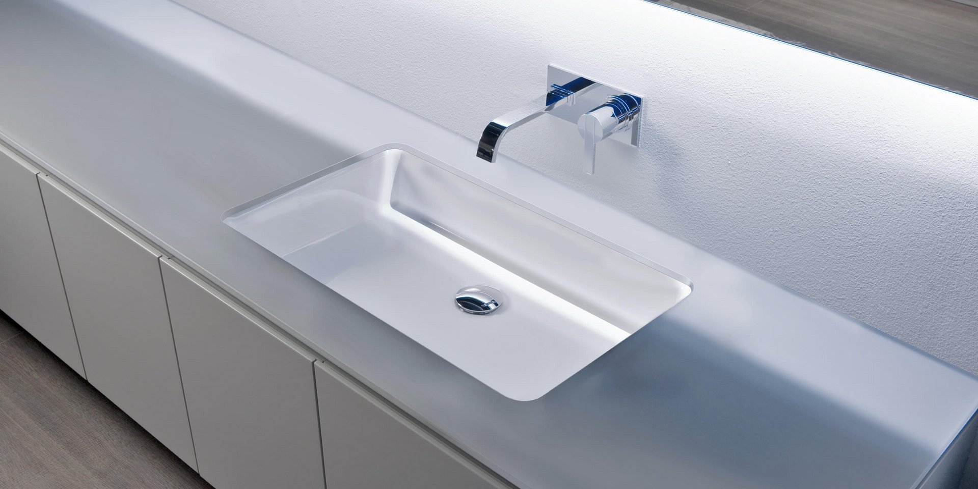 Rectangular top mount or undermount Flumood? sink complete with drain pipe fitting and open plug.