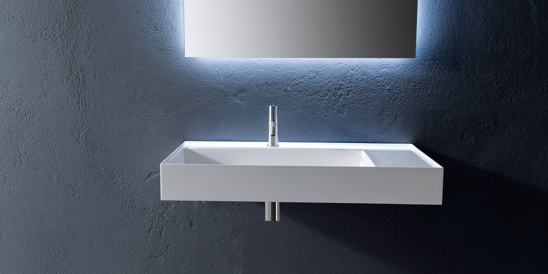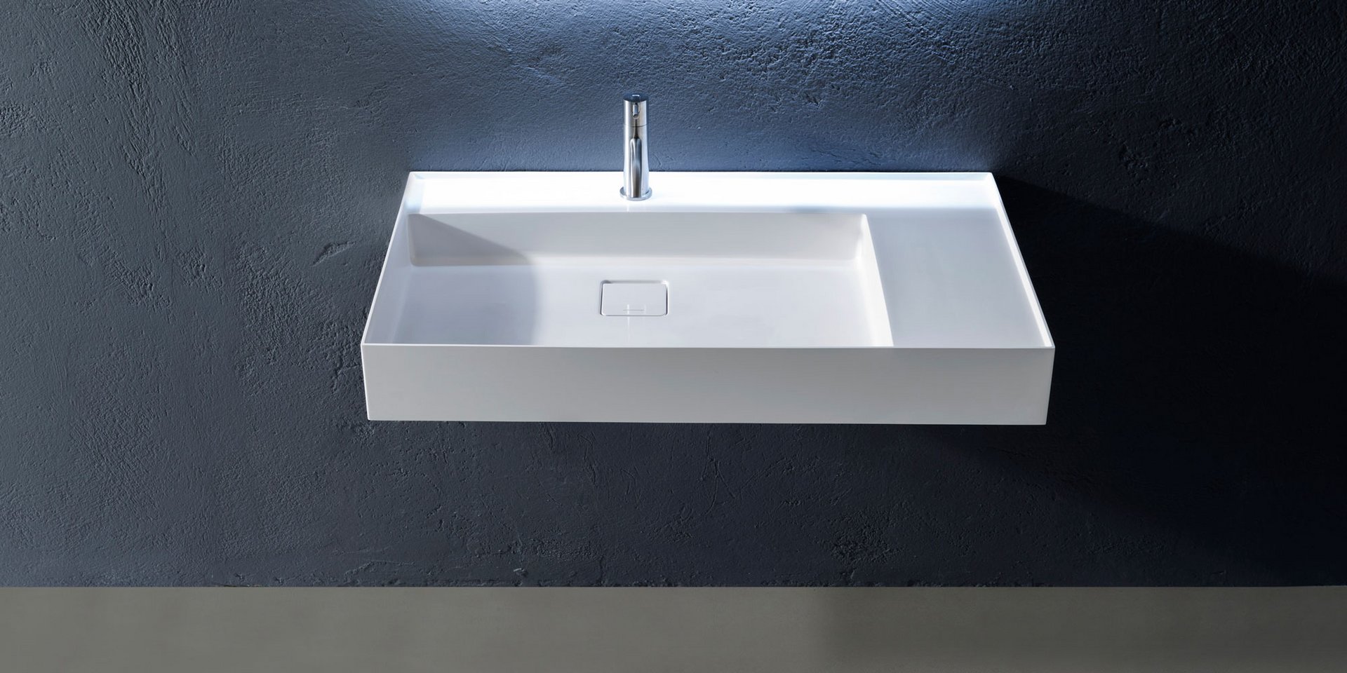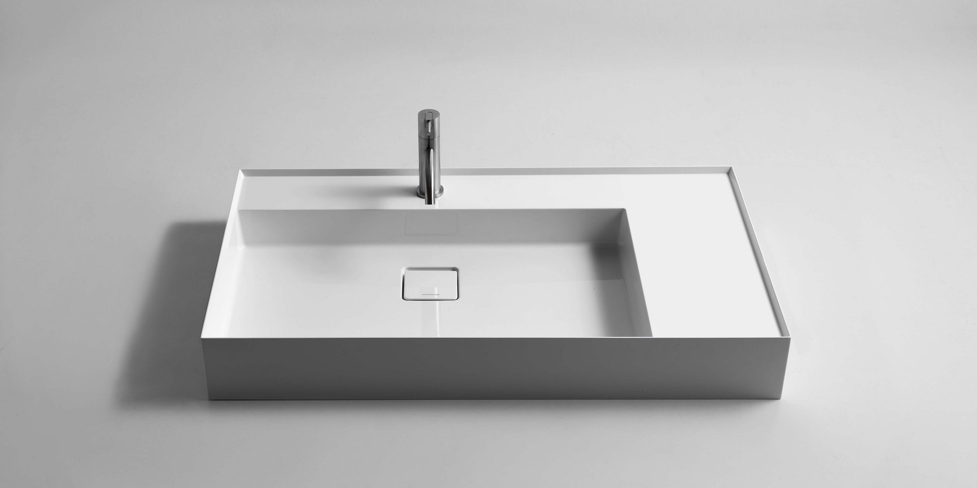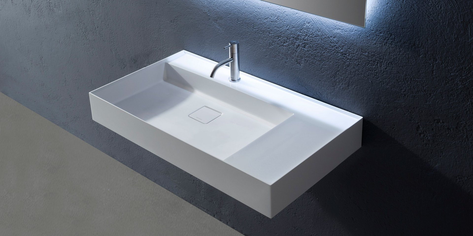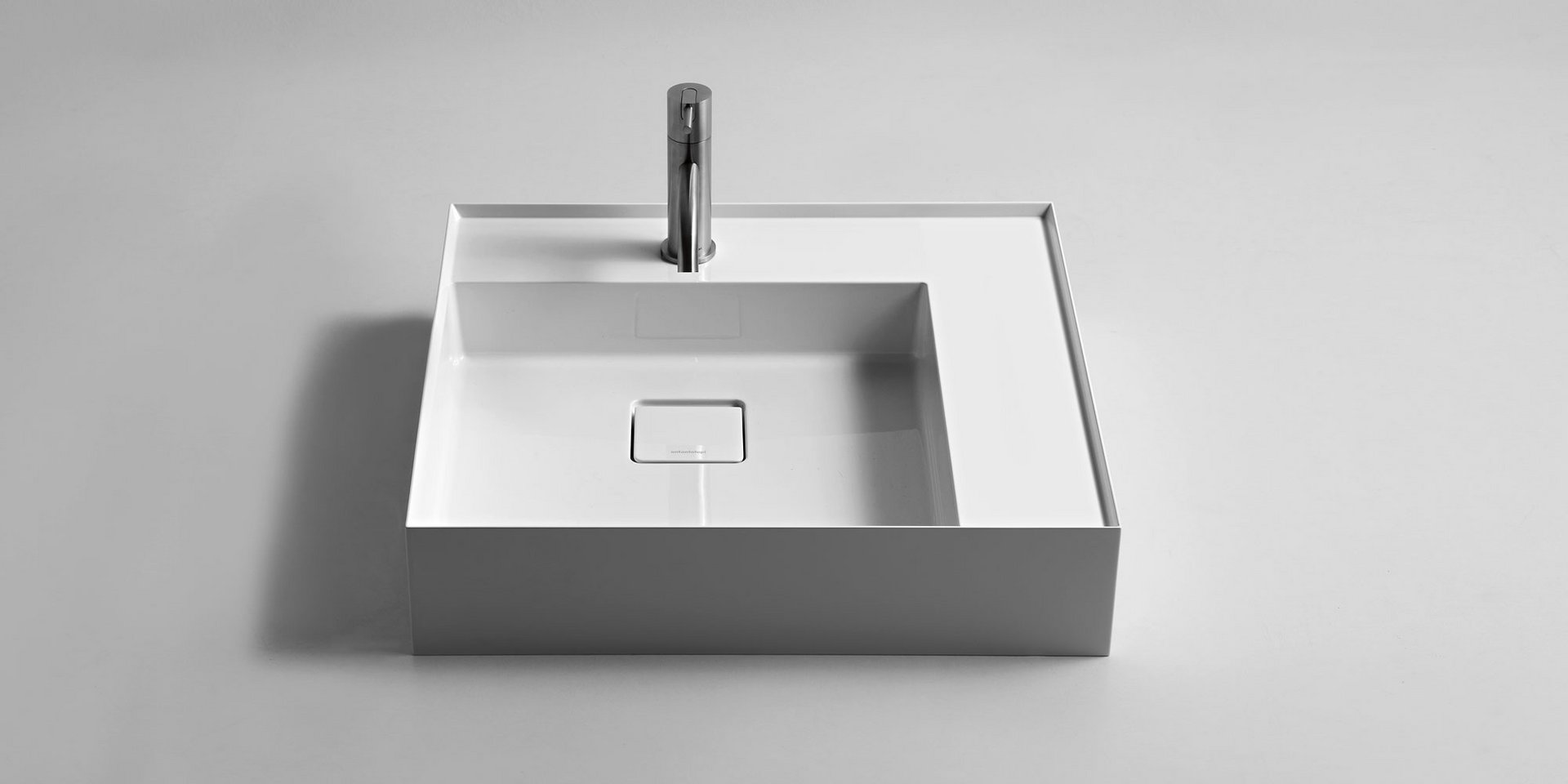 Rectangular top mount or wall mount Ceramilux sink with shelf, complete with drain pipe fitting and open plug.