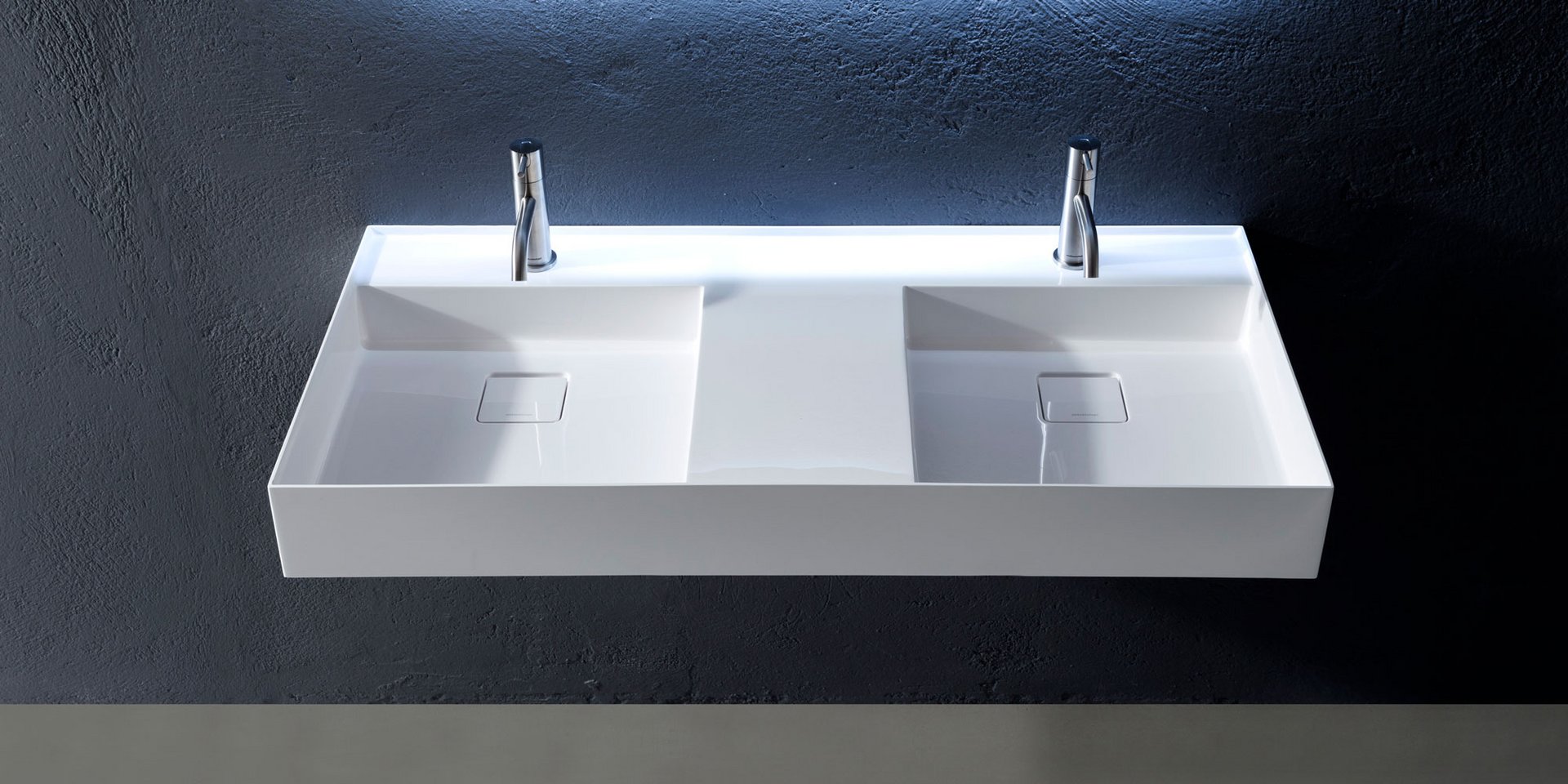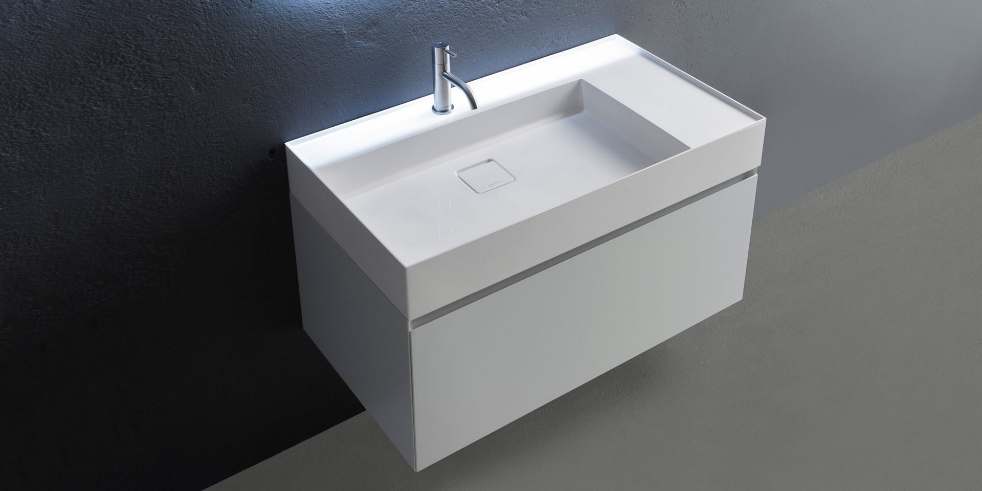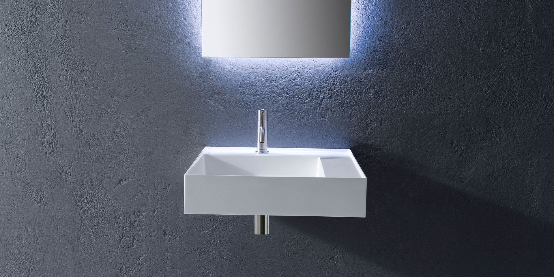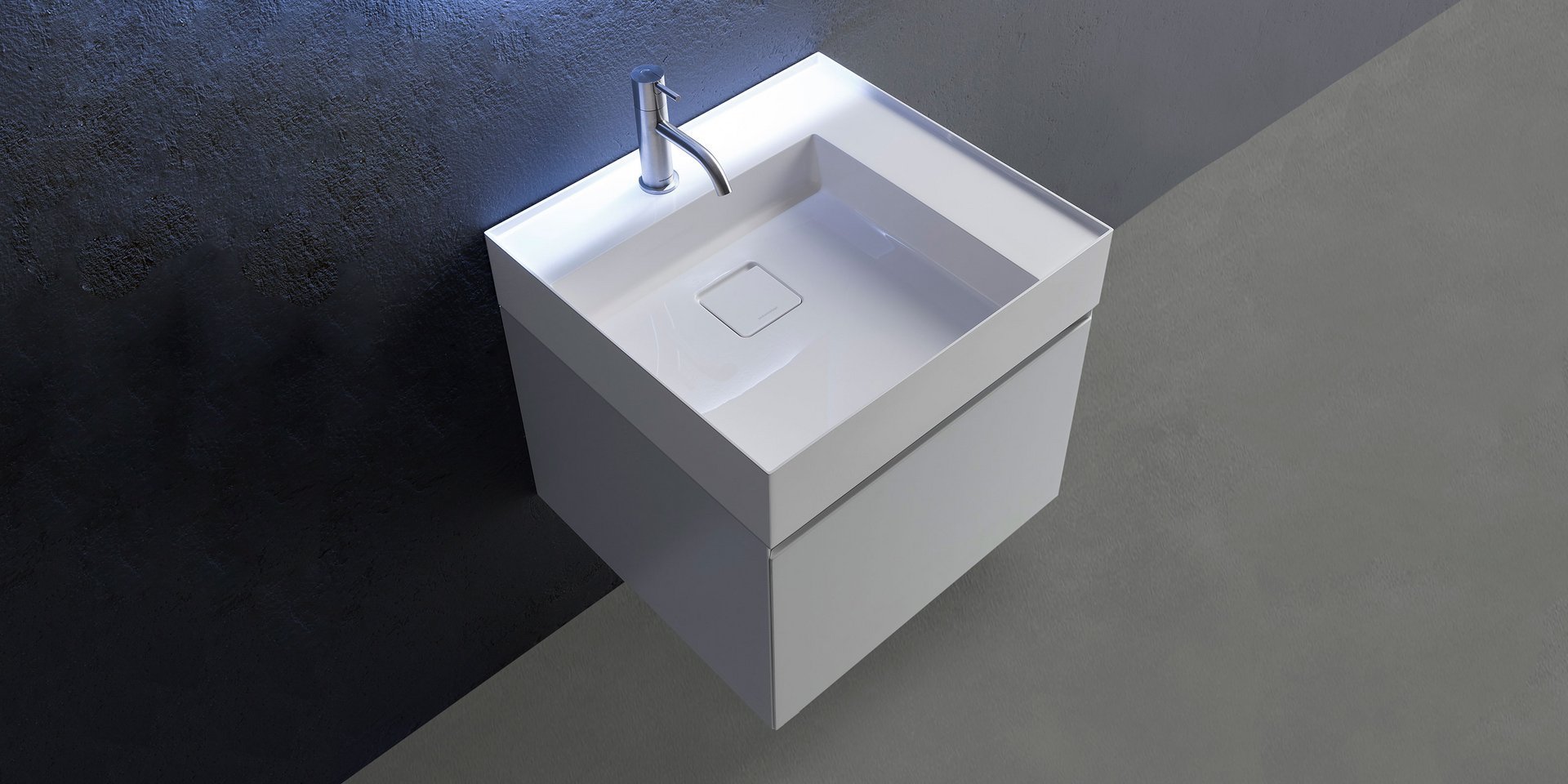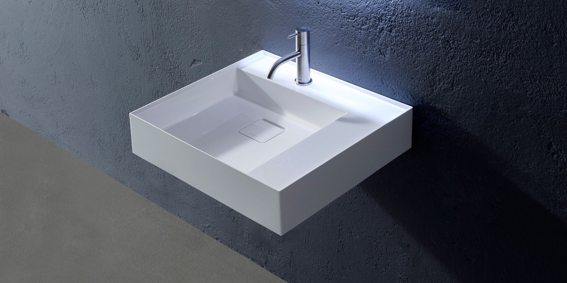 Rectangular top mount or wall mount Ceramilux sink with shelf, complete with drain pipe fitting and open plug.