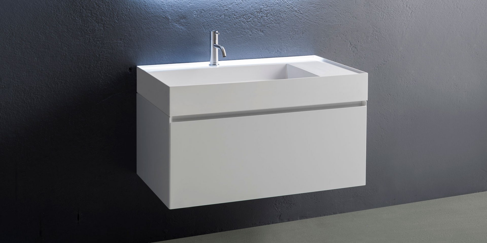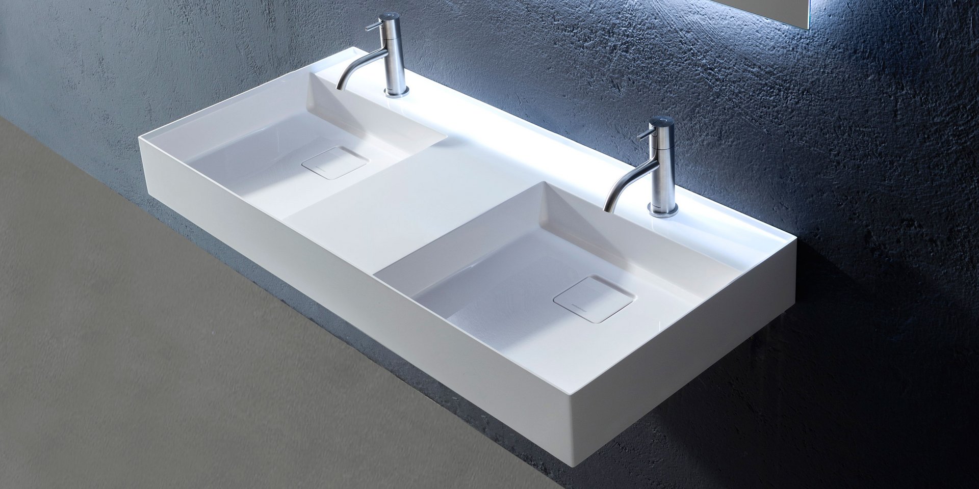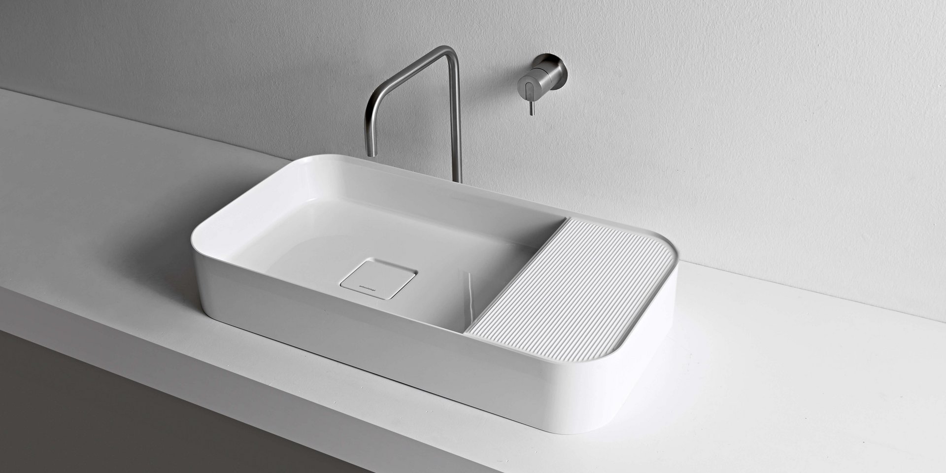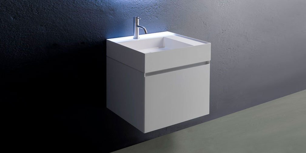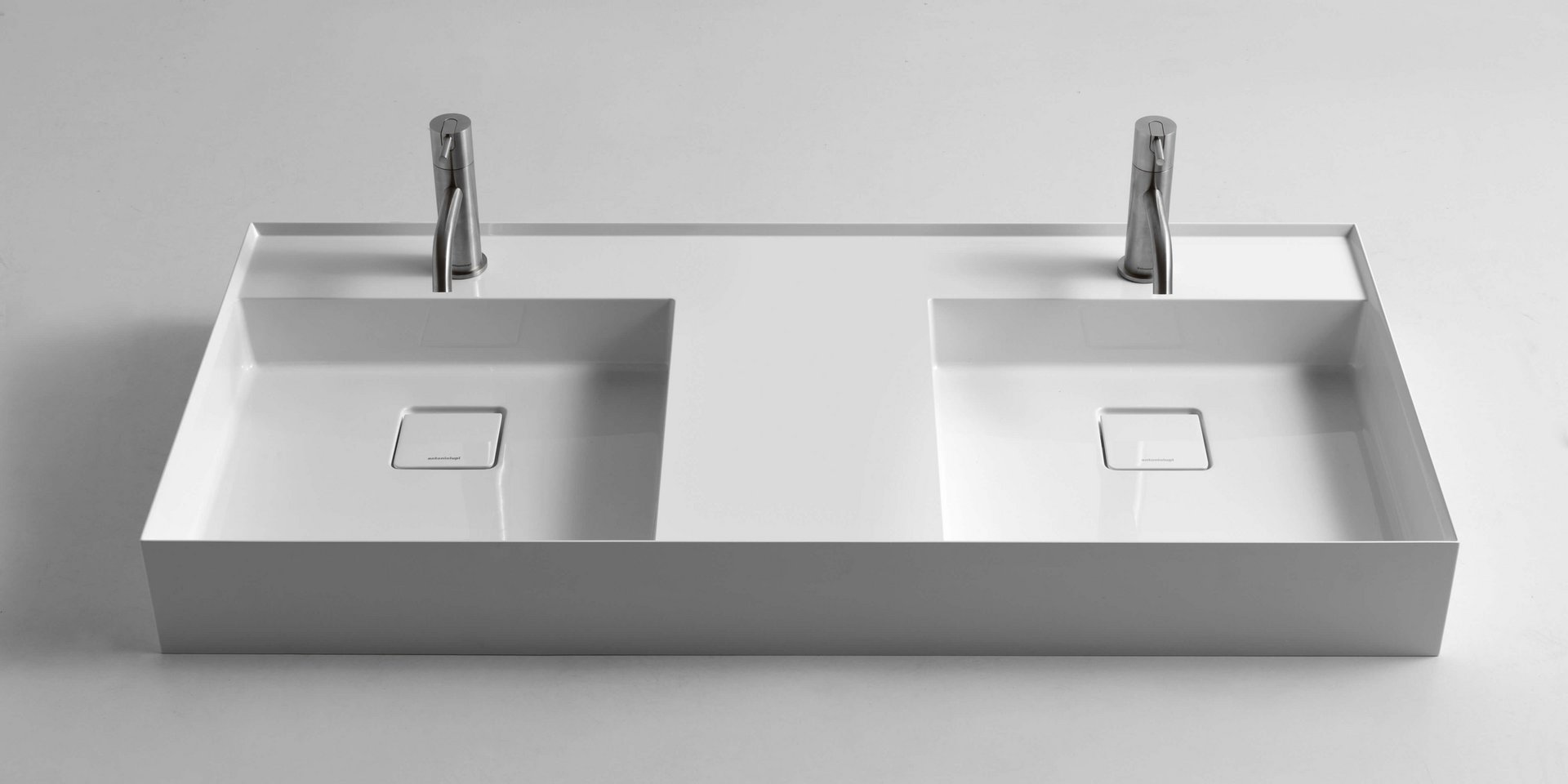 Rectangular top mount or wall mount Ceramilux sink with shelf, complete with drain pipe fitting and open plug.