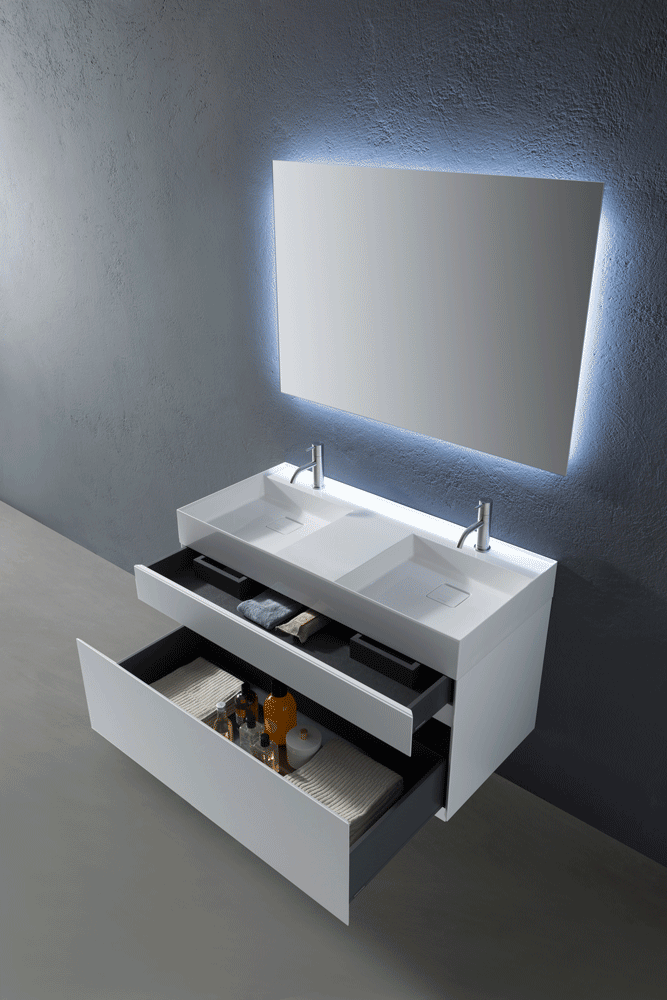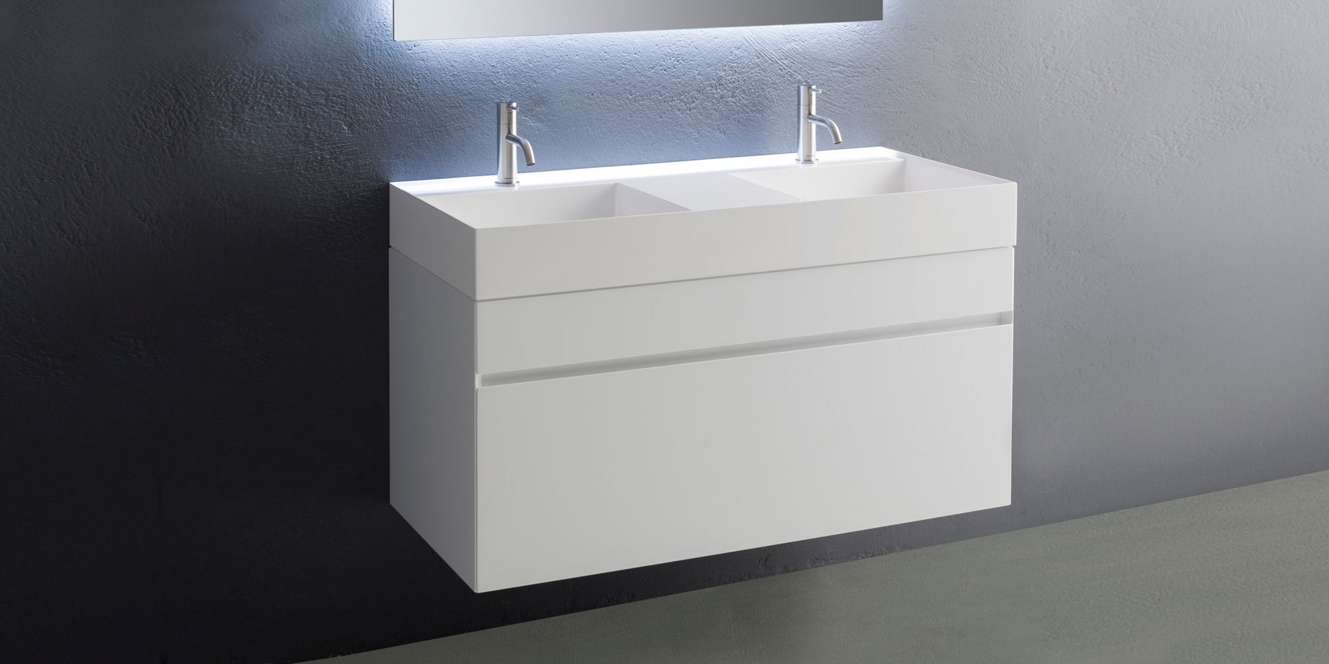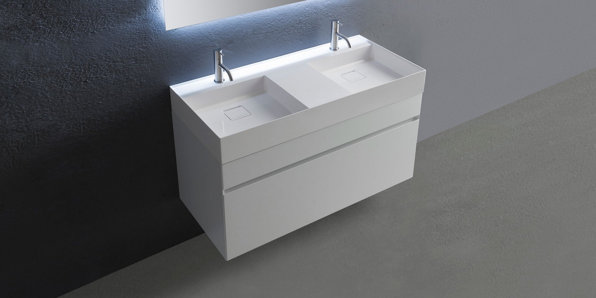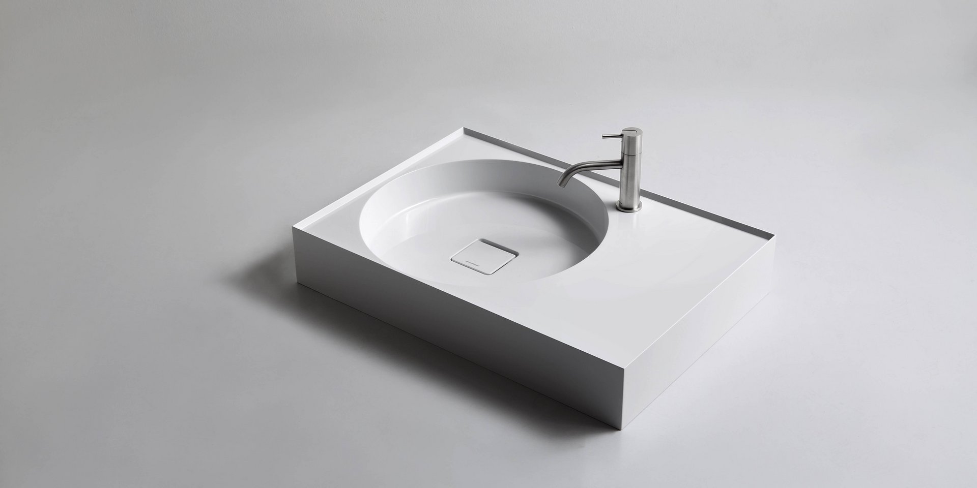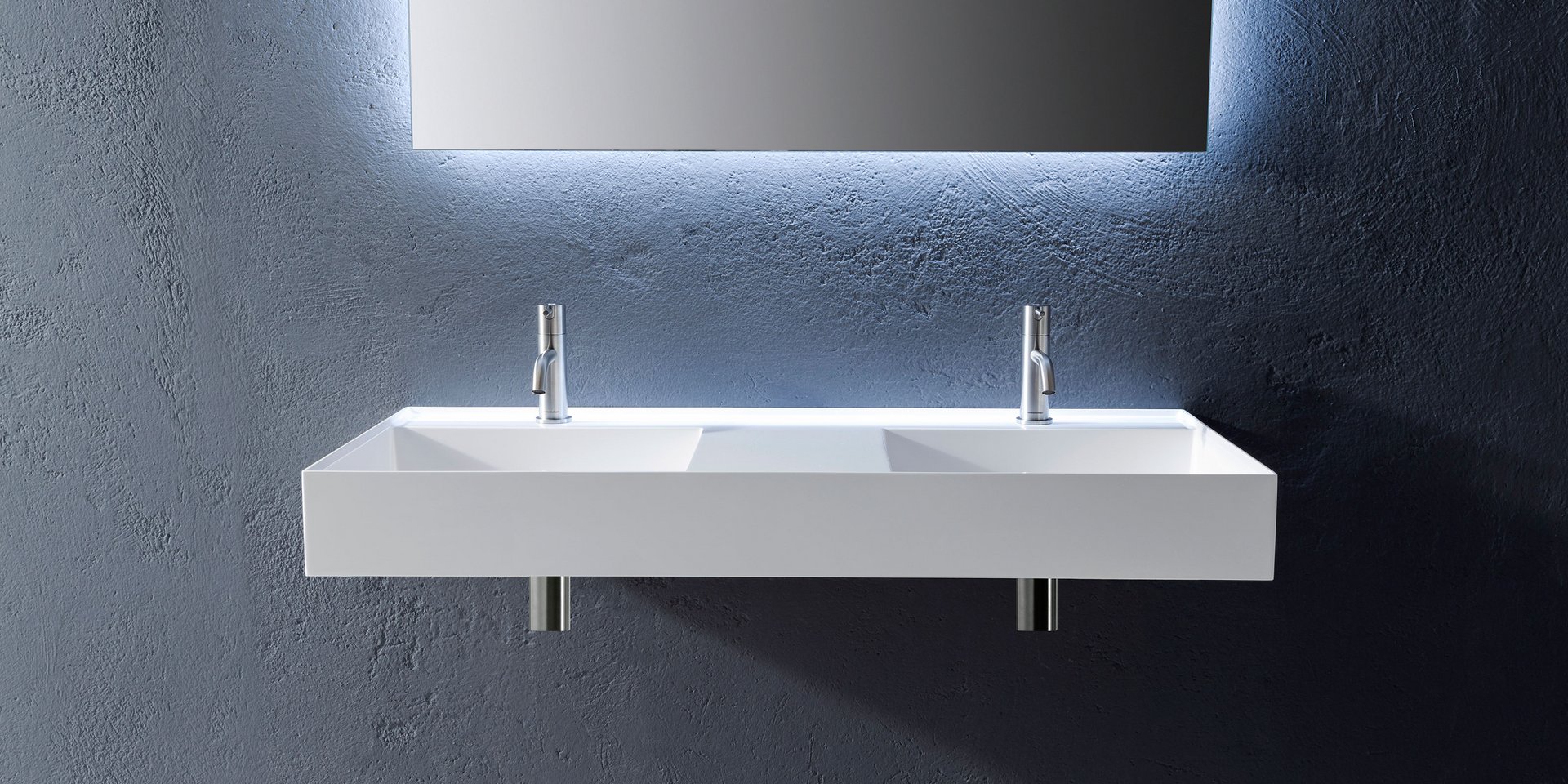 Rectangular top mount or wall mount Ceramilux sink with shelf, complete with drain pipe fitting and open plug.