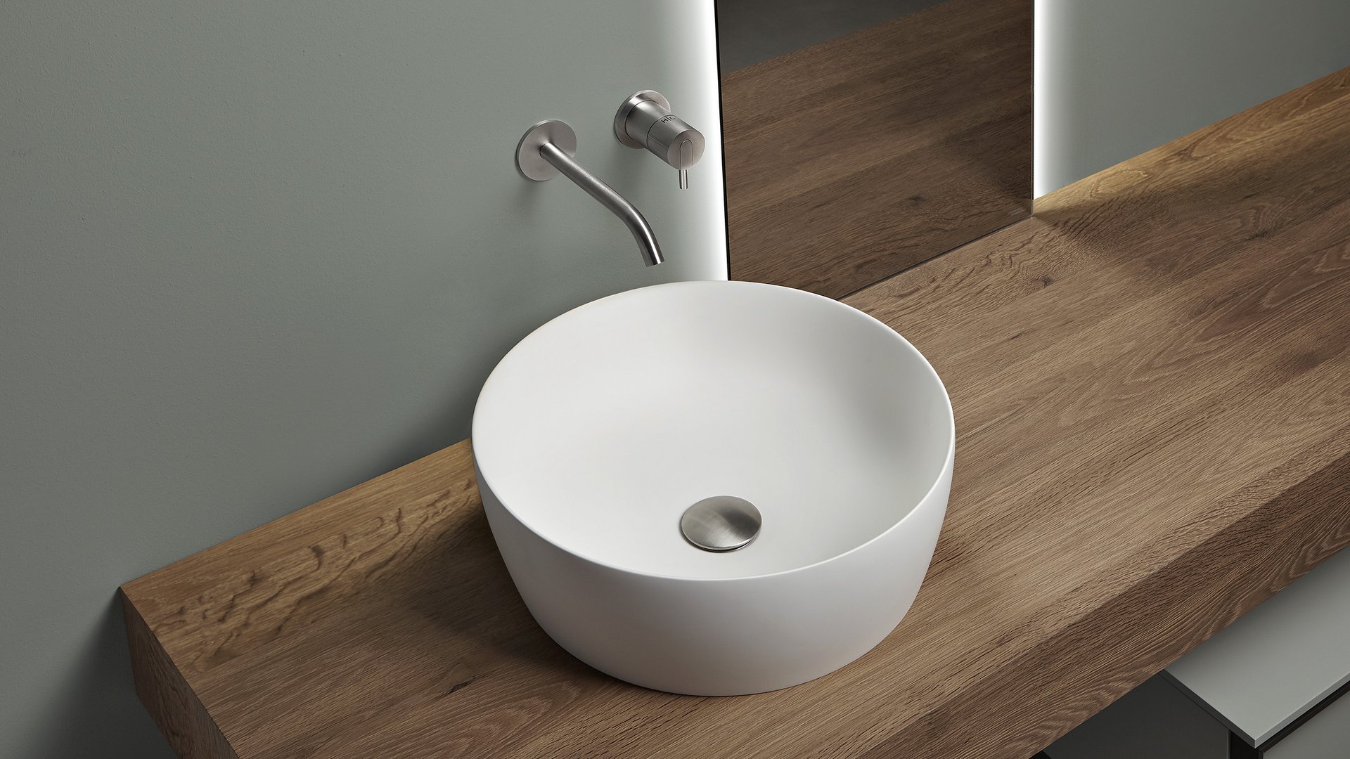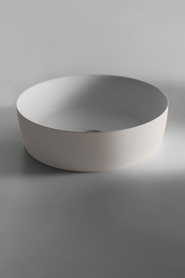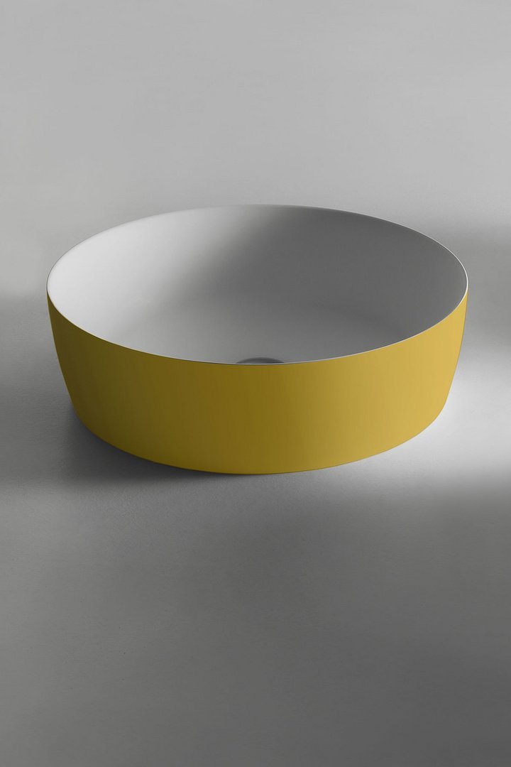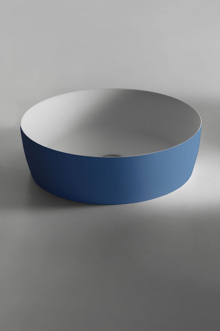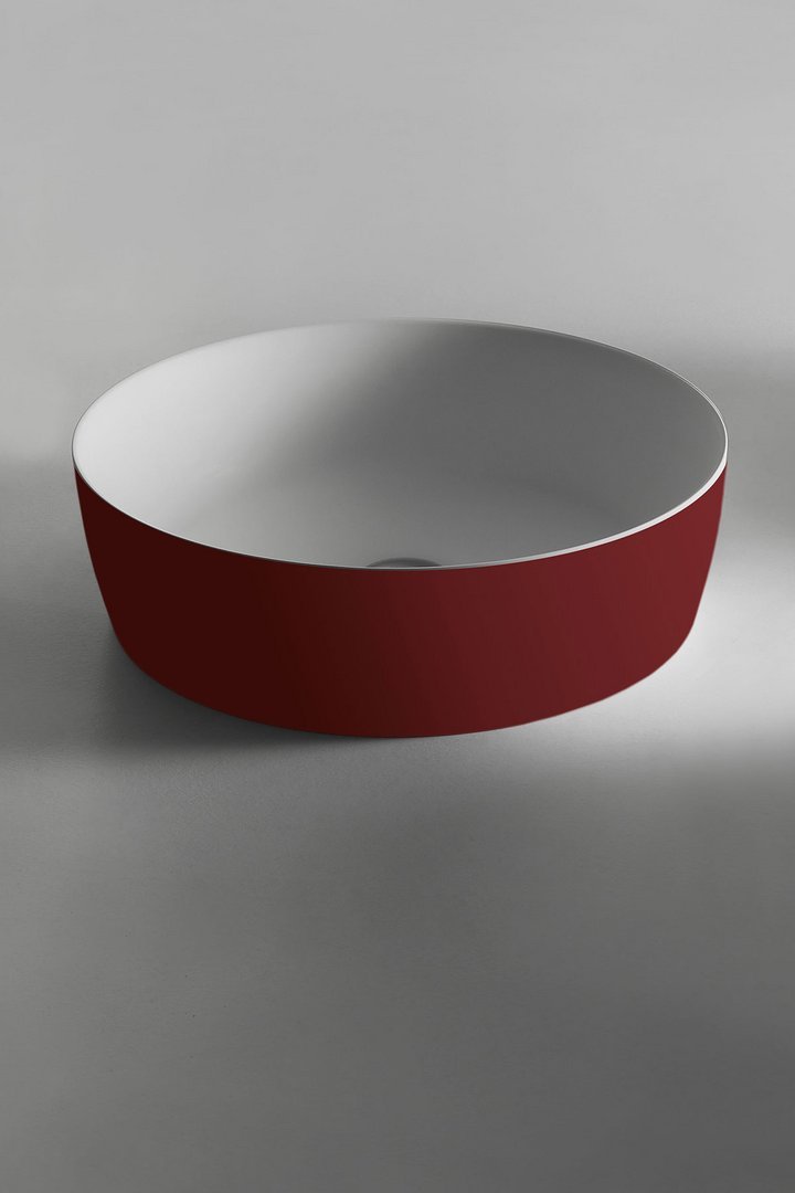 Round top mount Flumood? sink, complete with drain pipe fitting and open plug, that can be lacquered externally.