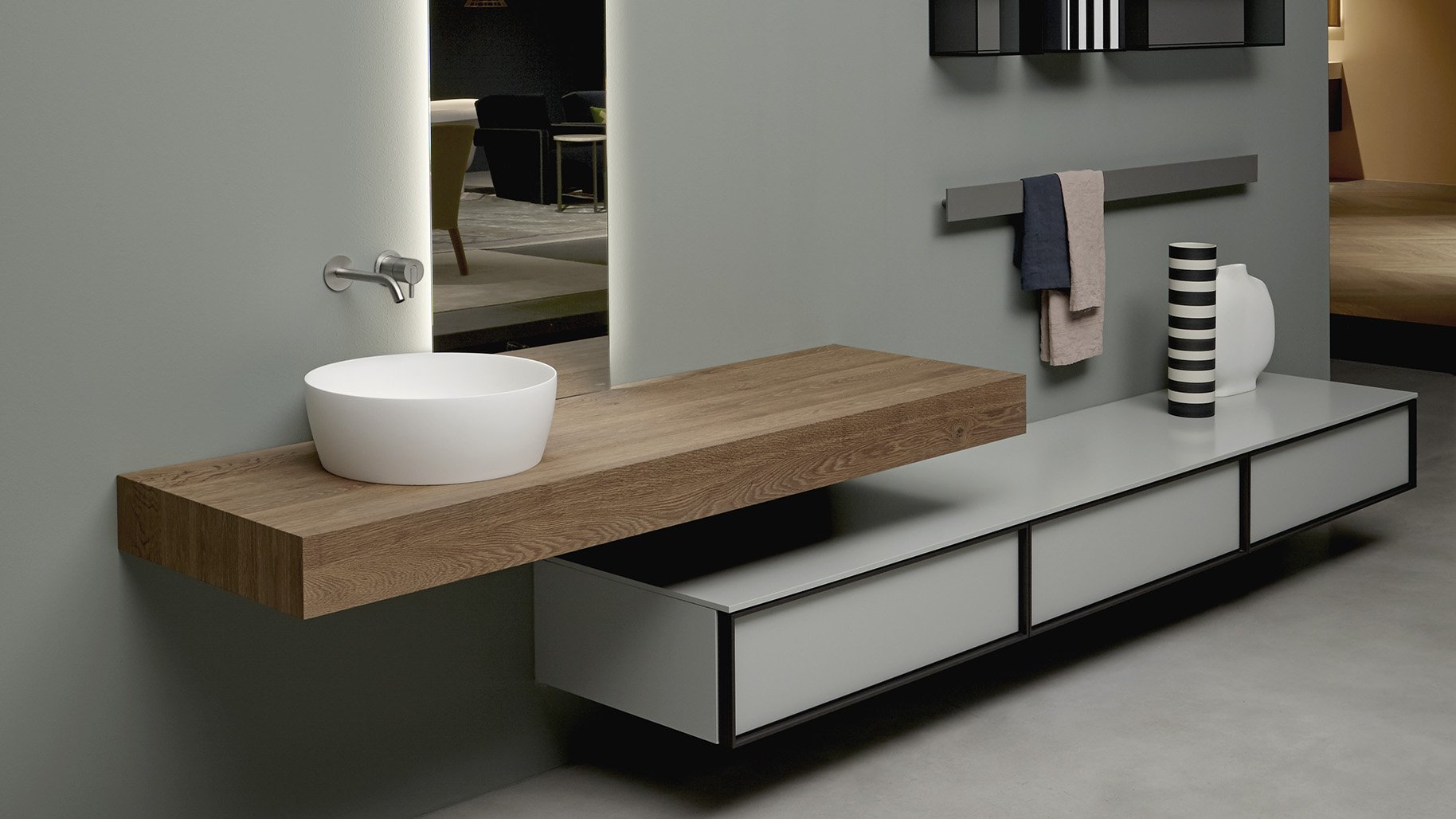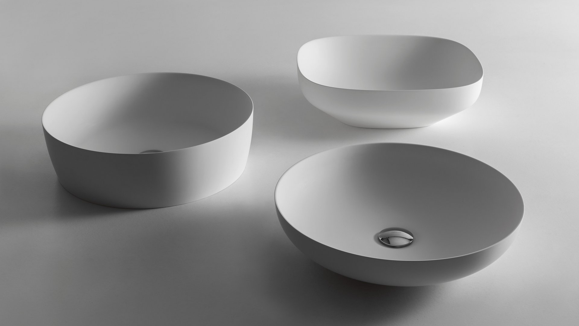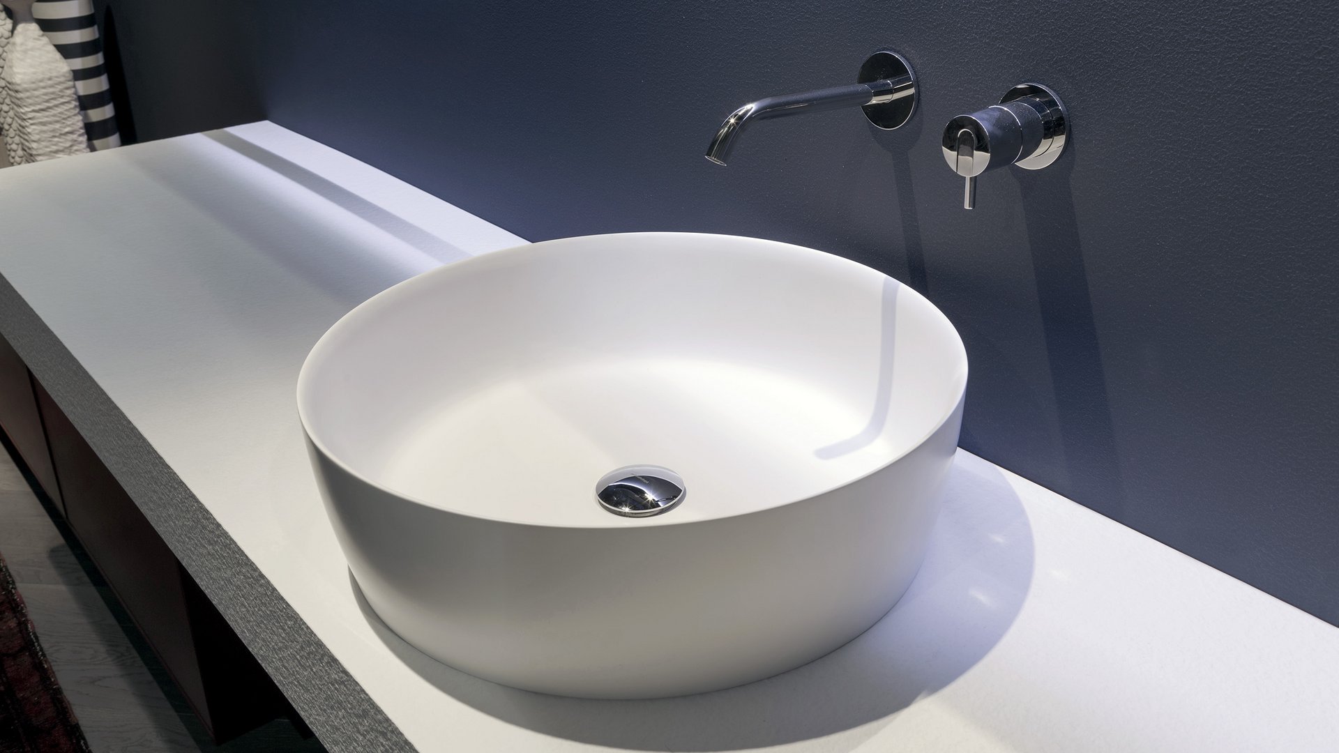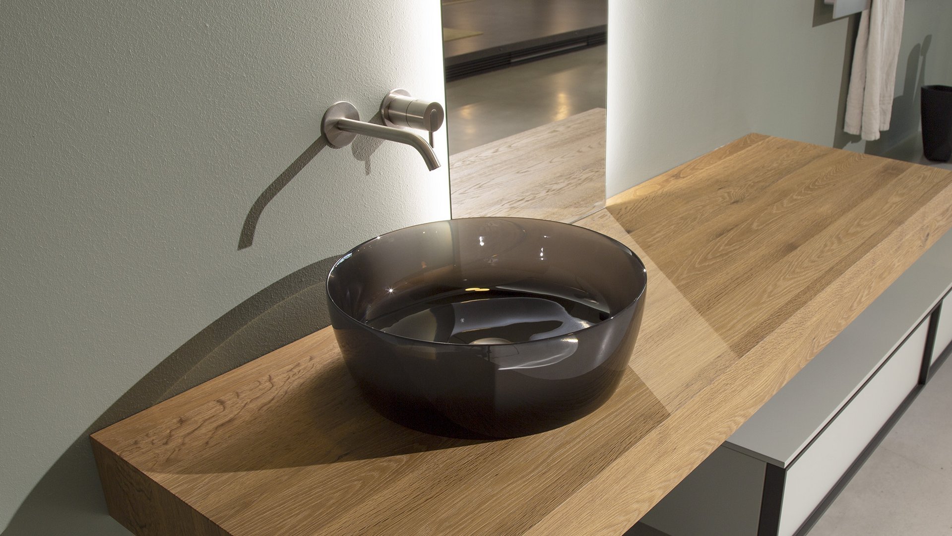 Round top mount Flumood? sink, complete with drain pipe fitting and open plug, that can be lacquered externally.