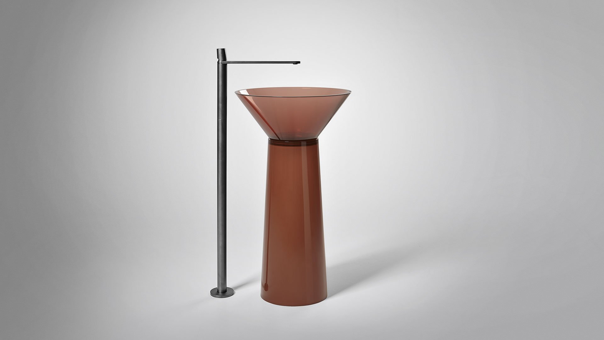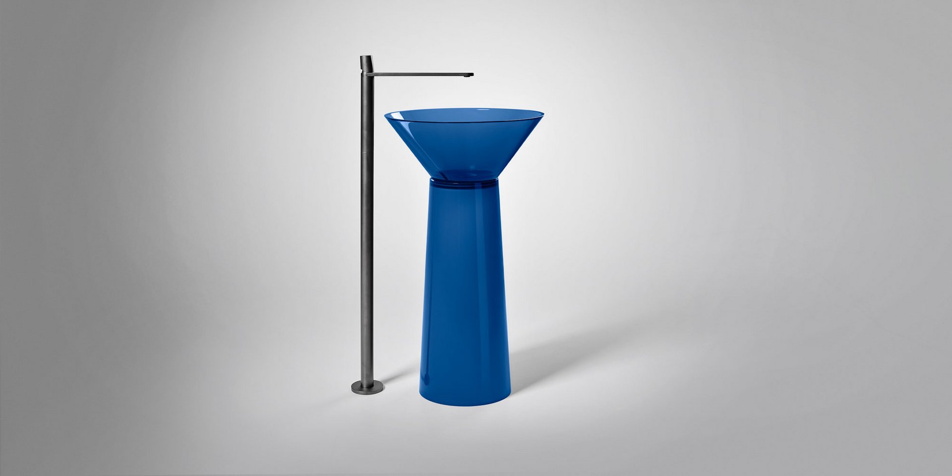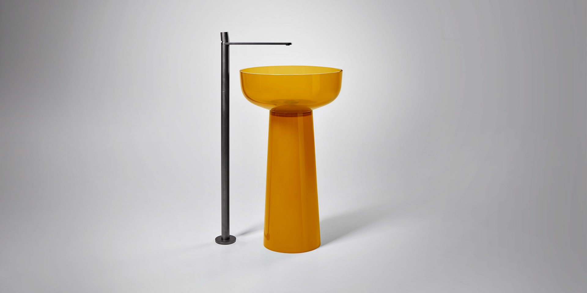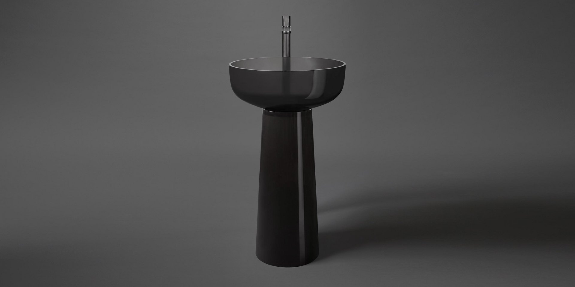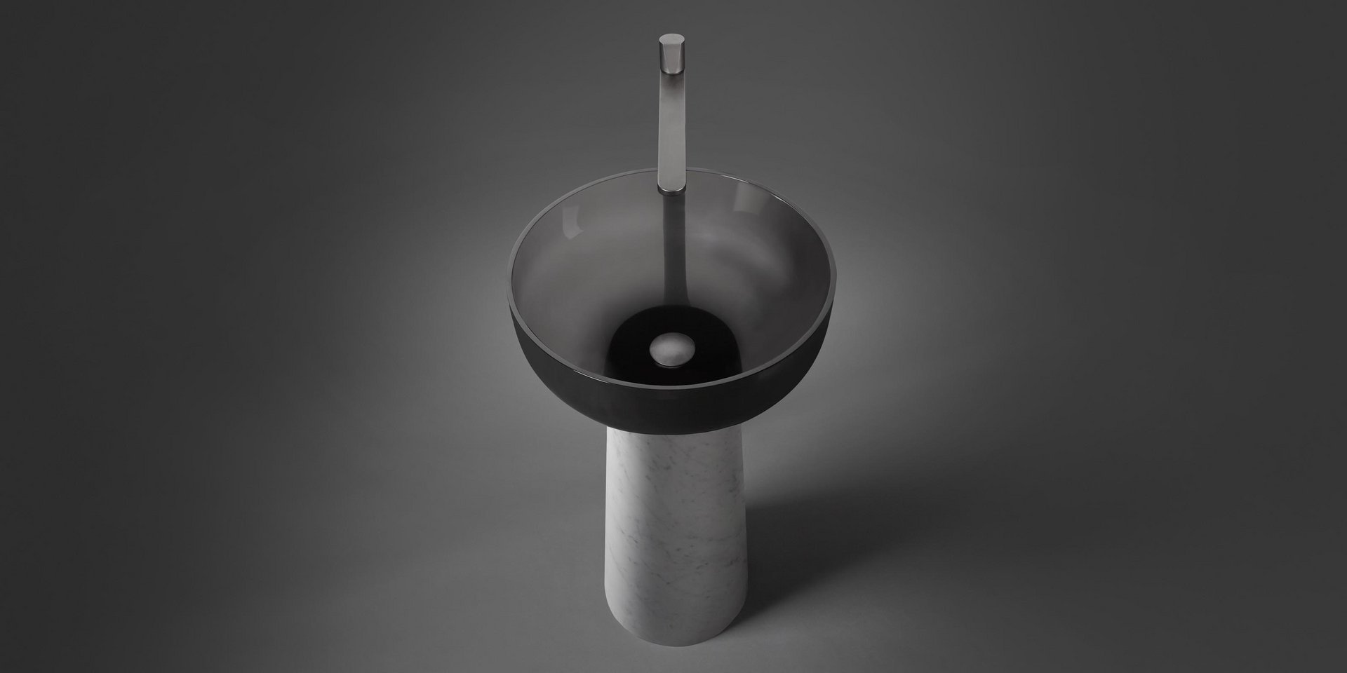 Round sink in Cristalmood, avialble in various colors, top mount or to be combined with pedestal Art. ALBUME20 complete with drain pipe fitting and open plug