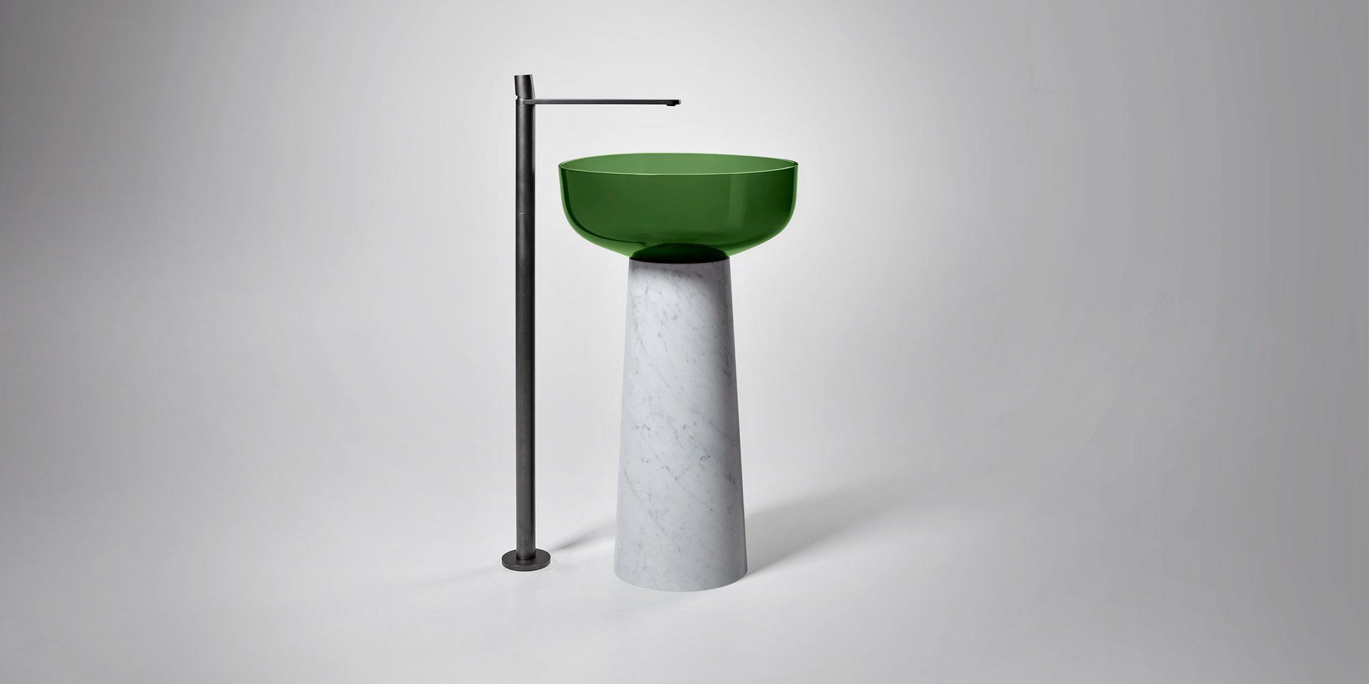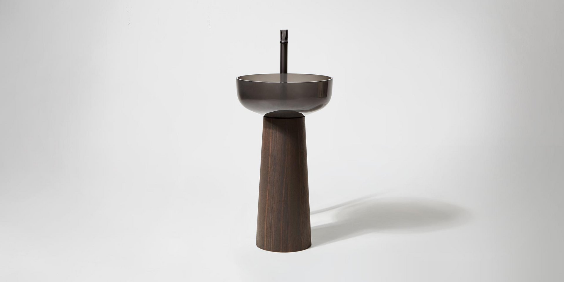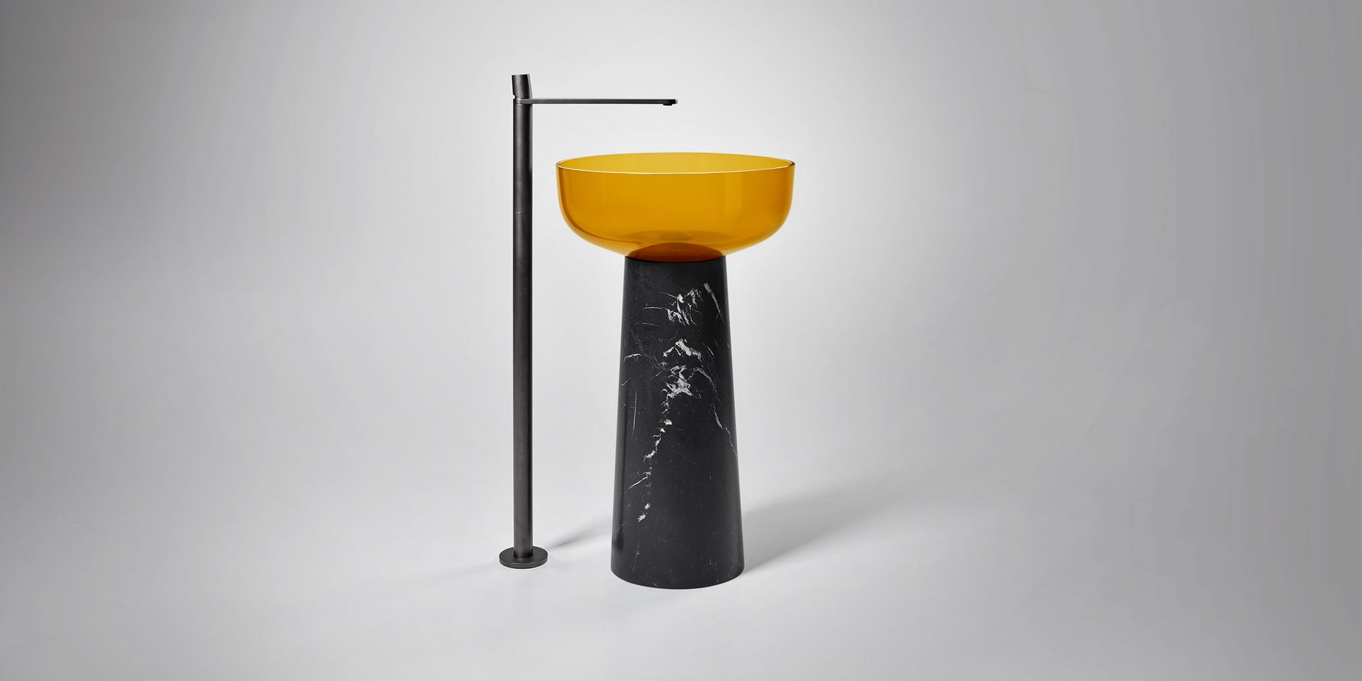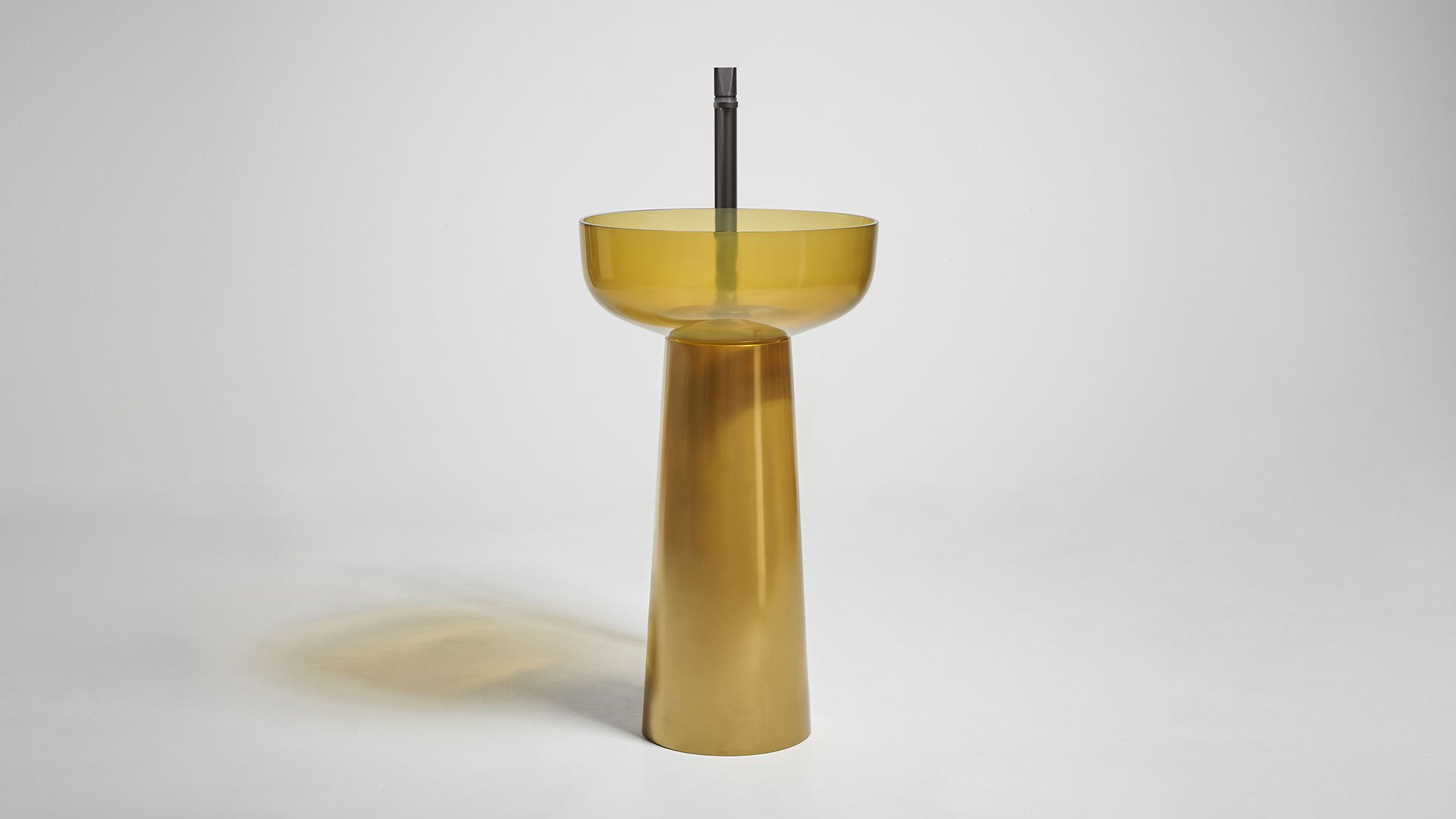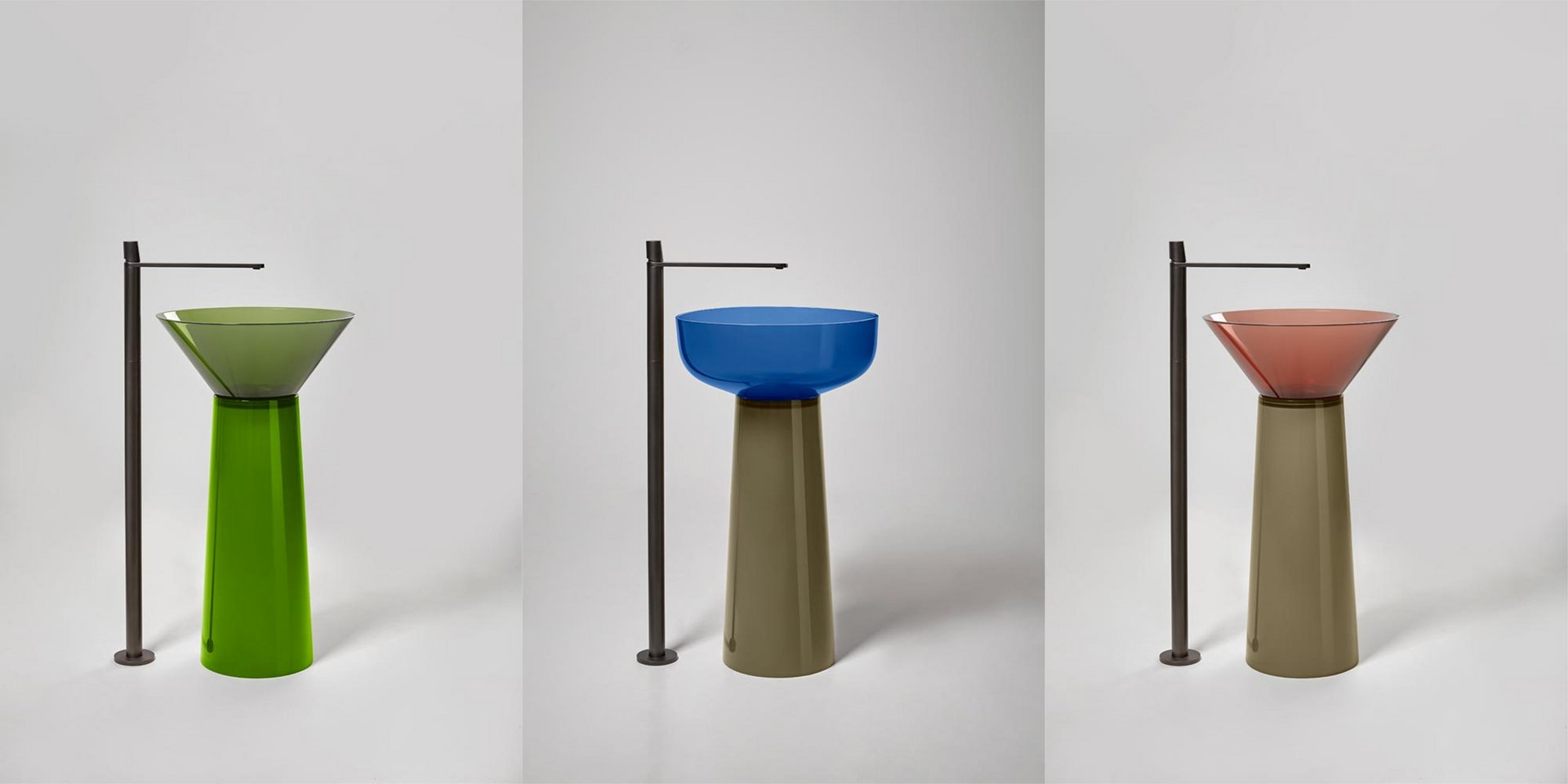 Round sink in Cristalmood, avialble in various colors, top mount or to be combined with pedestal Art. ALBUME20 complete with drain pipe fitting and open plug