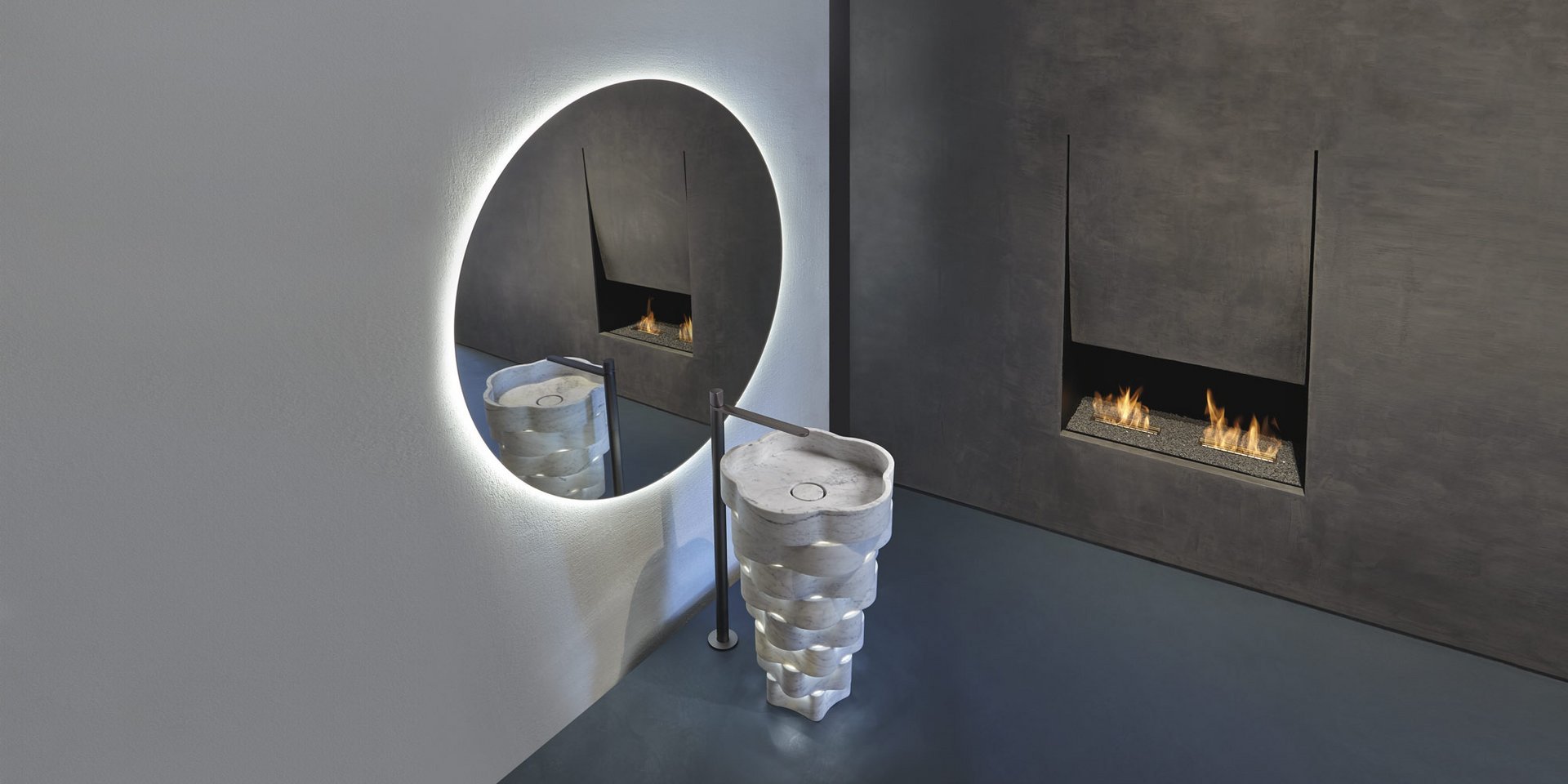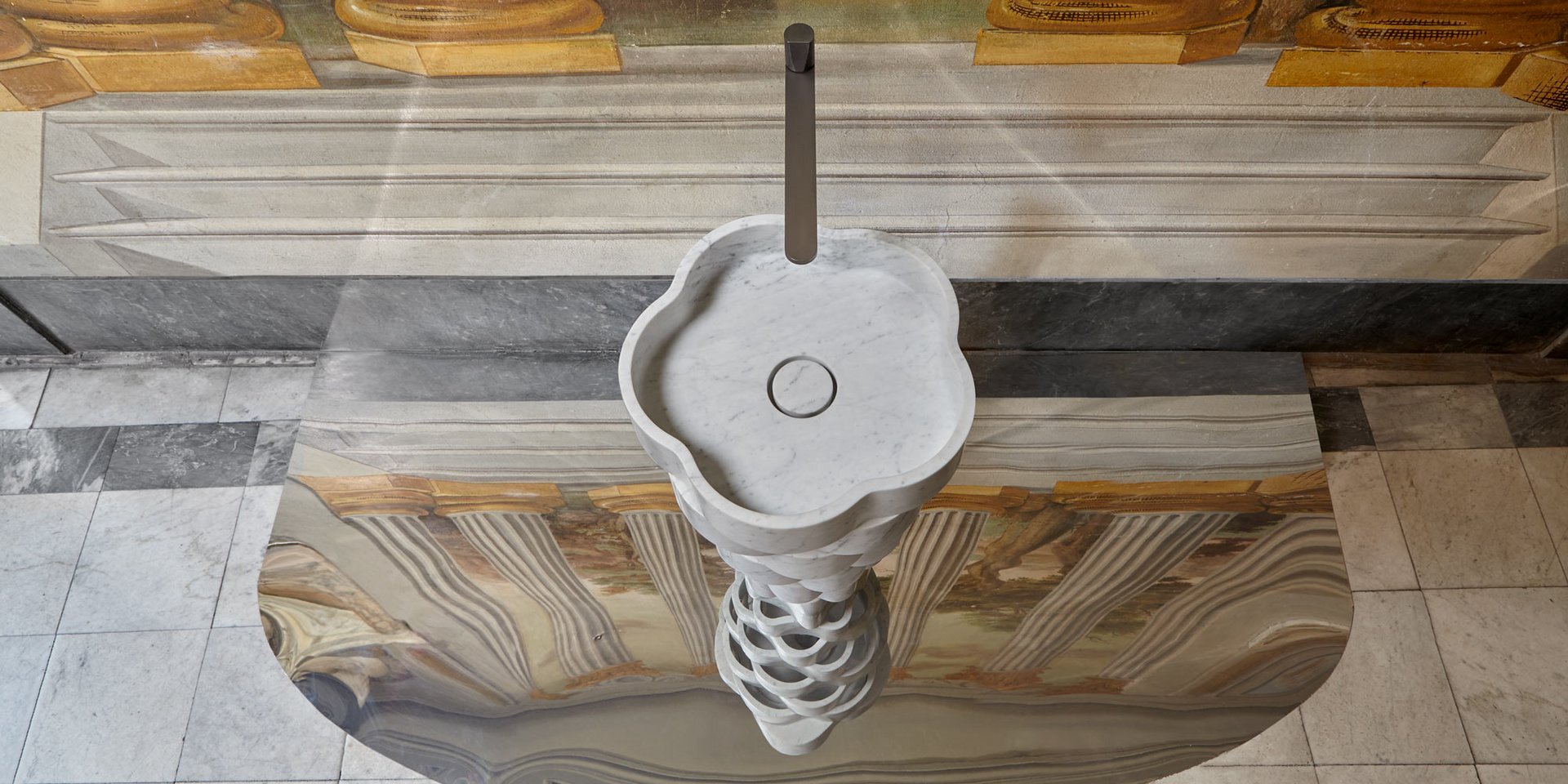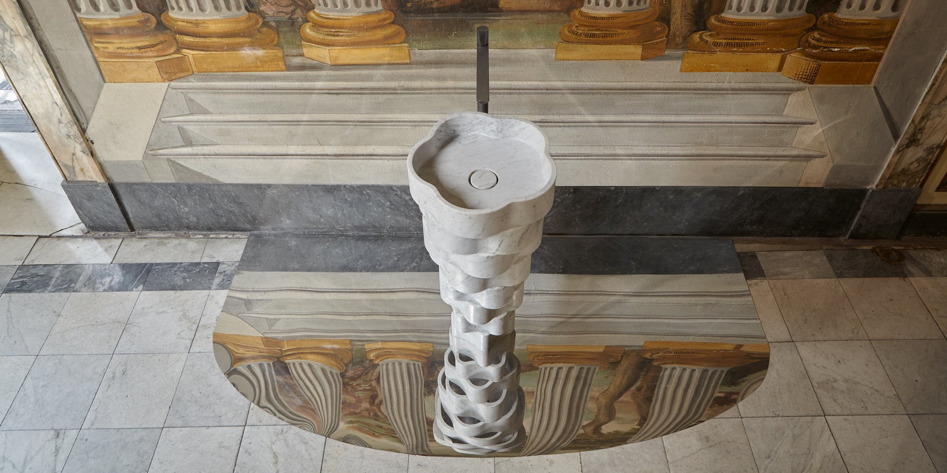 Freestanding stone sink with floor drainage complete with open plug, siphon and rigid hose.