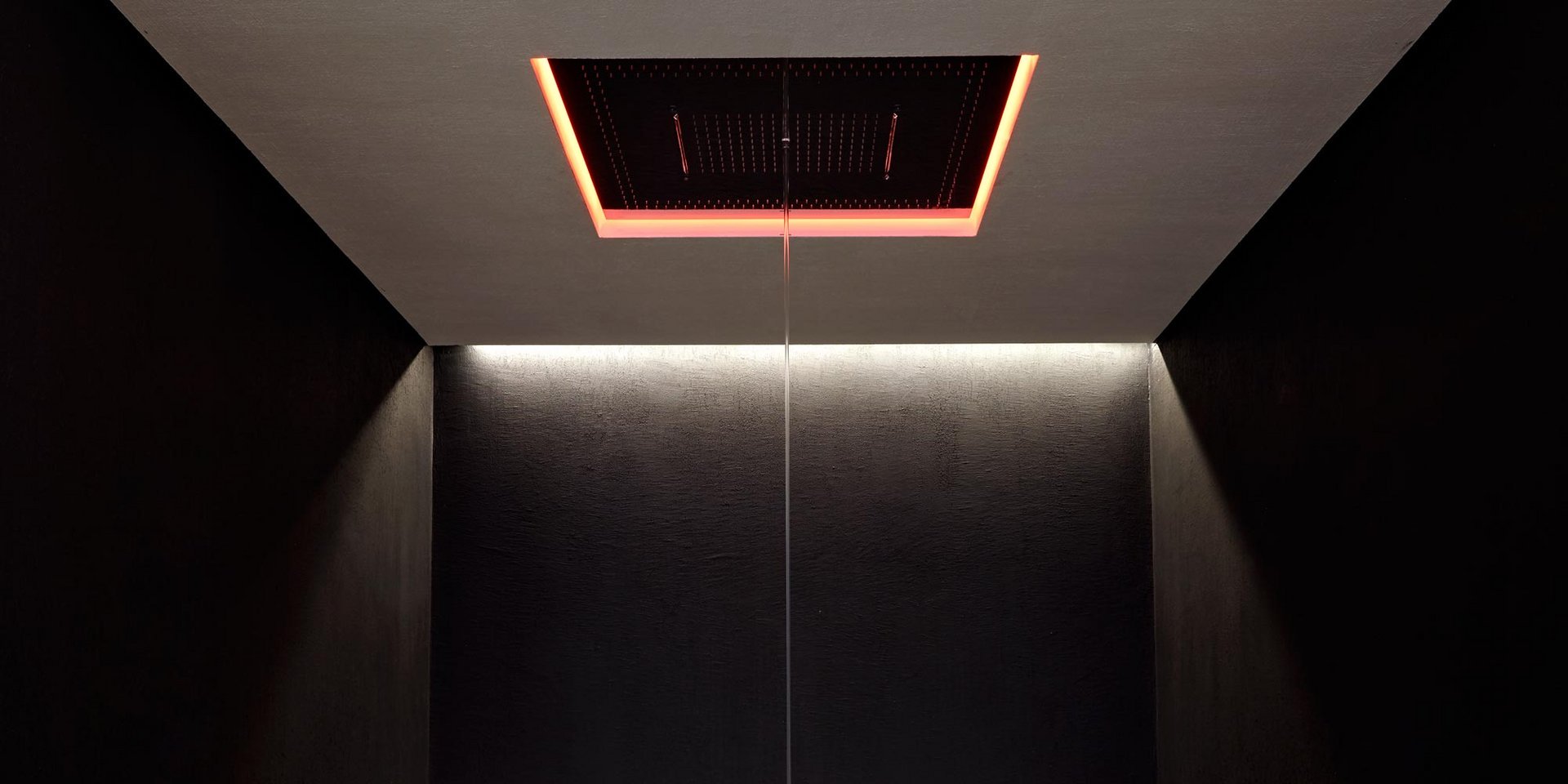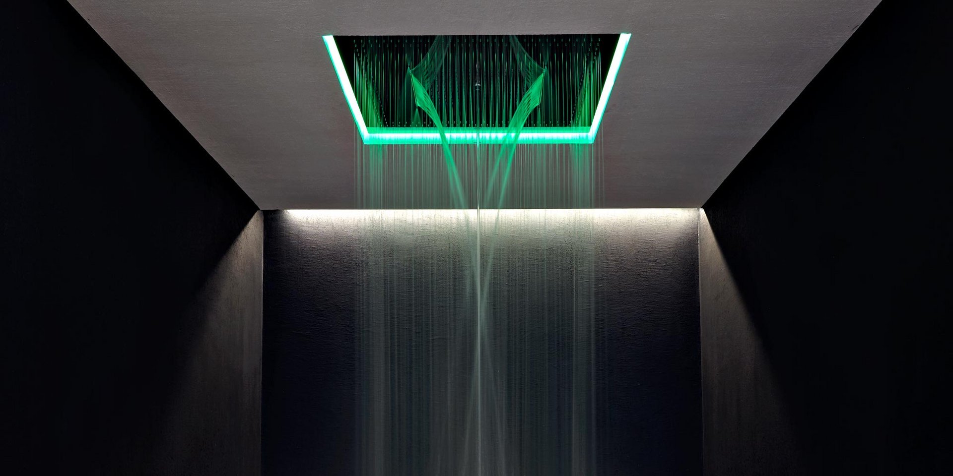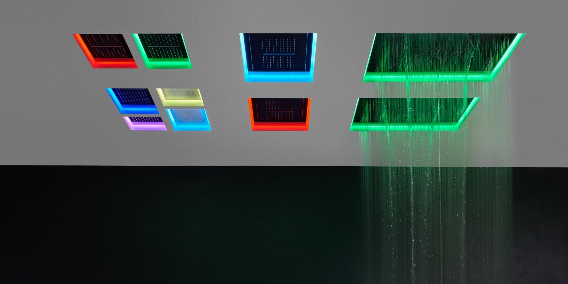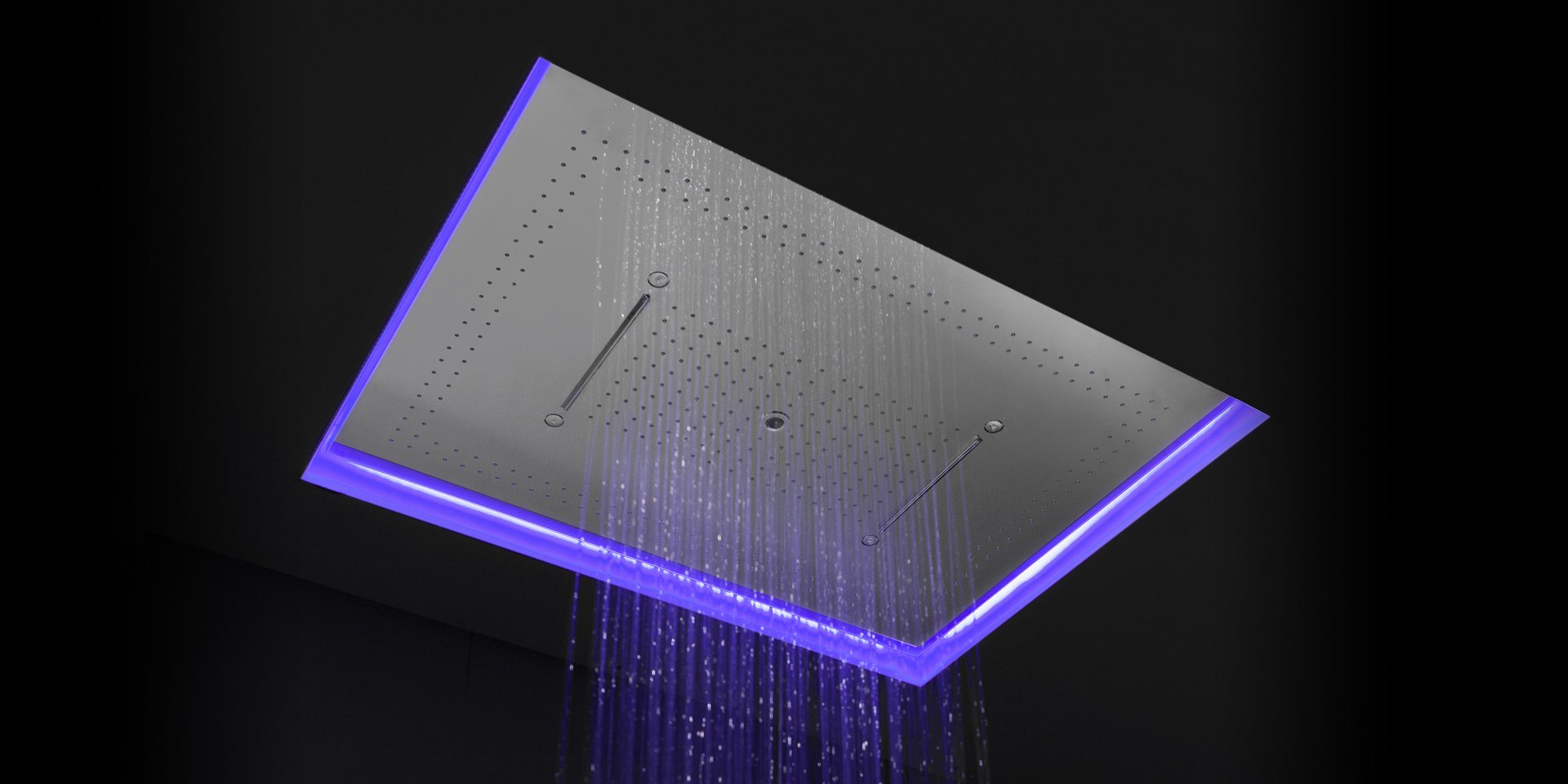 Encased showerhead in polished stainless steel AISI 304 with double waterfall, hard center jet and nebulizers, available in various finishes with possible led rgb lighting complete with waterproof remote control.