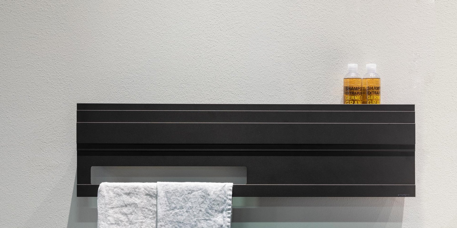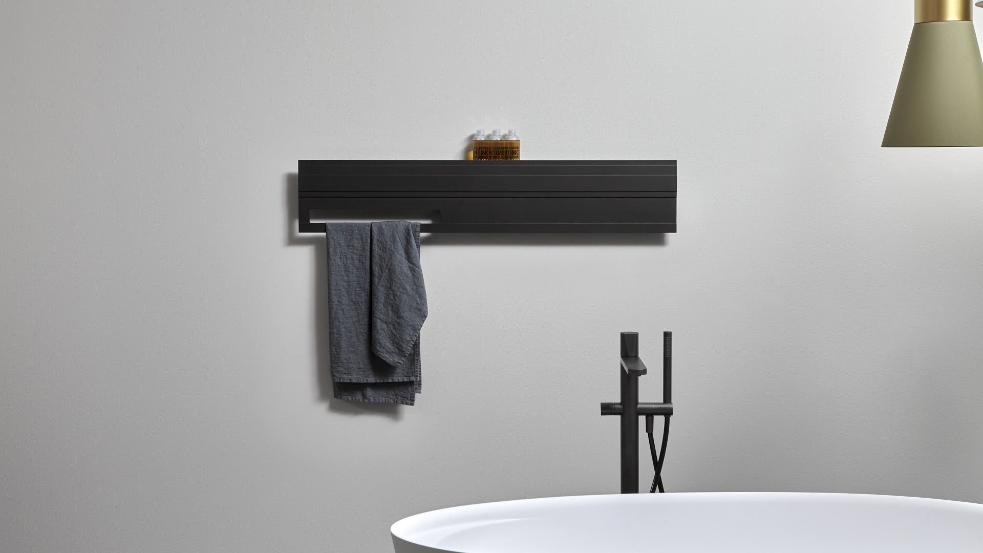 Horizontal aluminium designer radiator, electric version, complete with towel holder and programmable thermostat, Brown or lacquered embossed as per our colour chart.