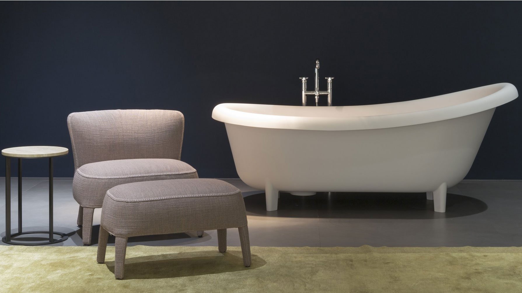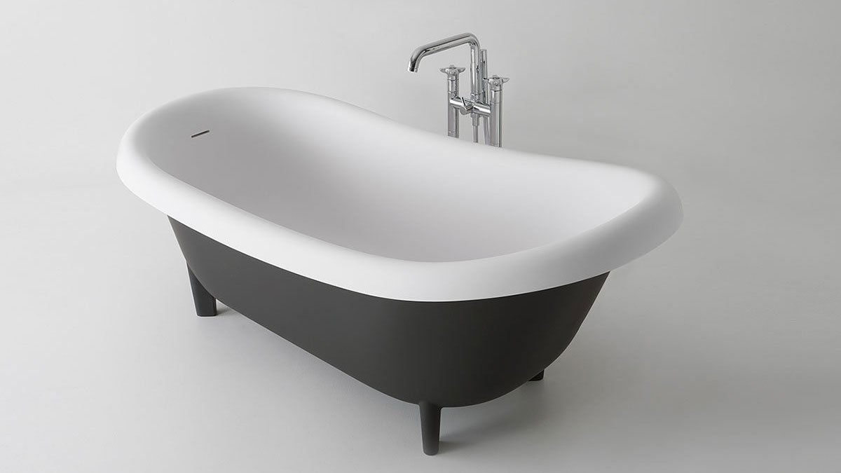 Oval biobased Cristalplant bathtub with feet, complete with drain and pressure plug, siphon and flexible hose, that can be lacquered externally.