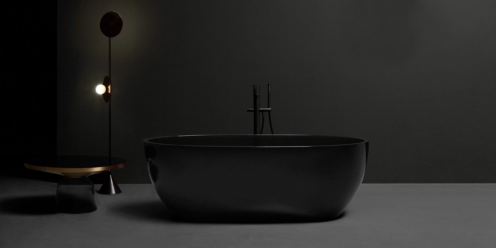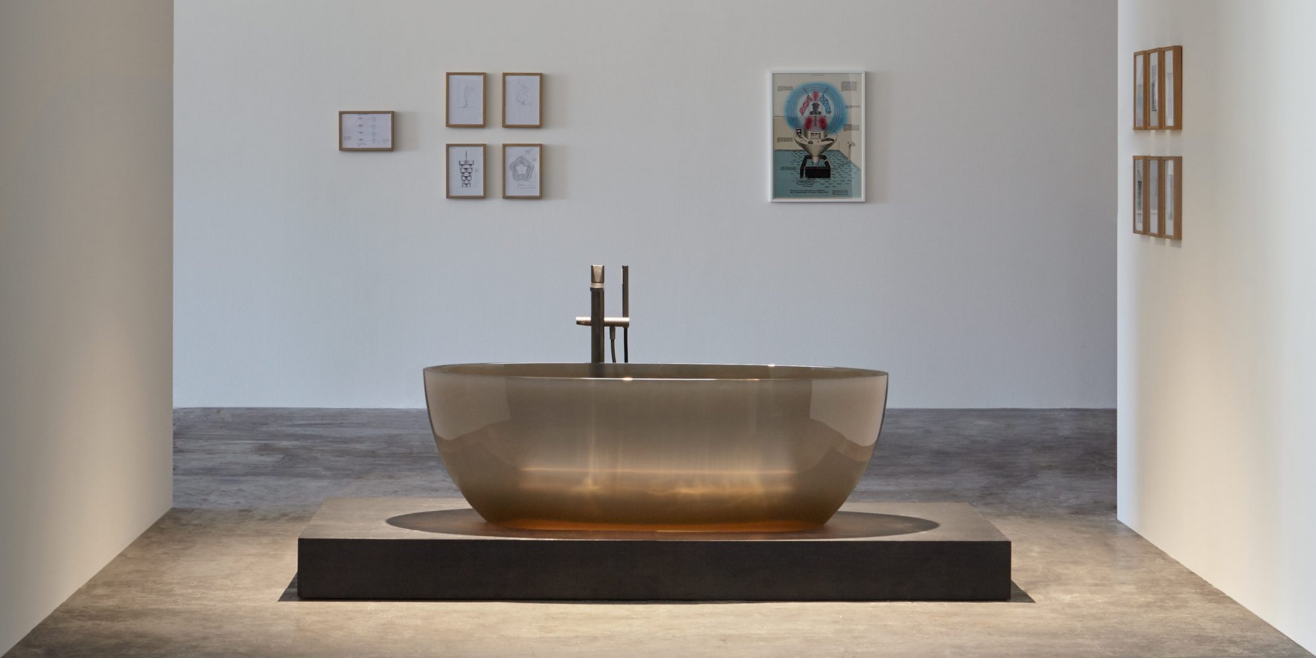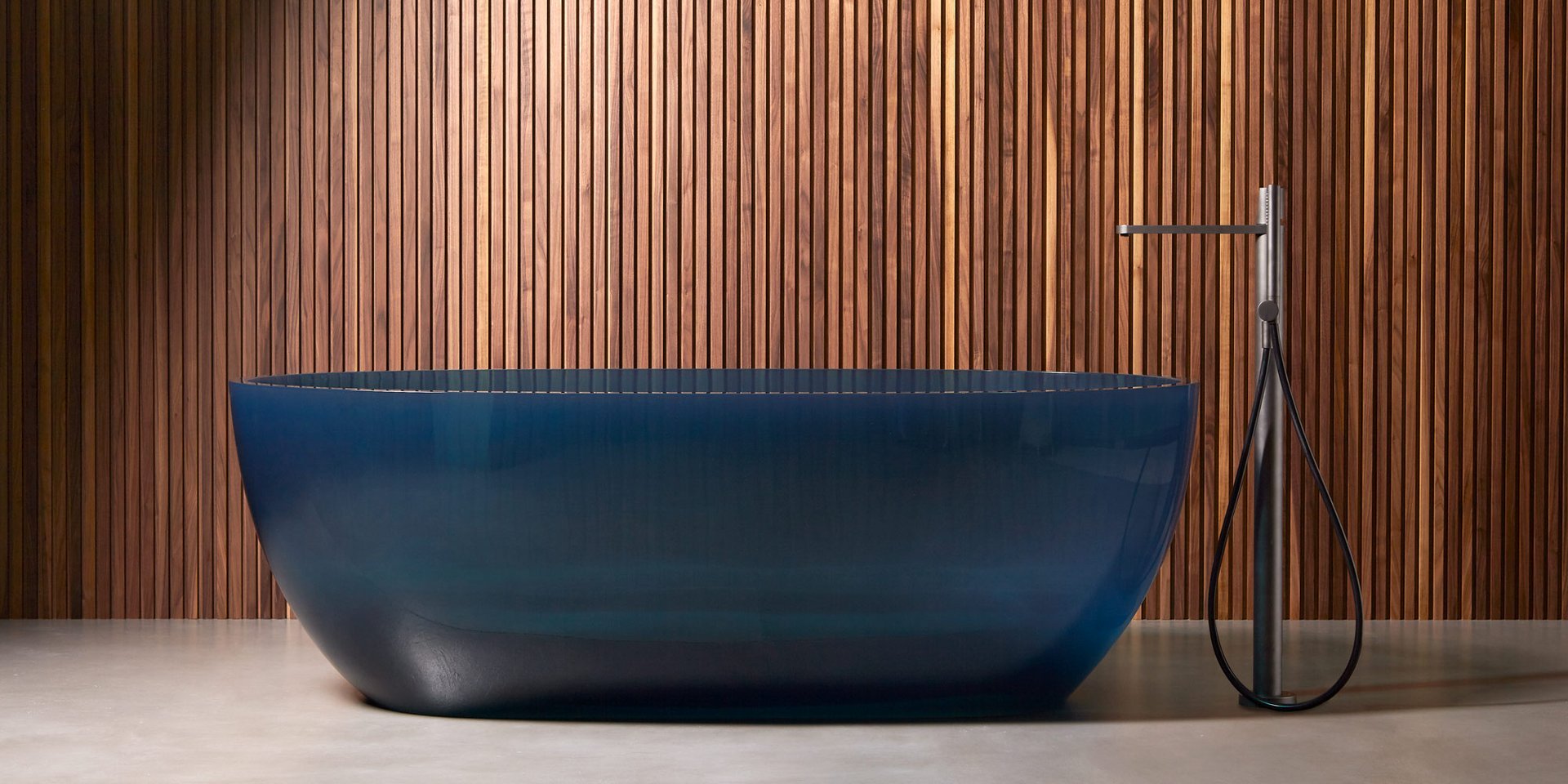 Oval Cristalmood? bathtub complete with drain pipe fitting and pressure plug, siphon and flexible hose.