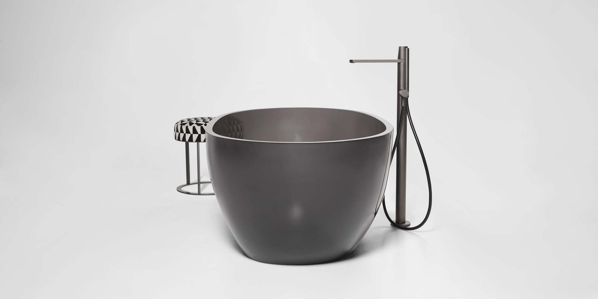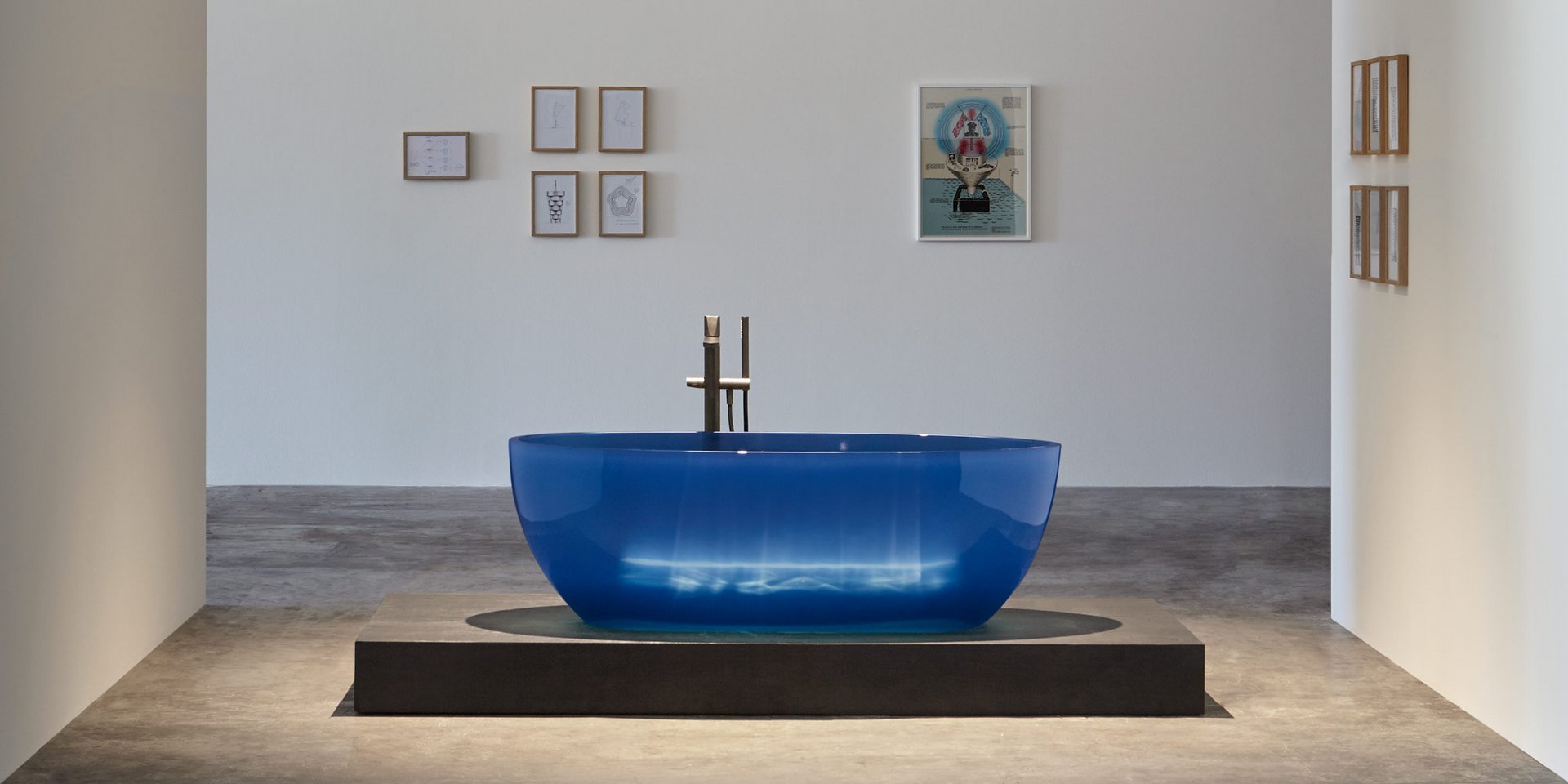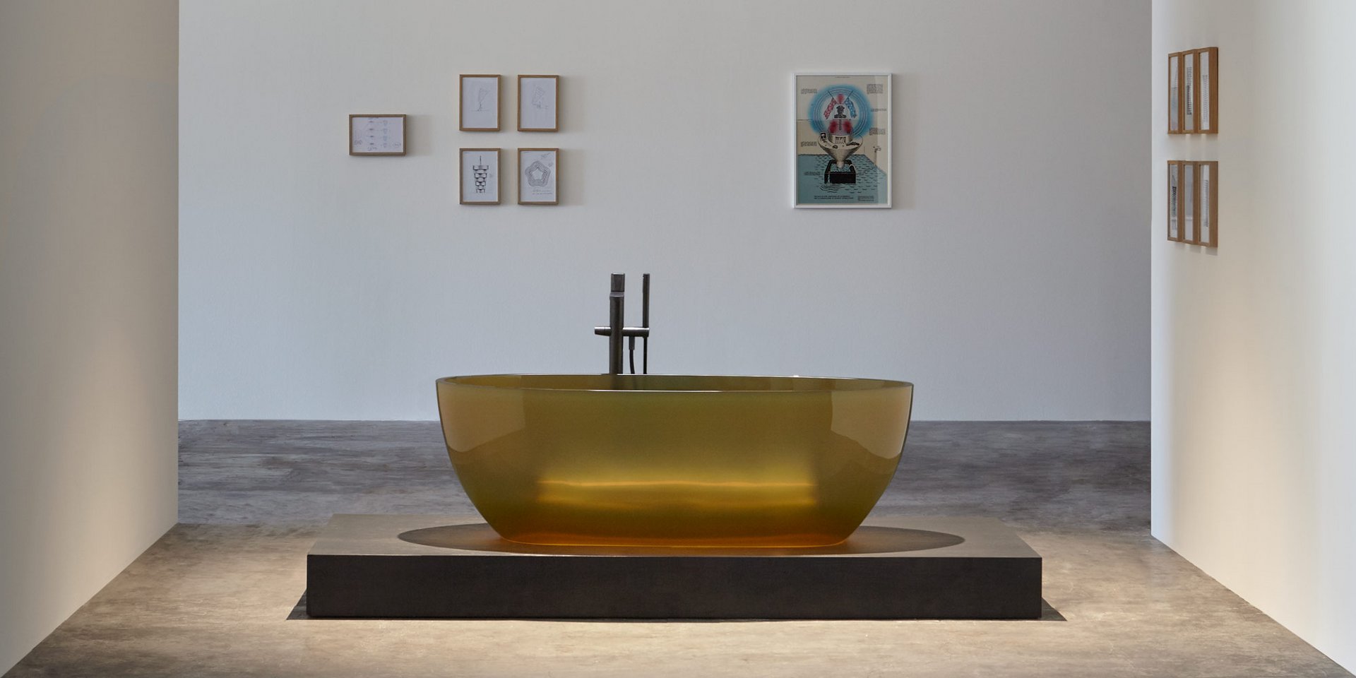Oval Cristalmood? bathtub complete with drain pipe fitting and pressure plug, siphon and flexible hose.