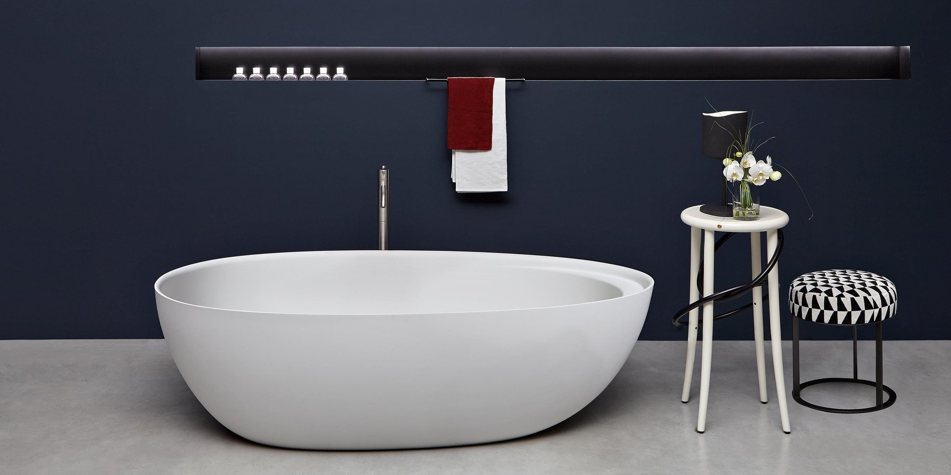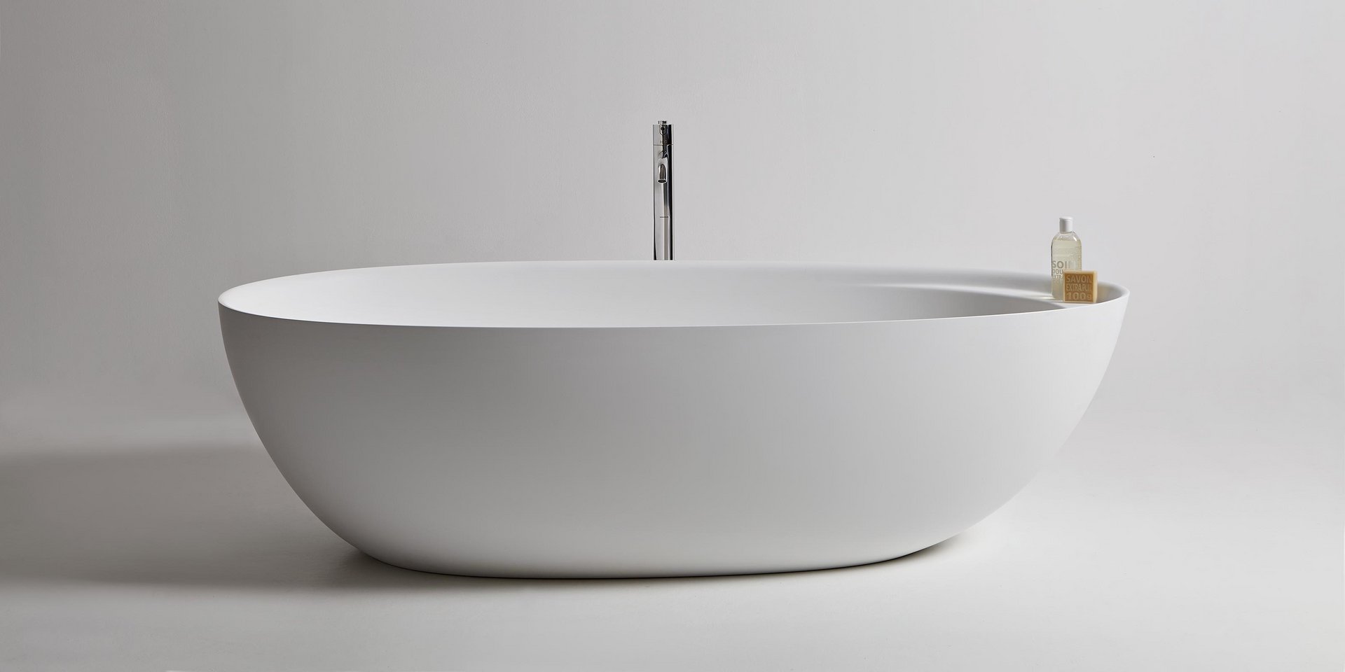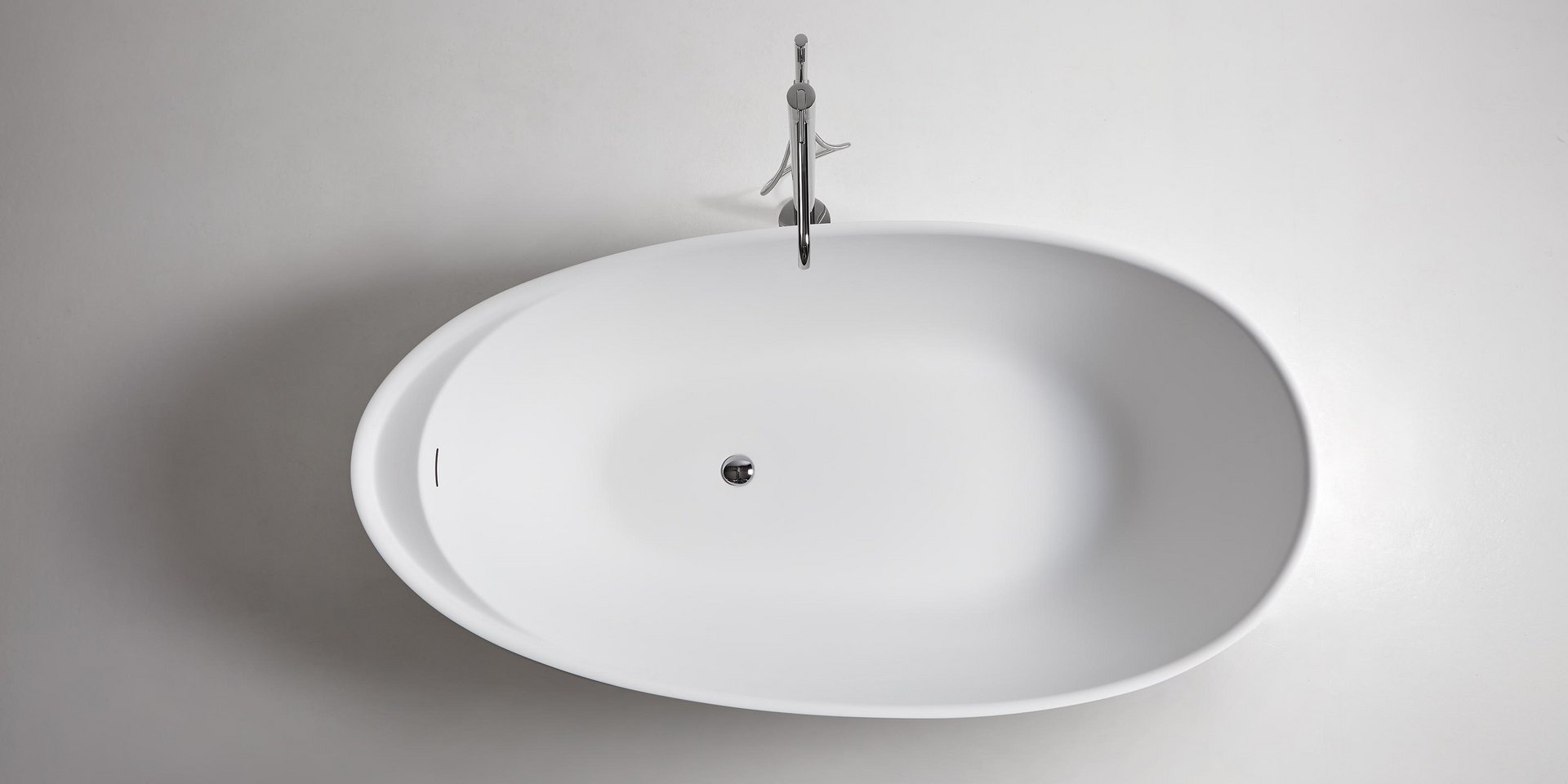 Oval Cristalplant bathtub complete with drain pipe fitting and pressure plug, siphon and flexible hose, can be externally lacquered.