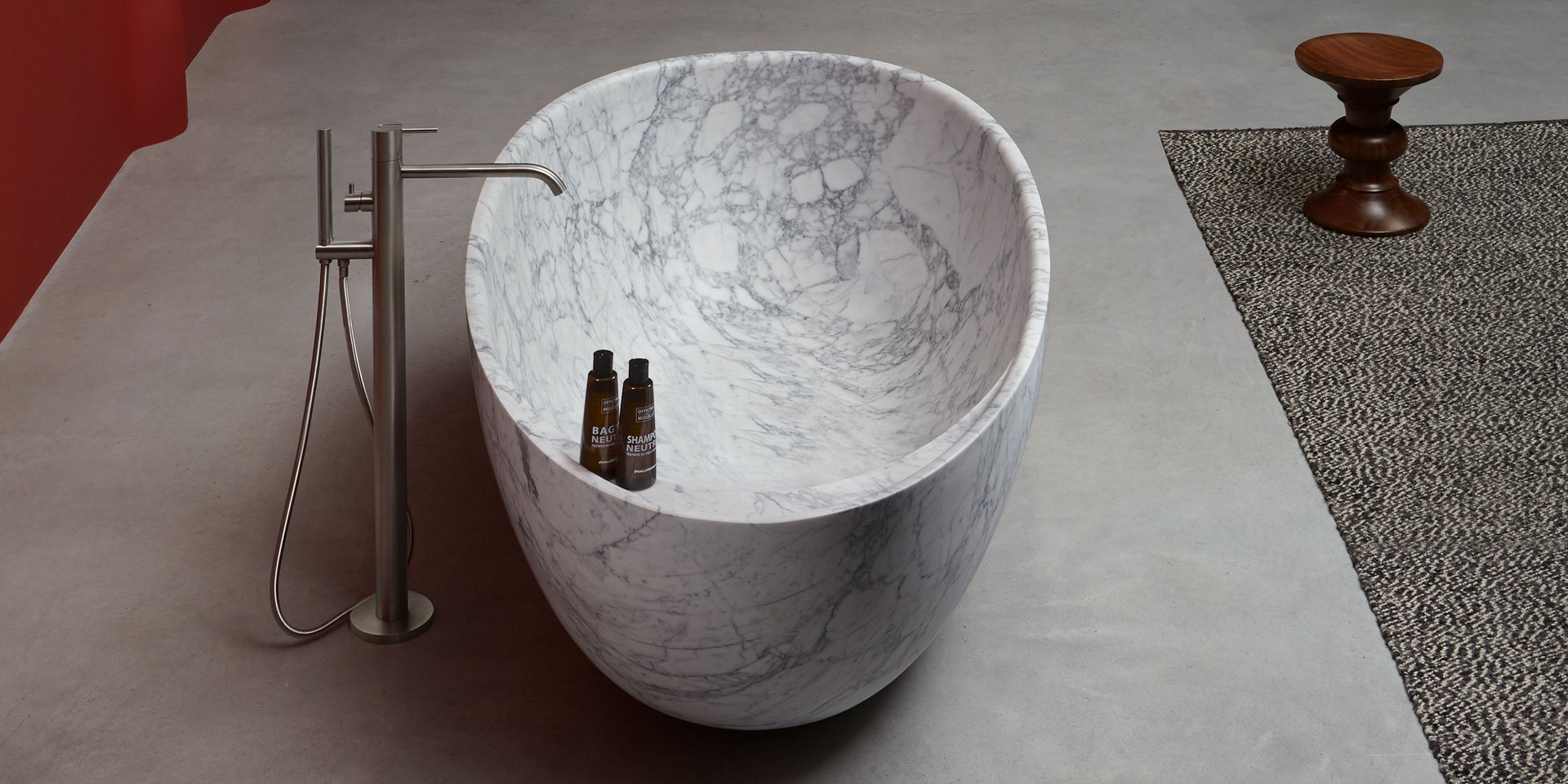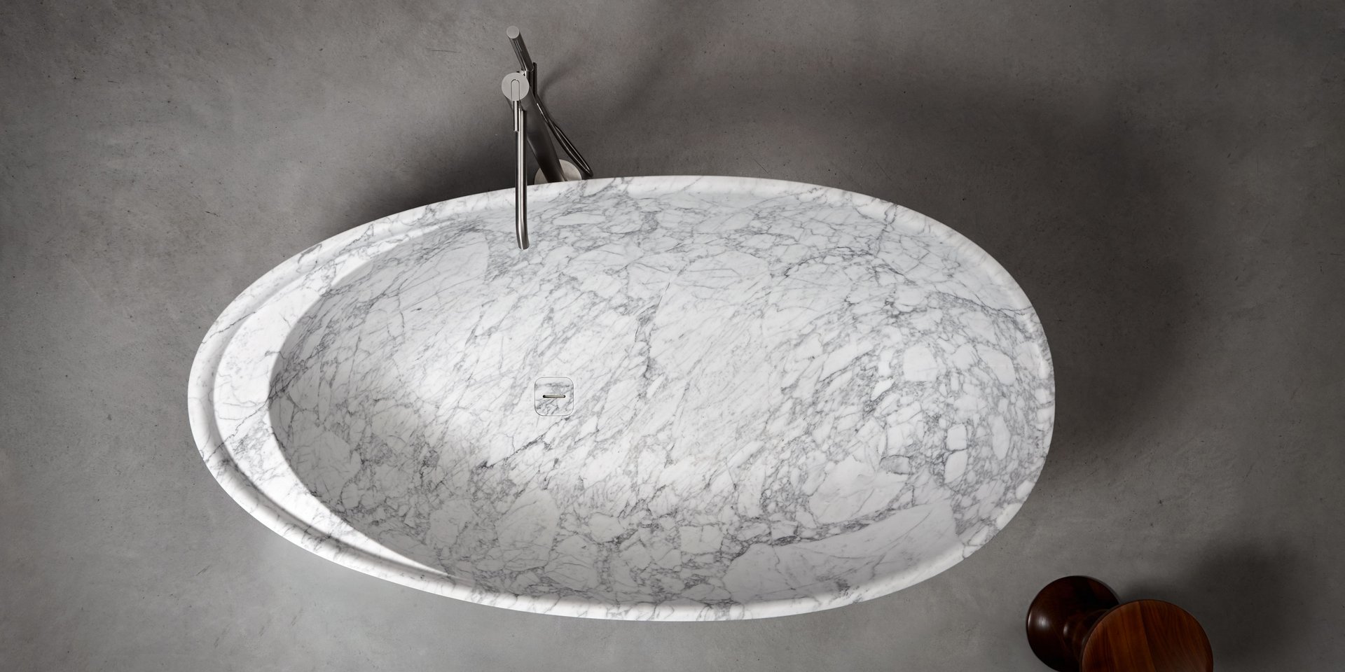 Oval bathtub in Carrara Marble complete with drain pipe fitting and pressure plug, siphon and flexible hose