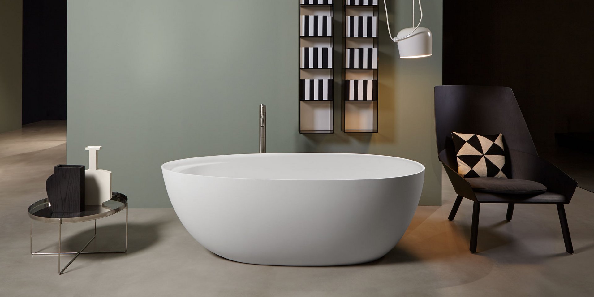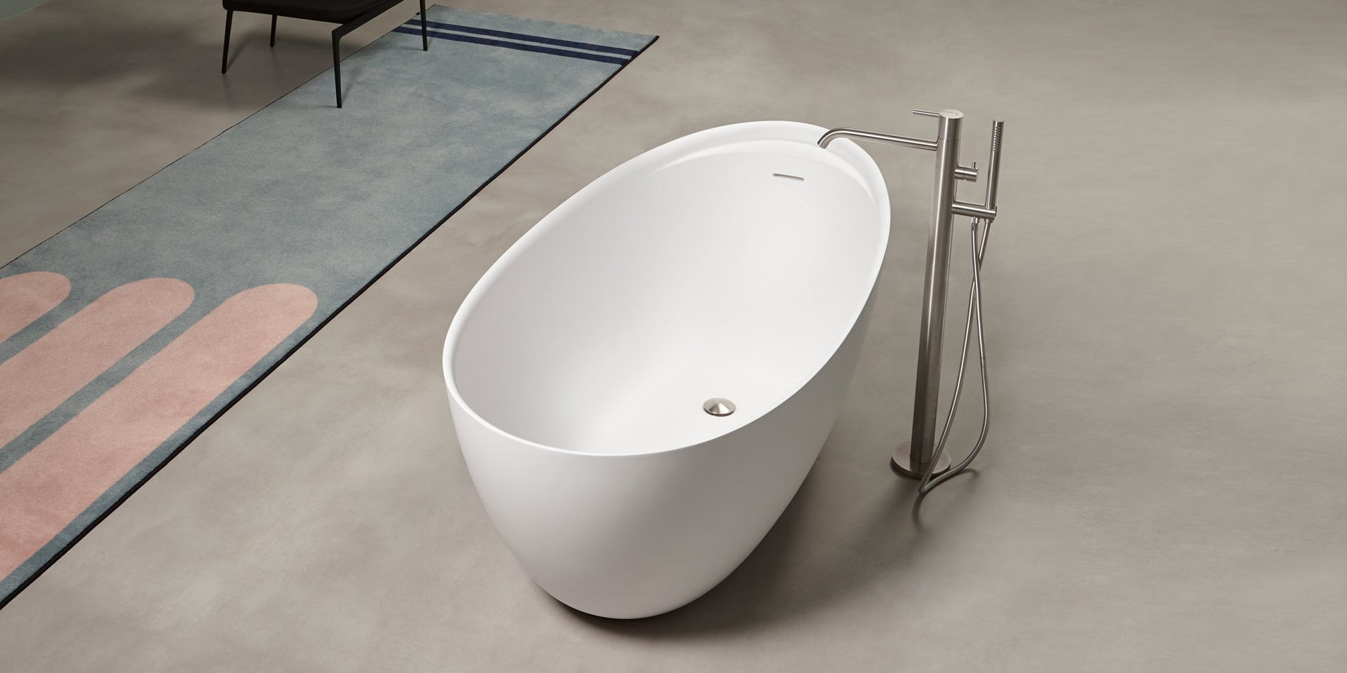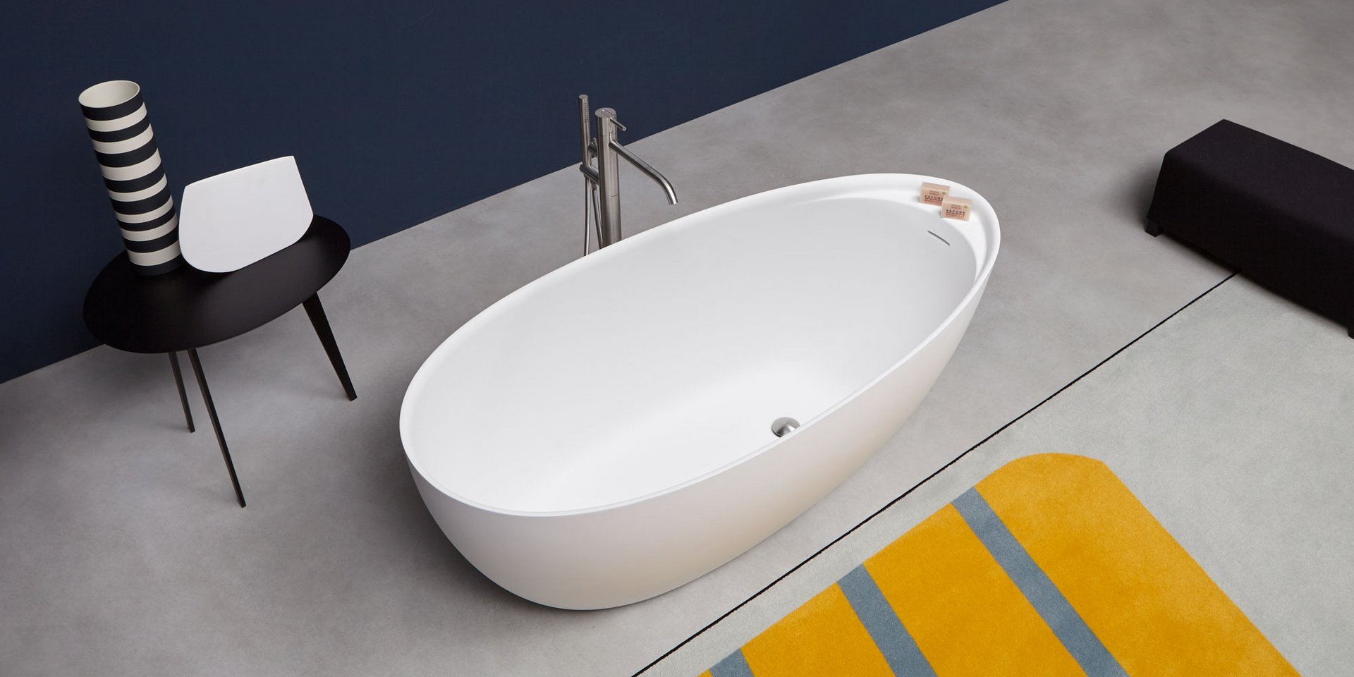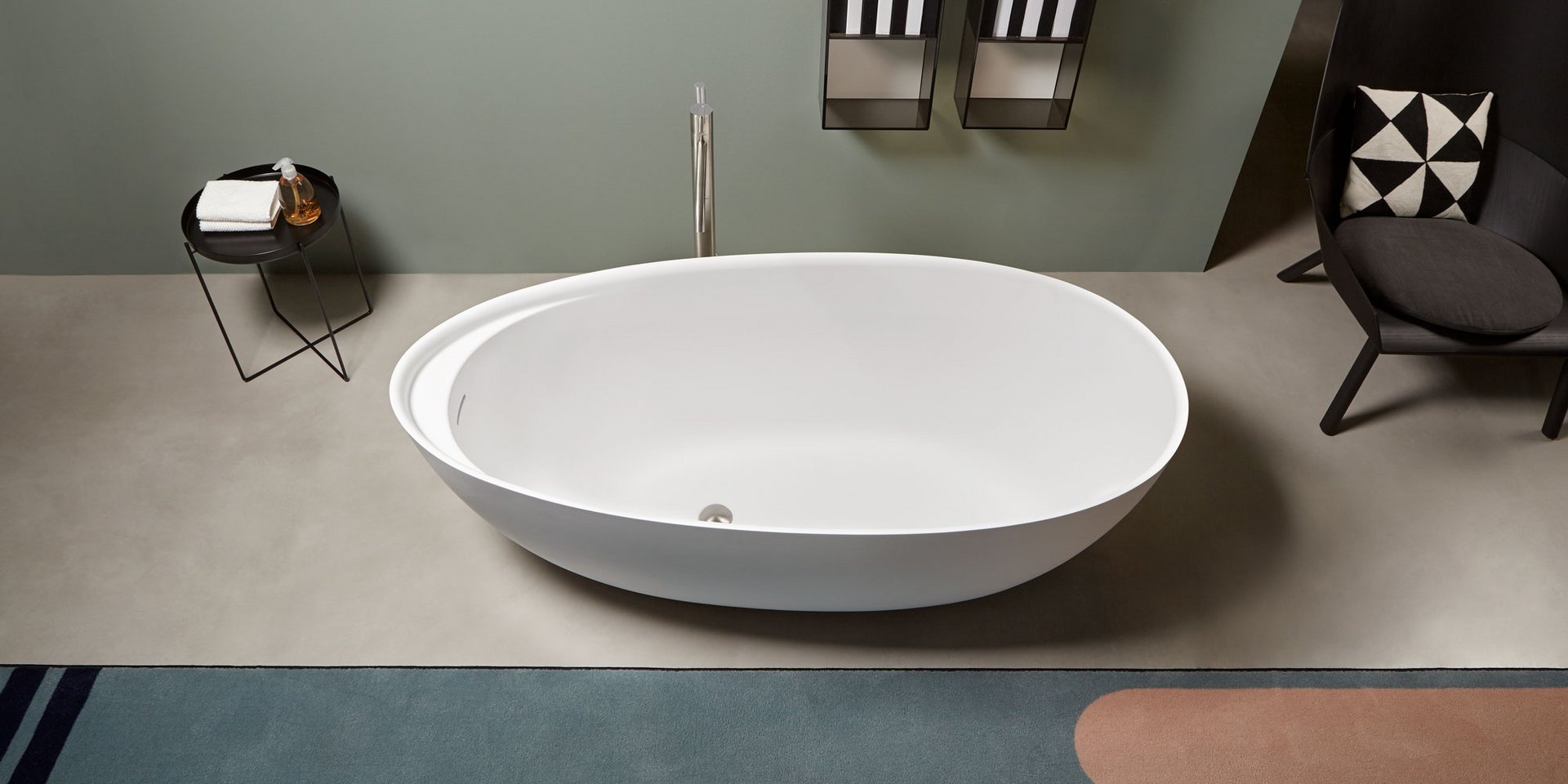 Oval Cristalplant bathtub complete with drain pipe fitting and pressure plug, siphon and flexible hose, can be externally lacquered.