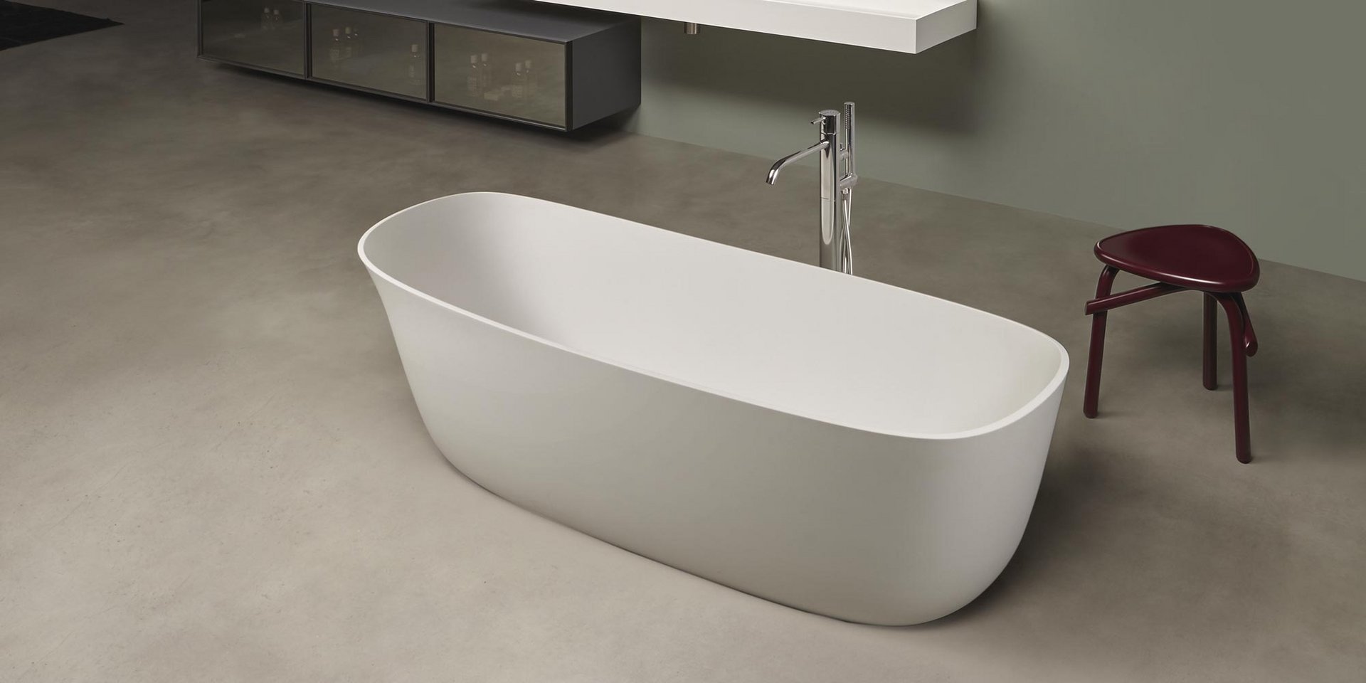Oval Cristalplant bathtub complete with drain and pressure plug, siphon and flexible hose.