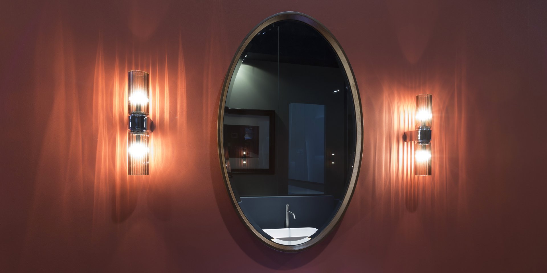 Horizontal or vertical oval beveled mirror with solid wood frame.