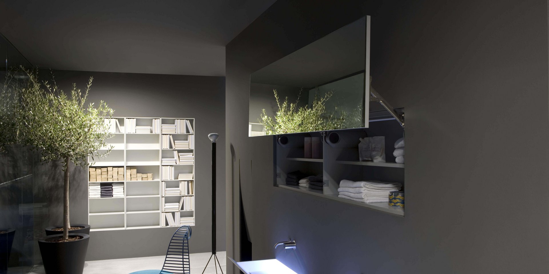 Wall cabinet with vertical electrical flap-opening mirrored door. Upon request it can be produced with internal led lighting.