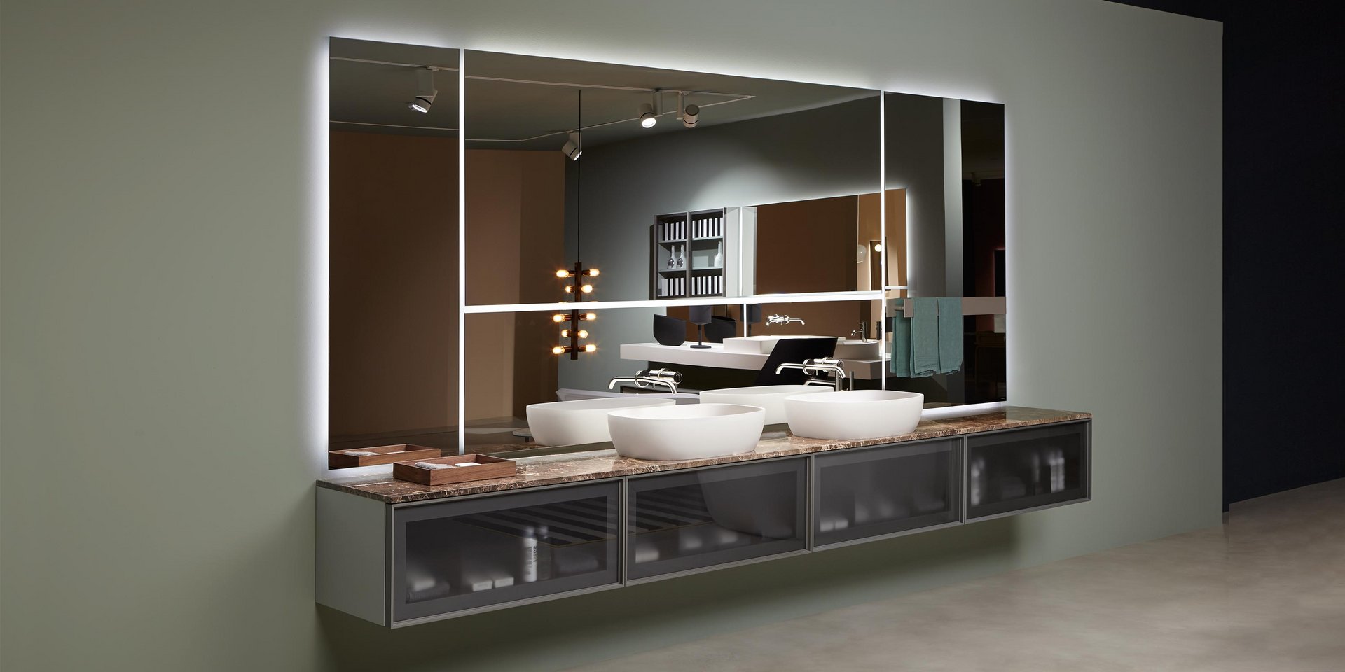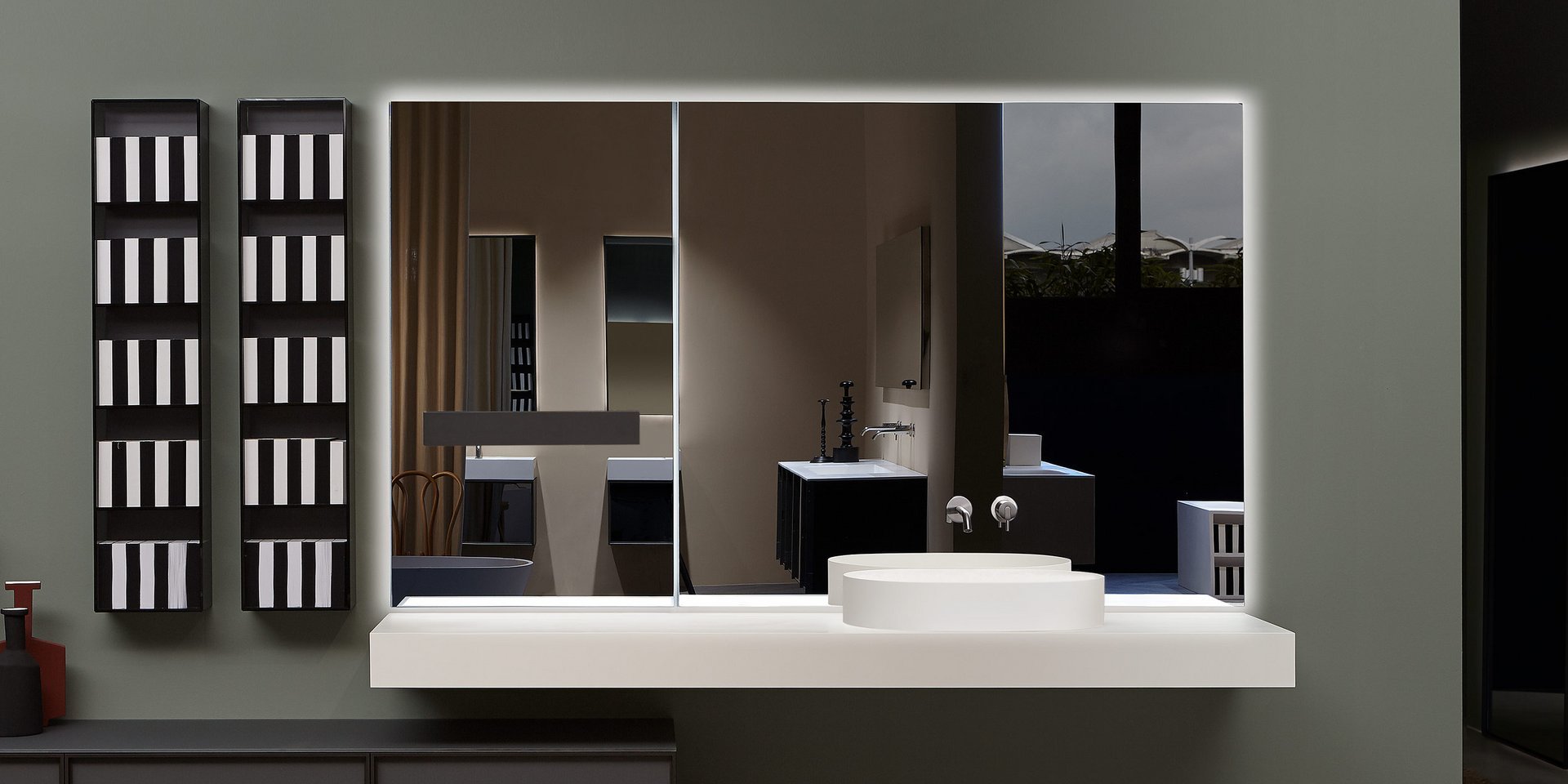 Polished edge mirror mounted horizontally or vertically complete with frame and white led lighting prepared for concealed valves Art. SP201INSA, Art. SP201INLU and/or towel rail Art. RETTA