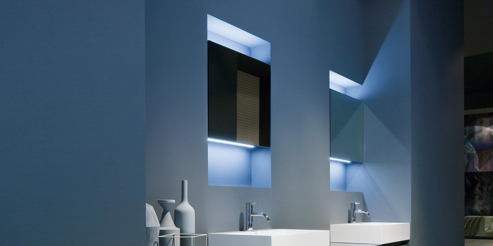 Right or left wall cabinet with 1 double face mirrored door and 1 internal shelf for H 50 cm or with 2 internal shelves for H 75 and H 90 cm.