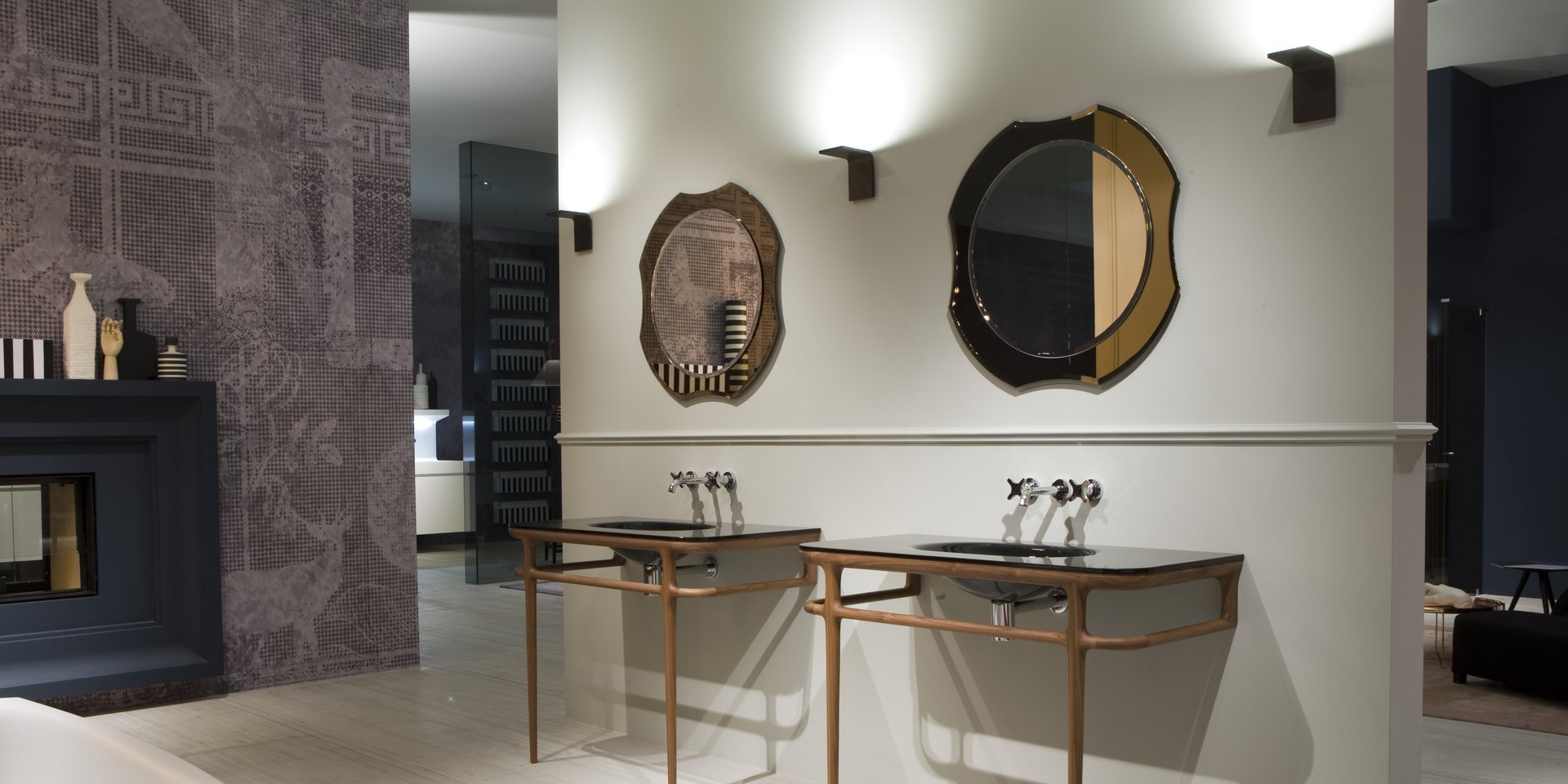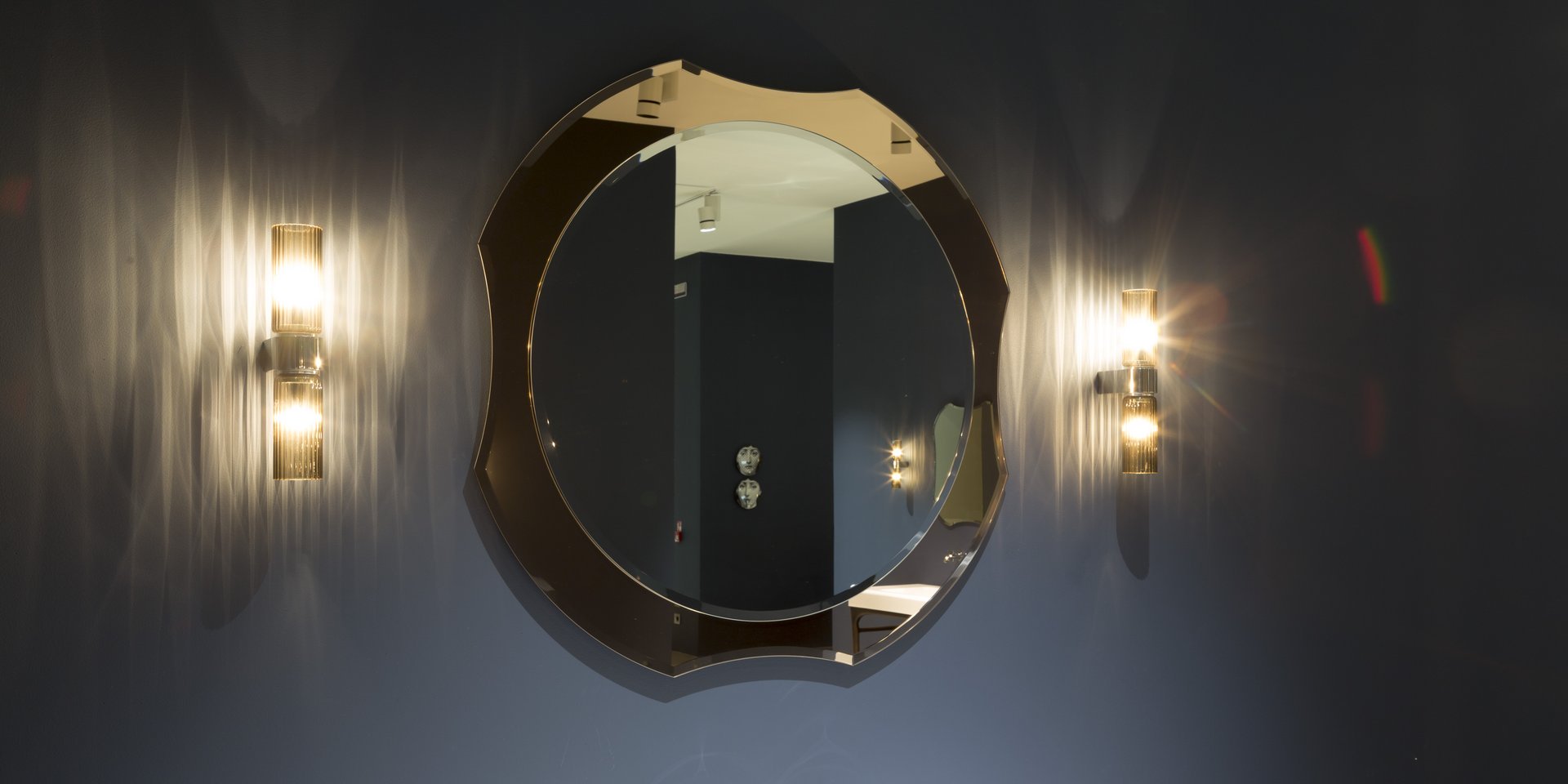 Round beveled mirror with a coloured and silvered glass frame available in the various colours: fumé, bronze, rosé, blu and acquamarina