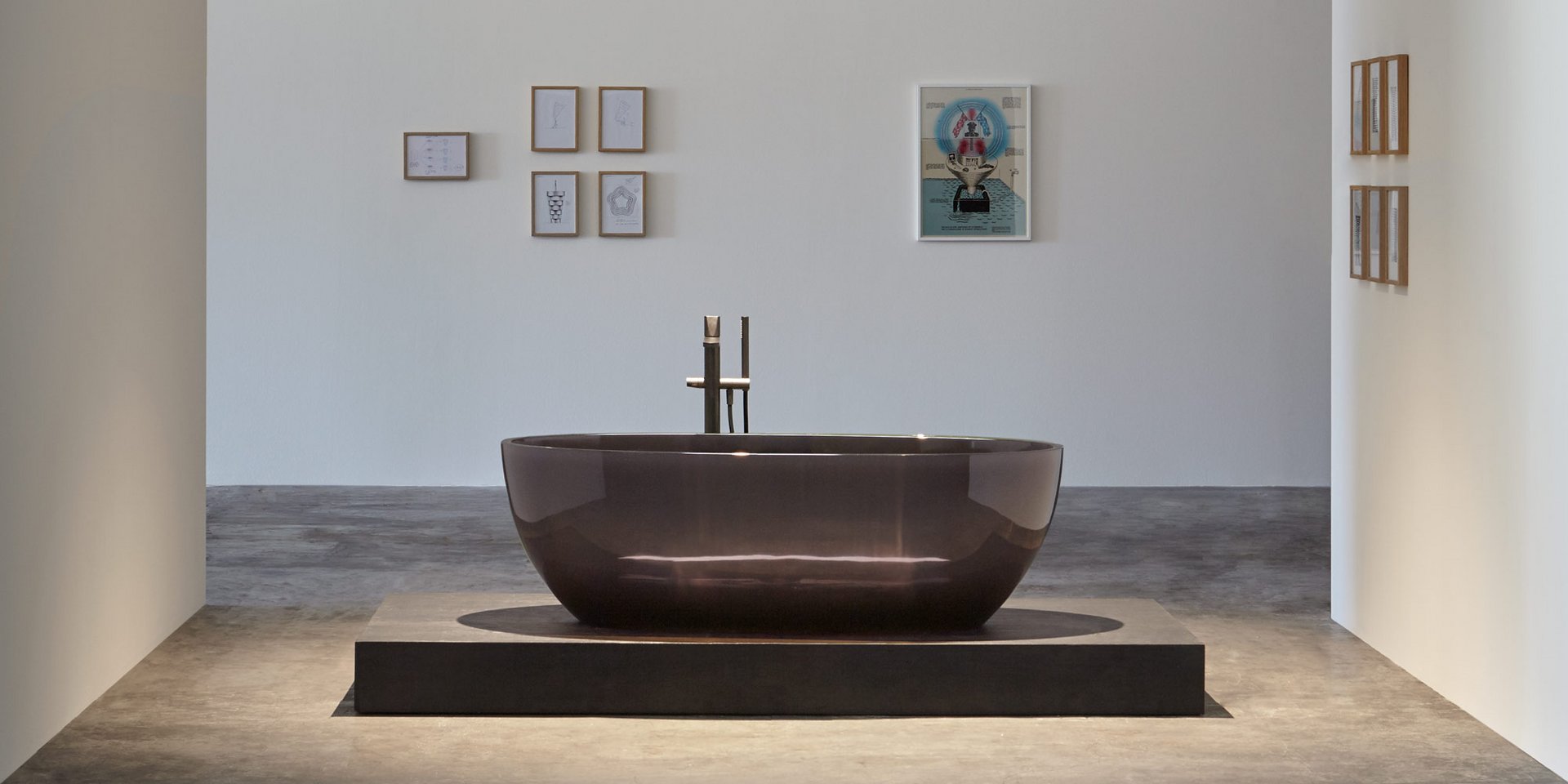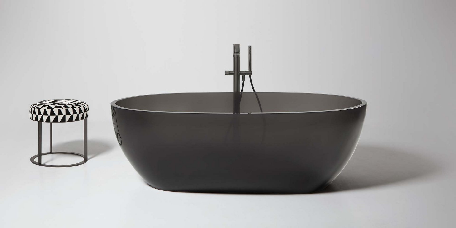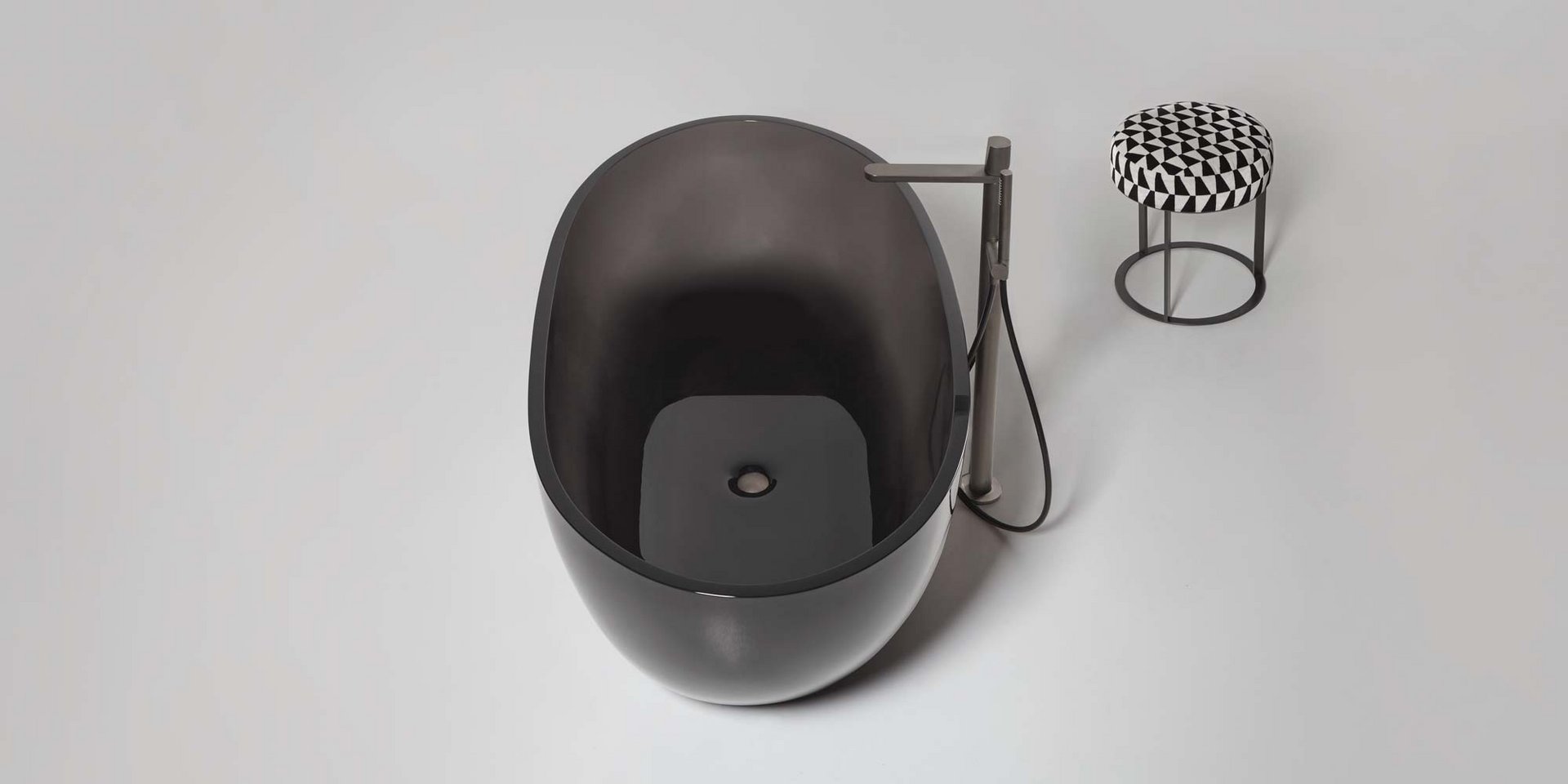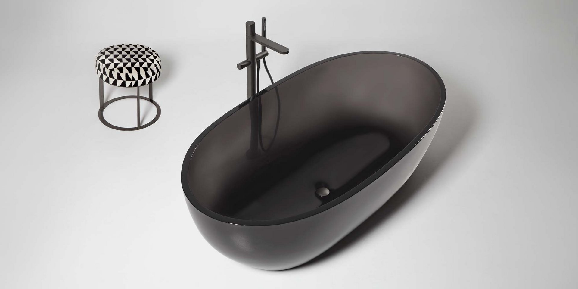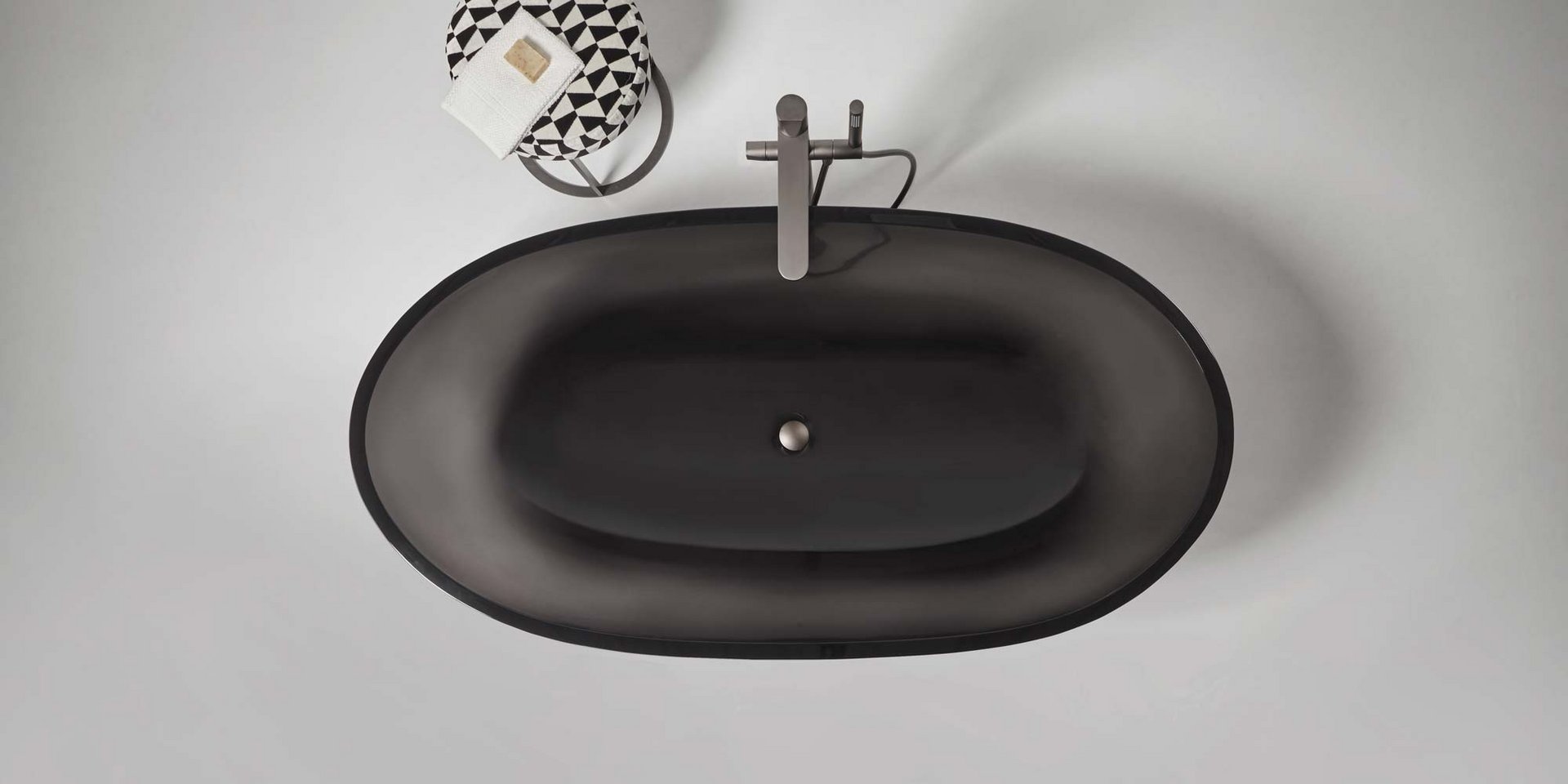 Oval Cristalmood? bathtub complete with drain pipe fitting and pressure plug, siphon and flexible hose.
