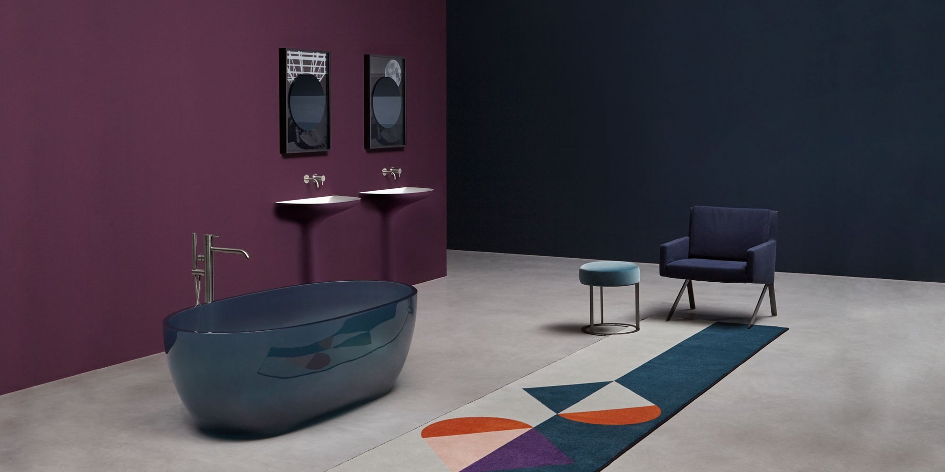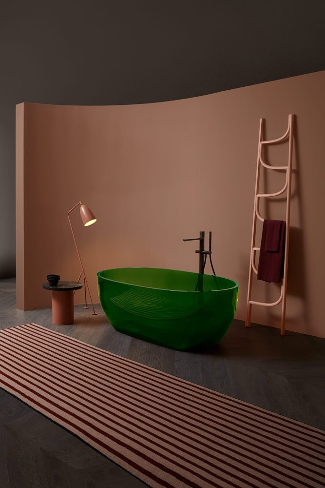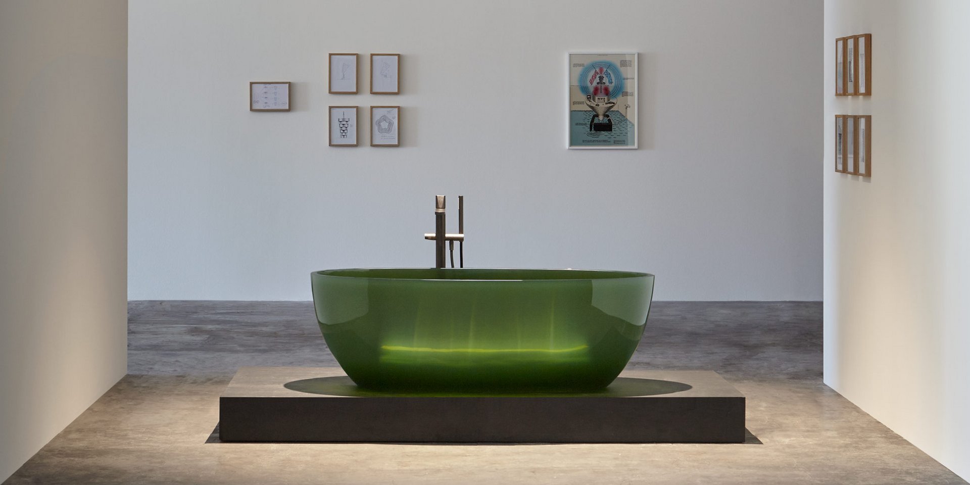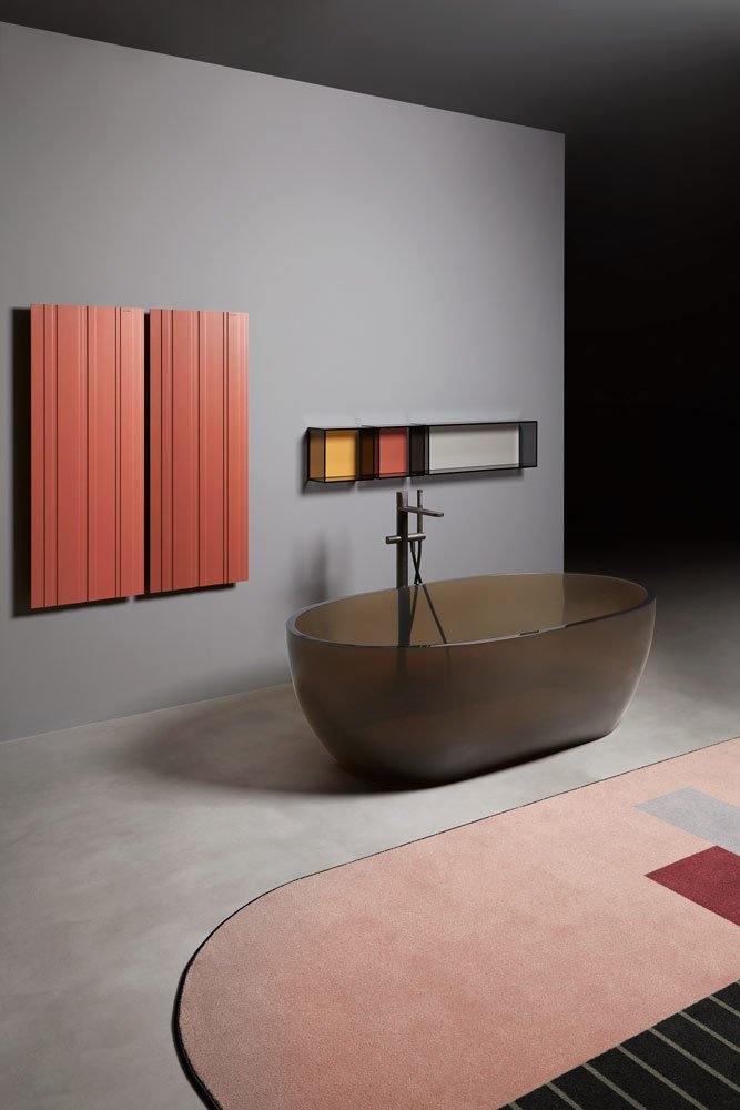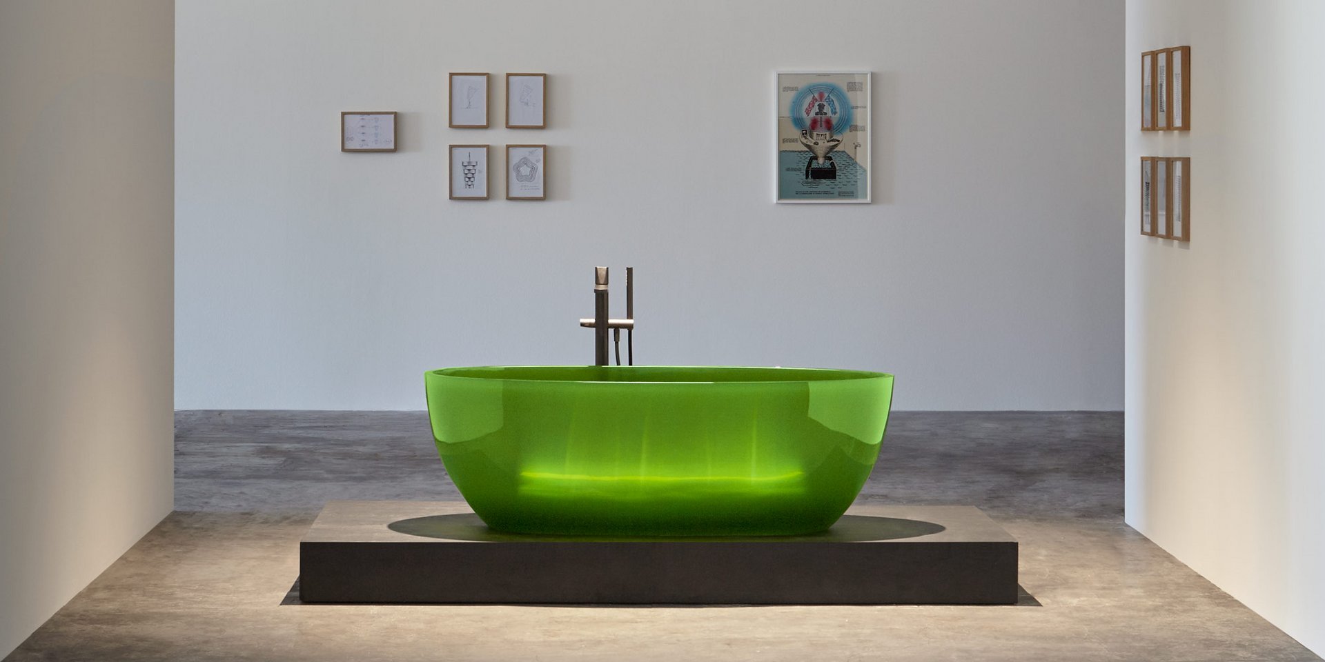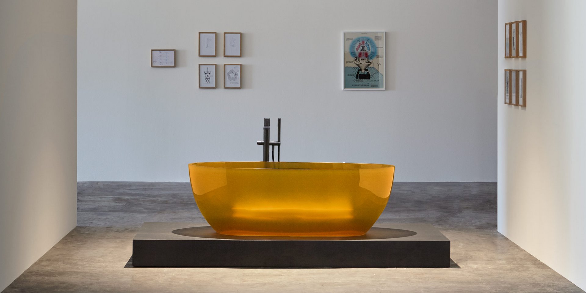Oval Cristalmood? bathtub complete with drain pipe fitting and pressure plug, siphon and flexible hose.