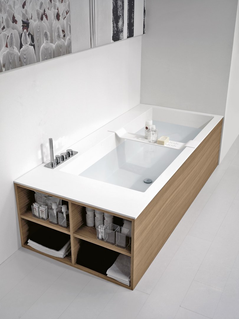 Rectangular Corian bathtub with front open shelves, covered on 4 sides with plywood panels veneered with wood essence complete with regulating feet and drain with pressure plug.