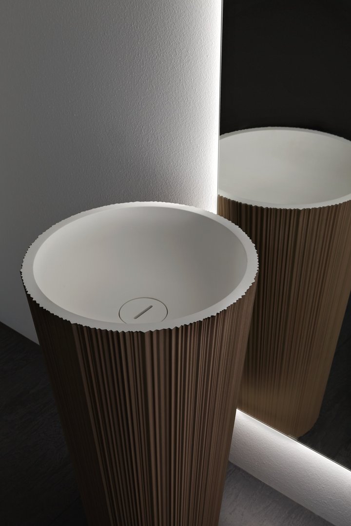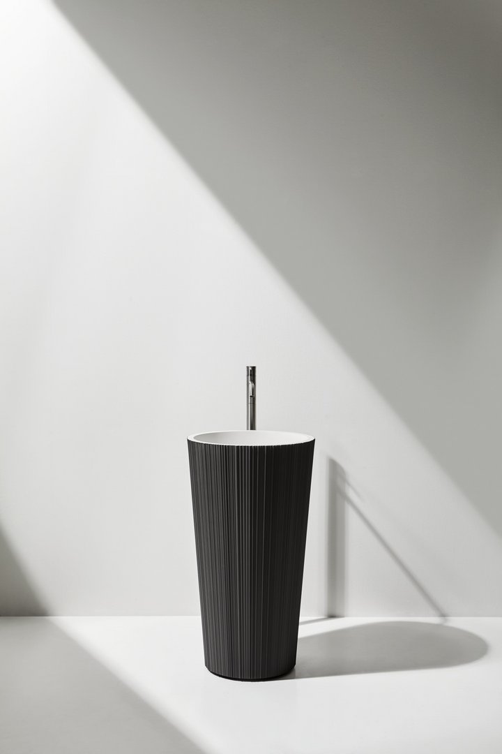 Freestanding flumood sink with floor drainage complete with open plug, siphon and flexible hose.