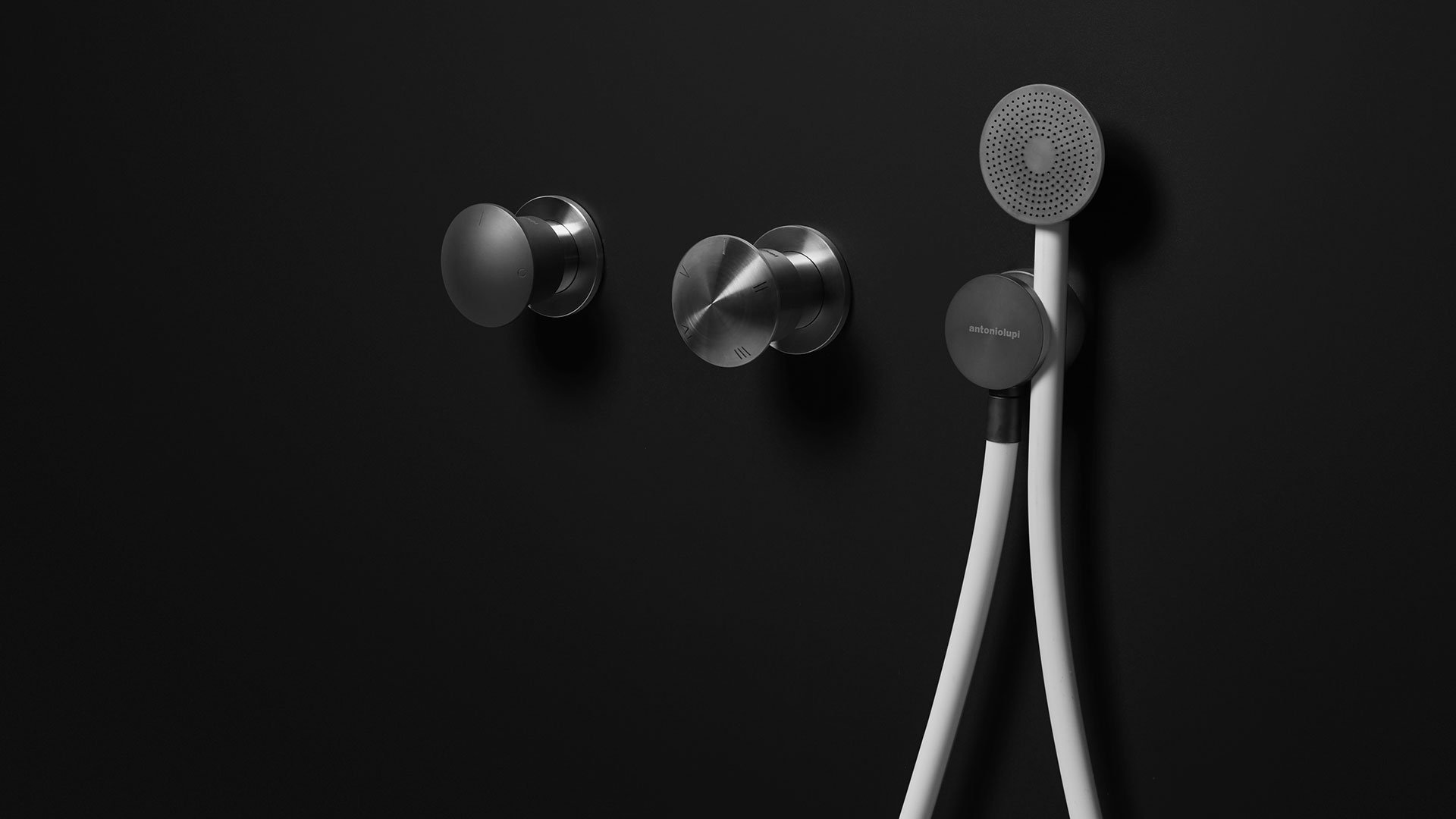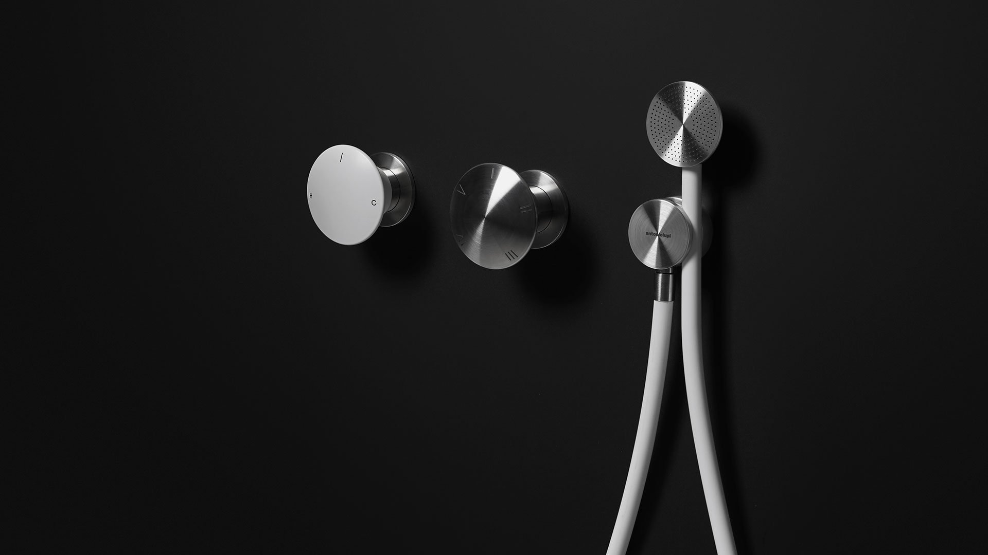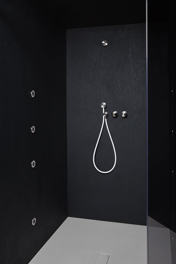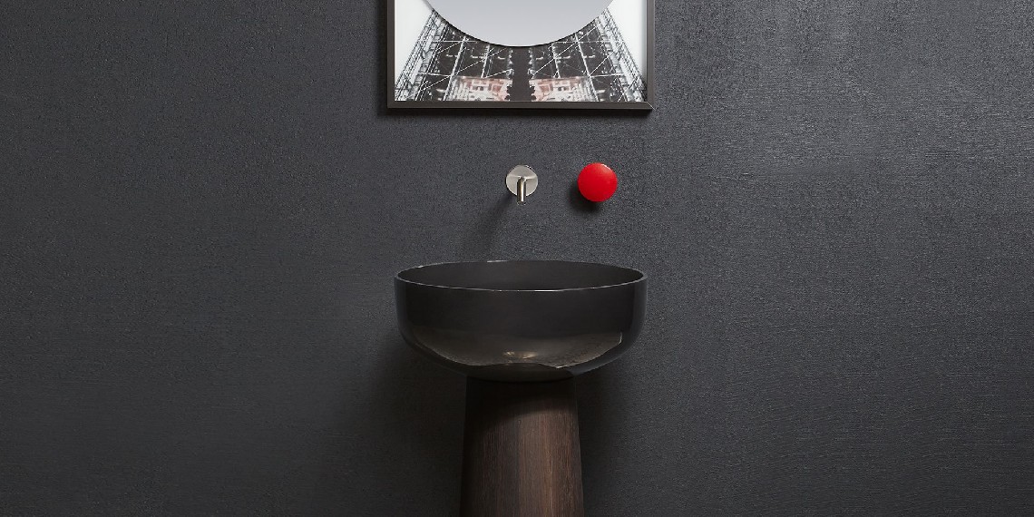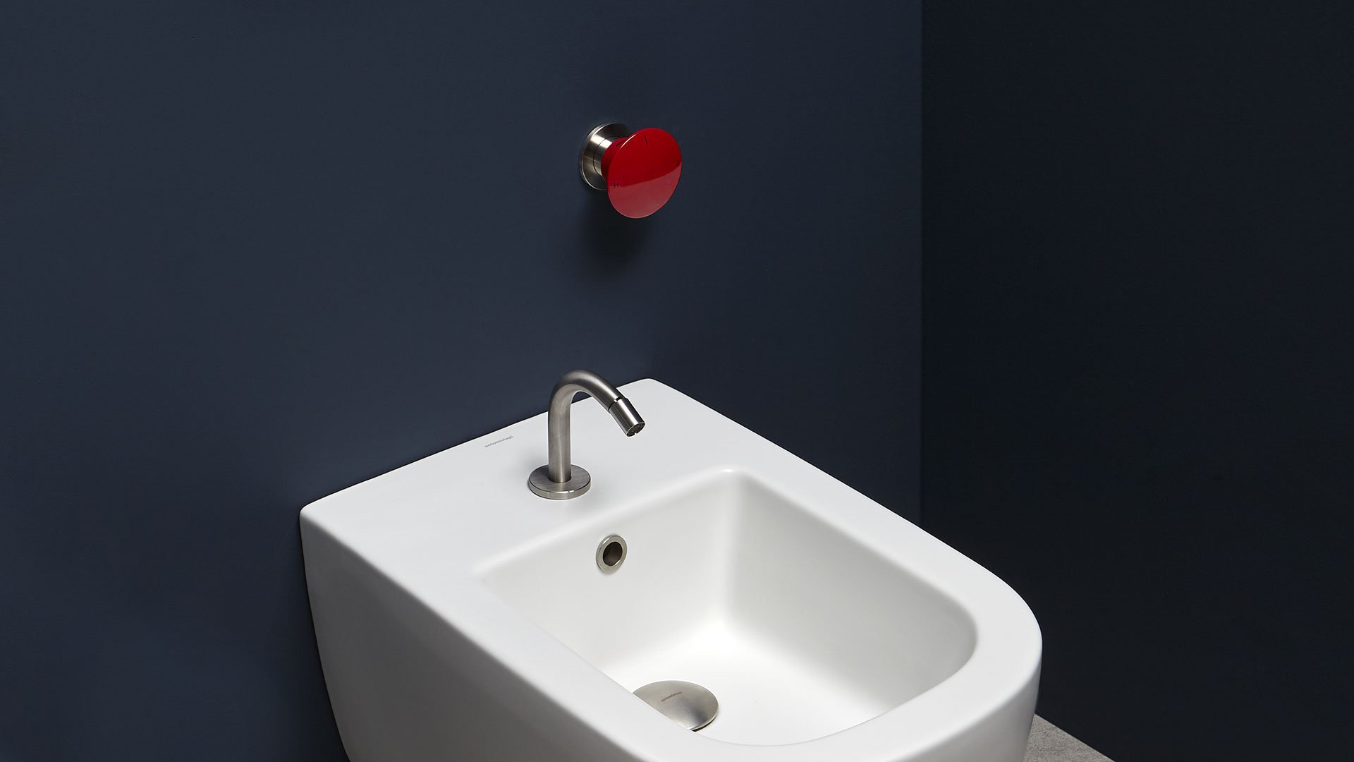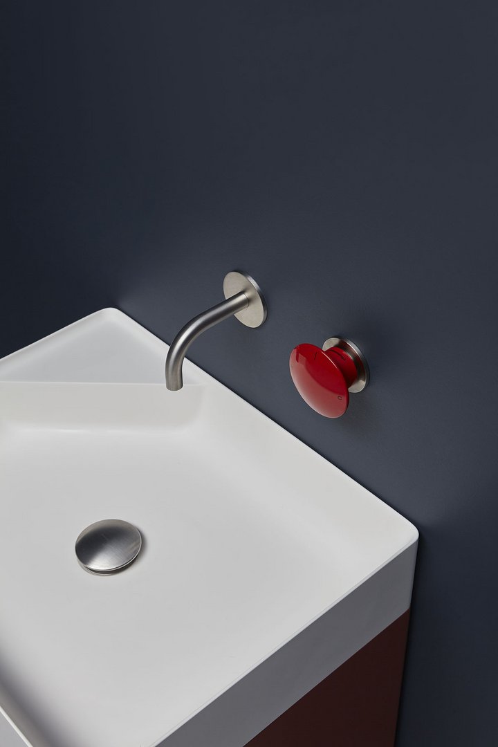 Single lever mixer with a satin stainless steel handle or graphite, lacquered red or white brass complete with concealed valve.