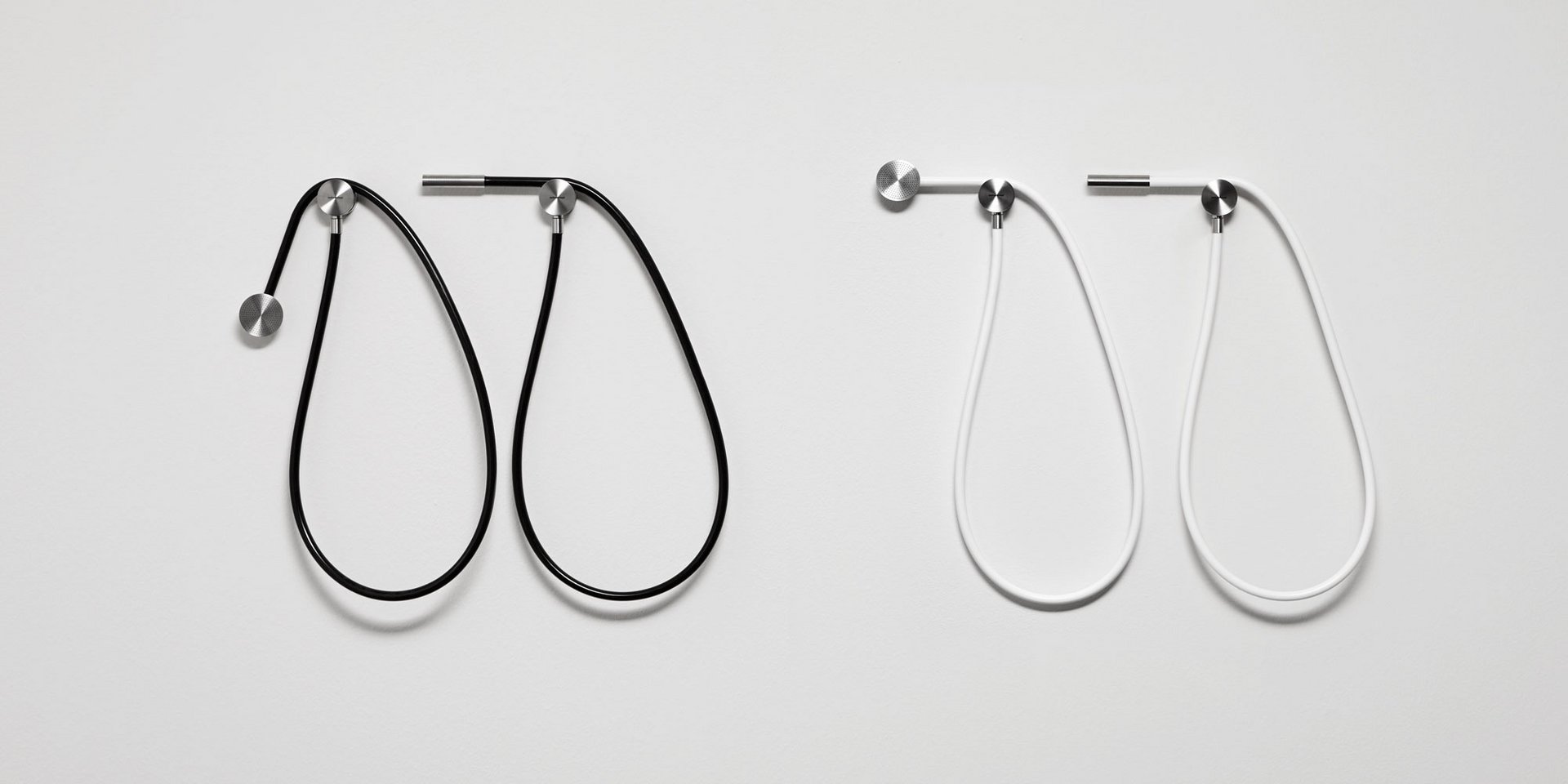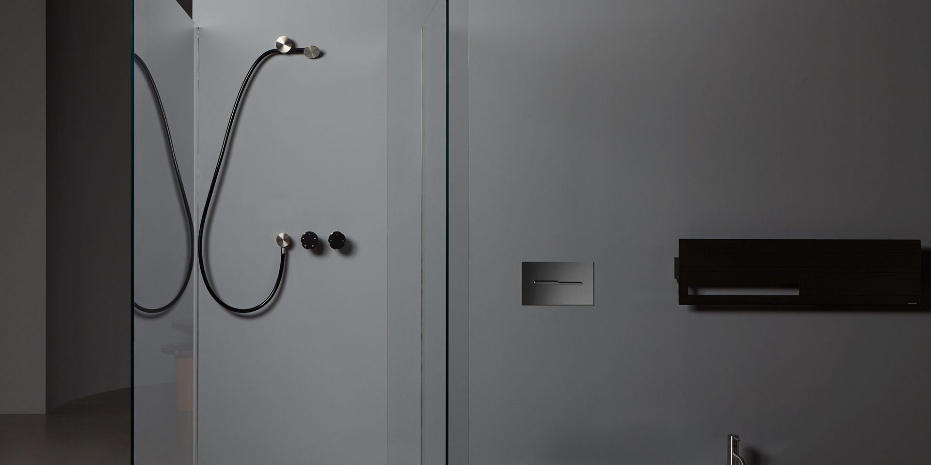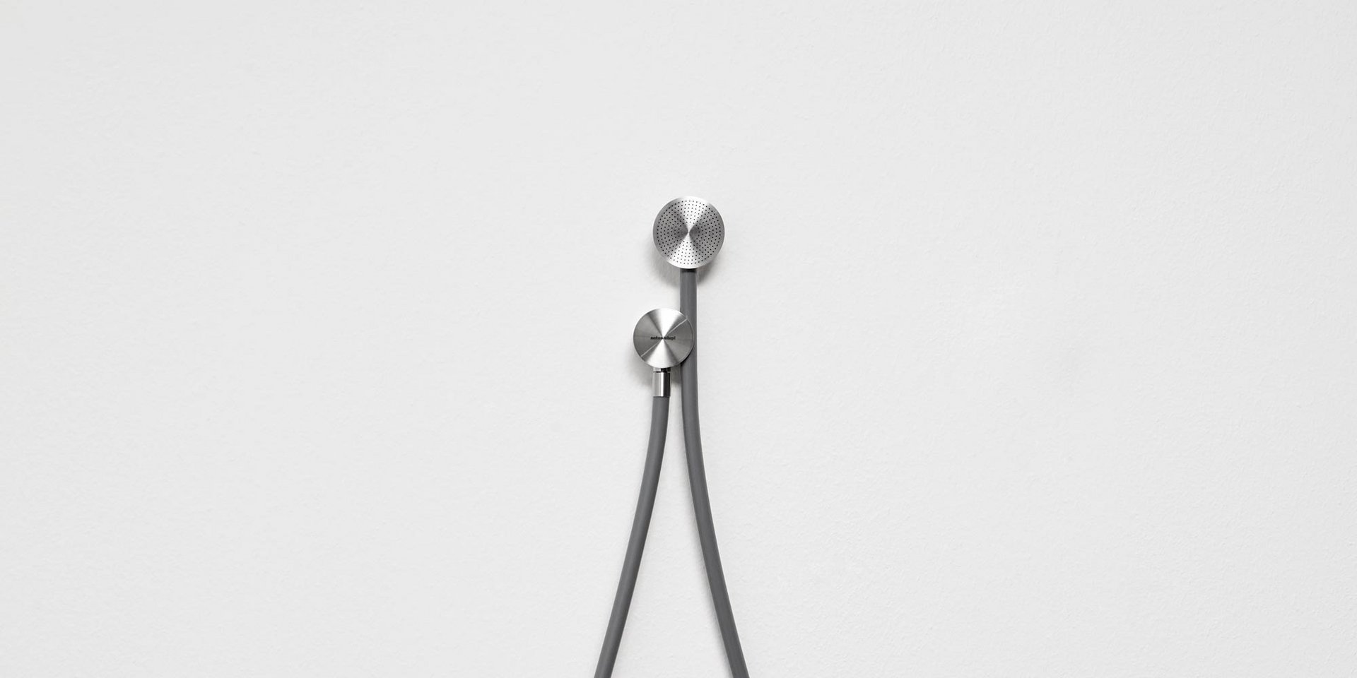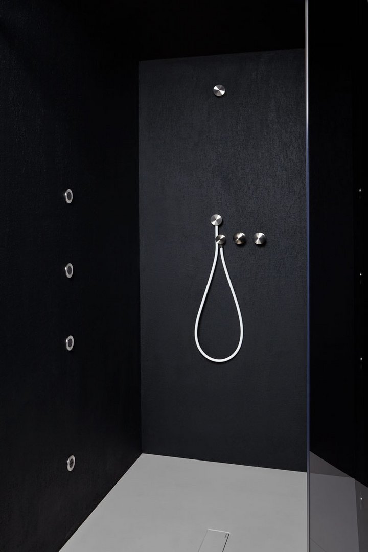 Hand shower in satin or polished stainless steel or graphite finish complete with wall support and water outlet, flexible hose 150 cm in silicone colored white, black or grey.