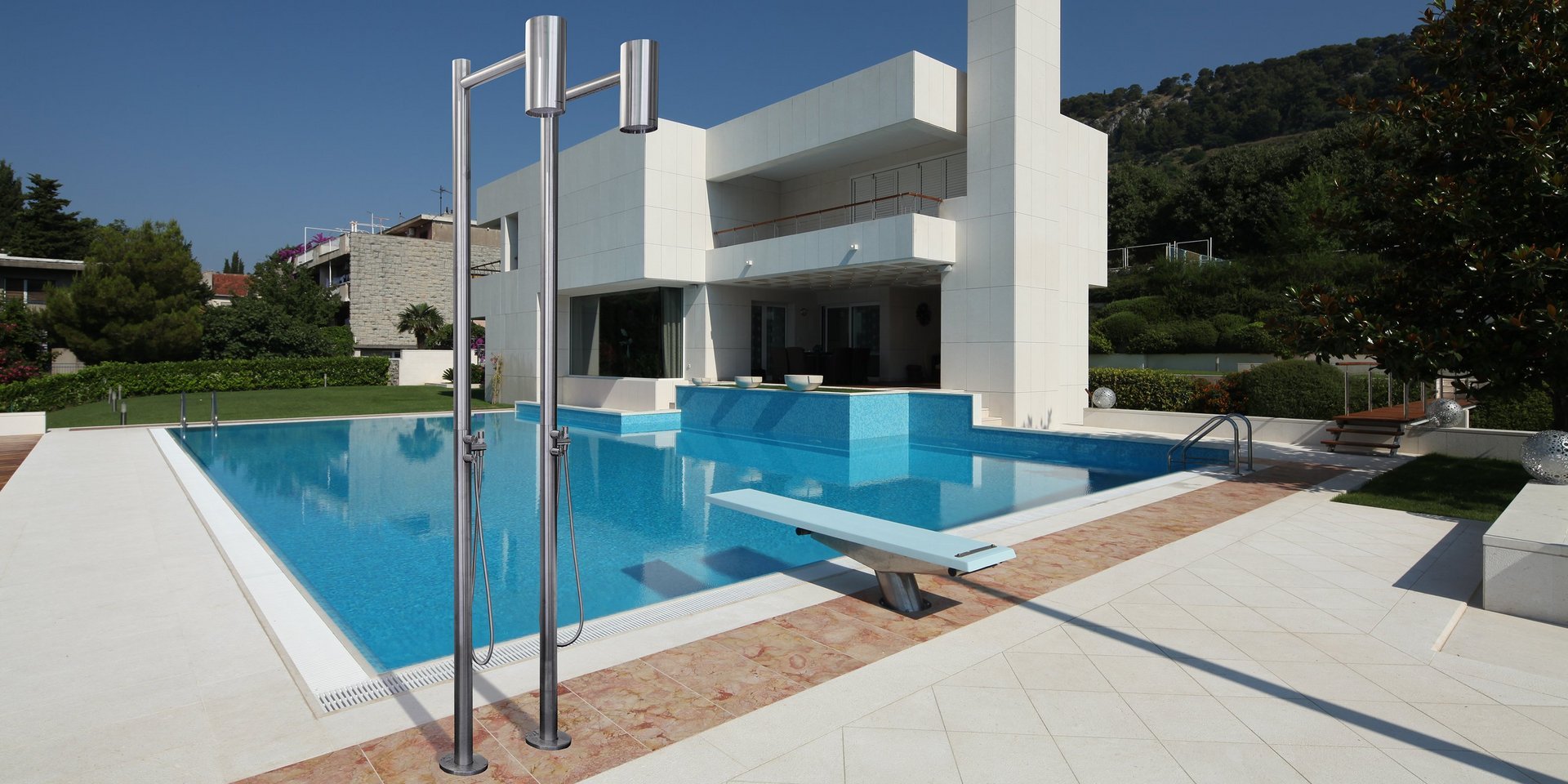 Freestanding shower for internal and external use, in stainless steel complete with concealed valve, overhead shower, mixer, waterproof remote control with two way diverter and hand shower with hose 150 cm.