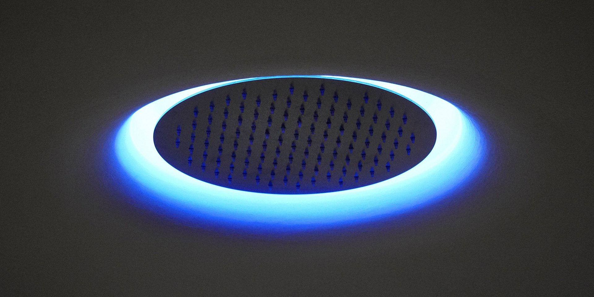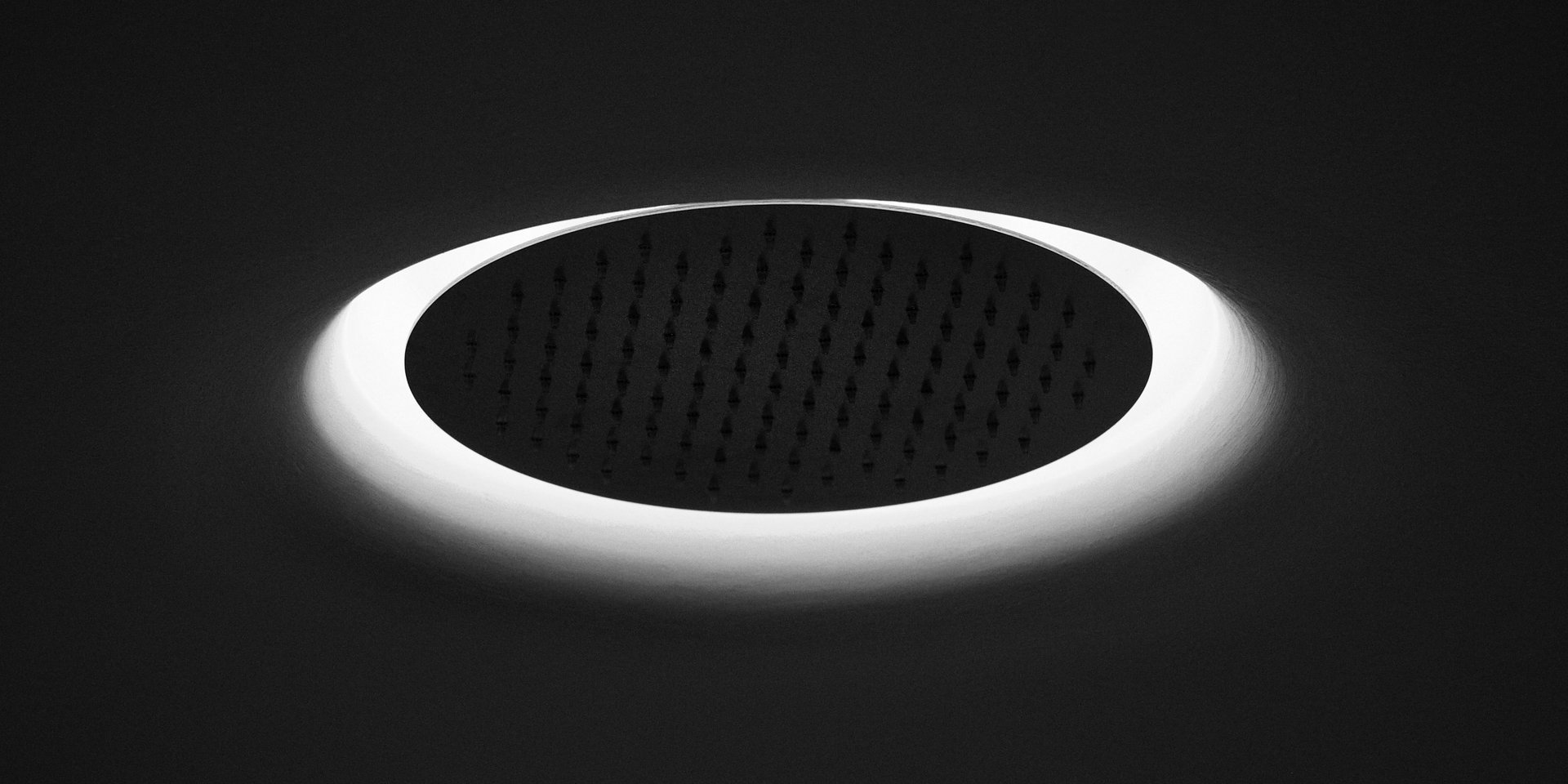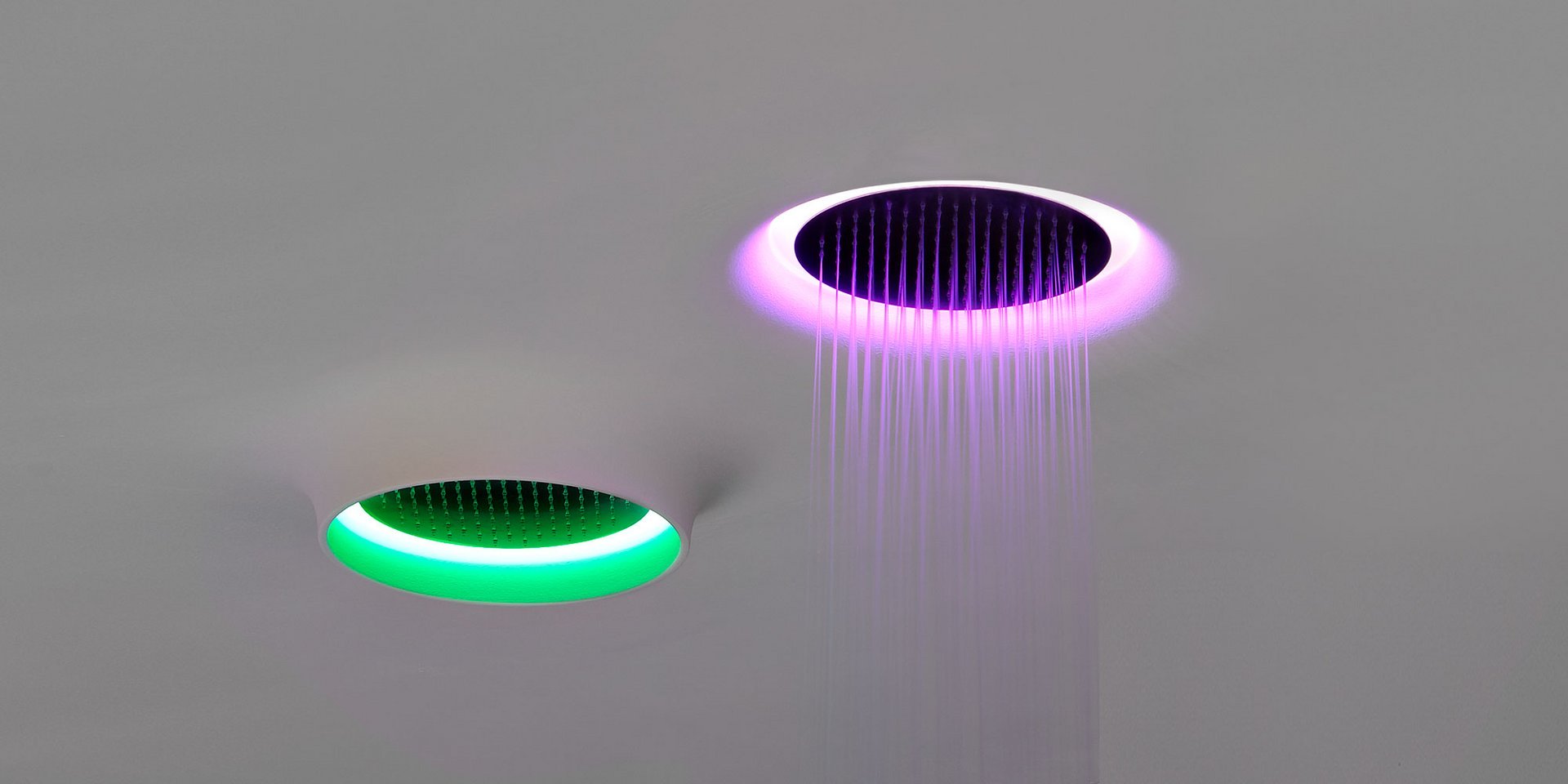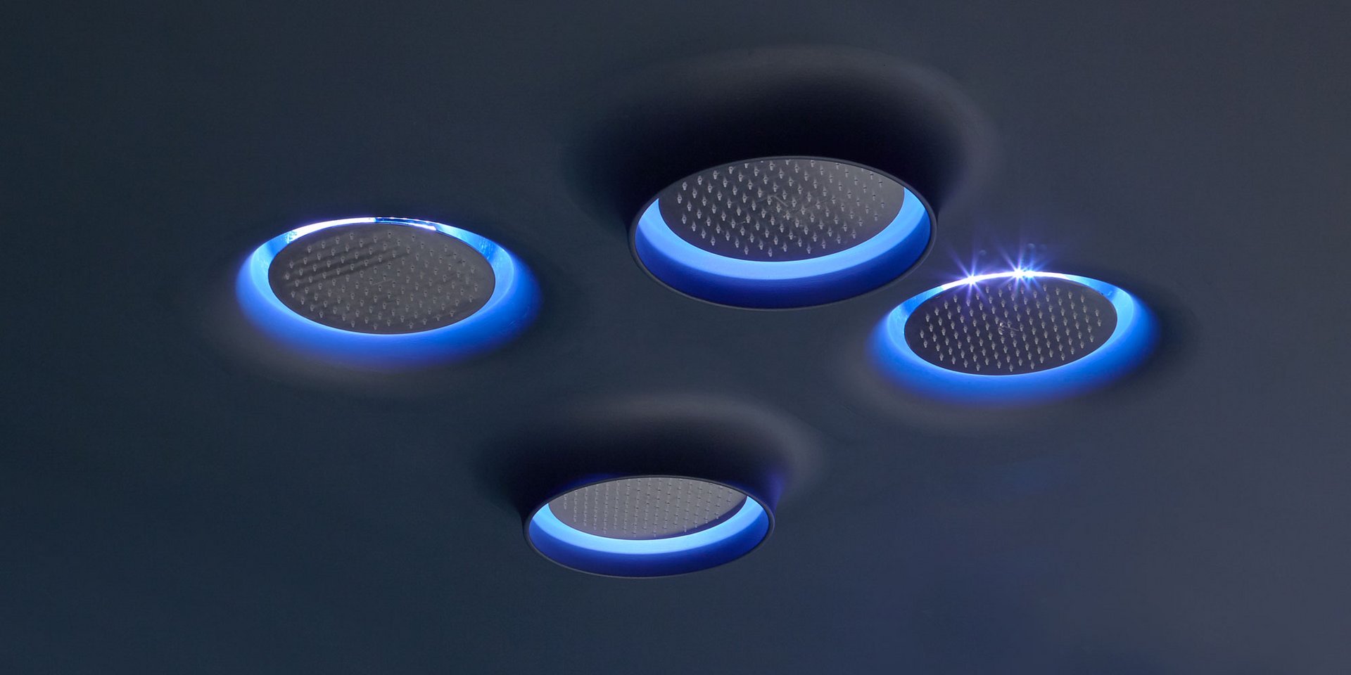 Encased Flumood? frame with stainless steel AISI 304 shower head, with possible LED RGB complete with waterproof remote control.