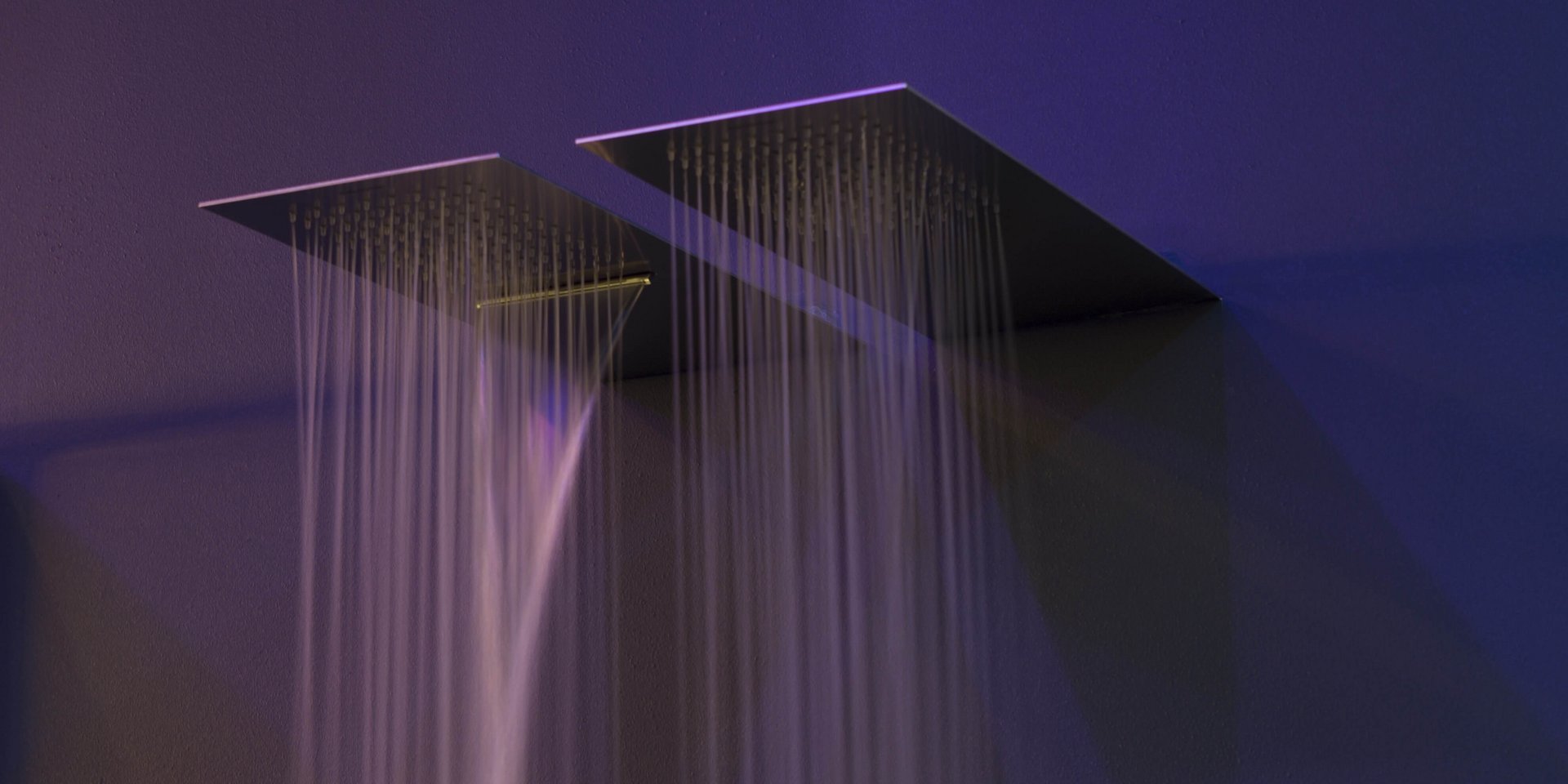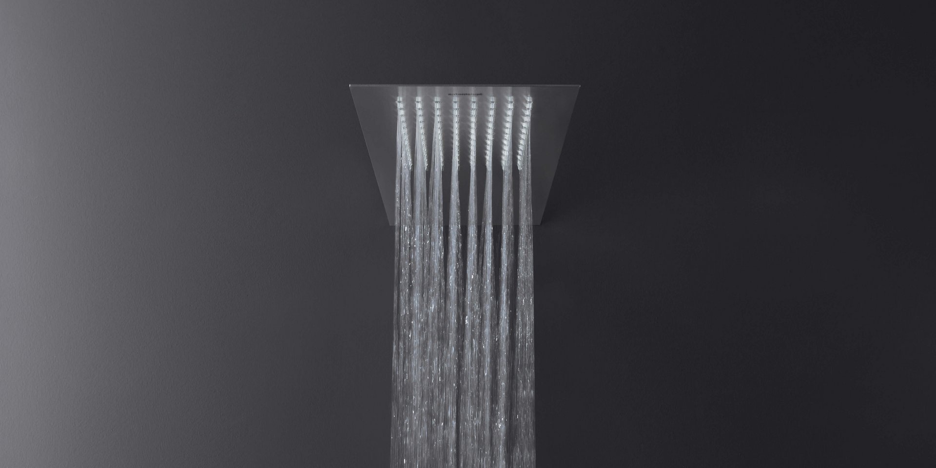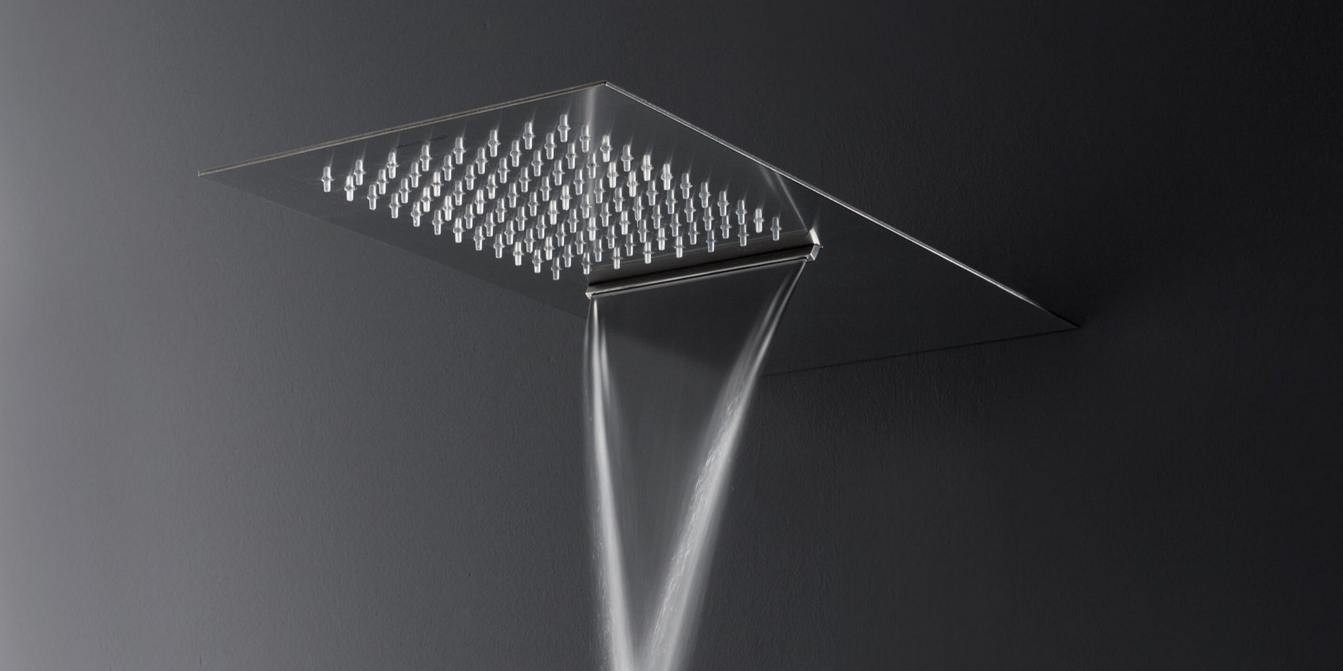 Wall mounted waterfall showerhead in stainless steel.
