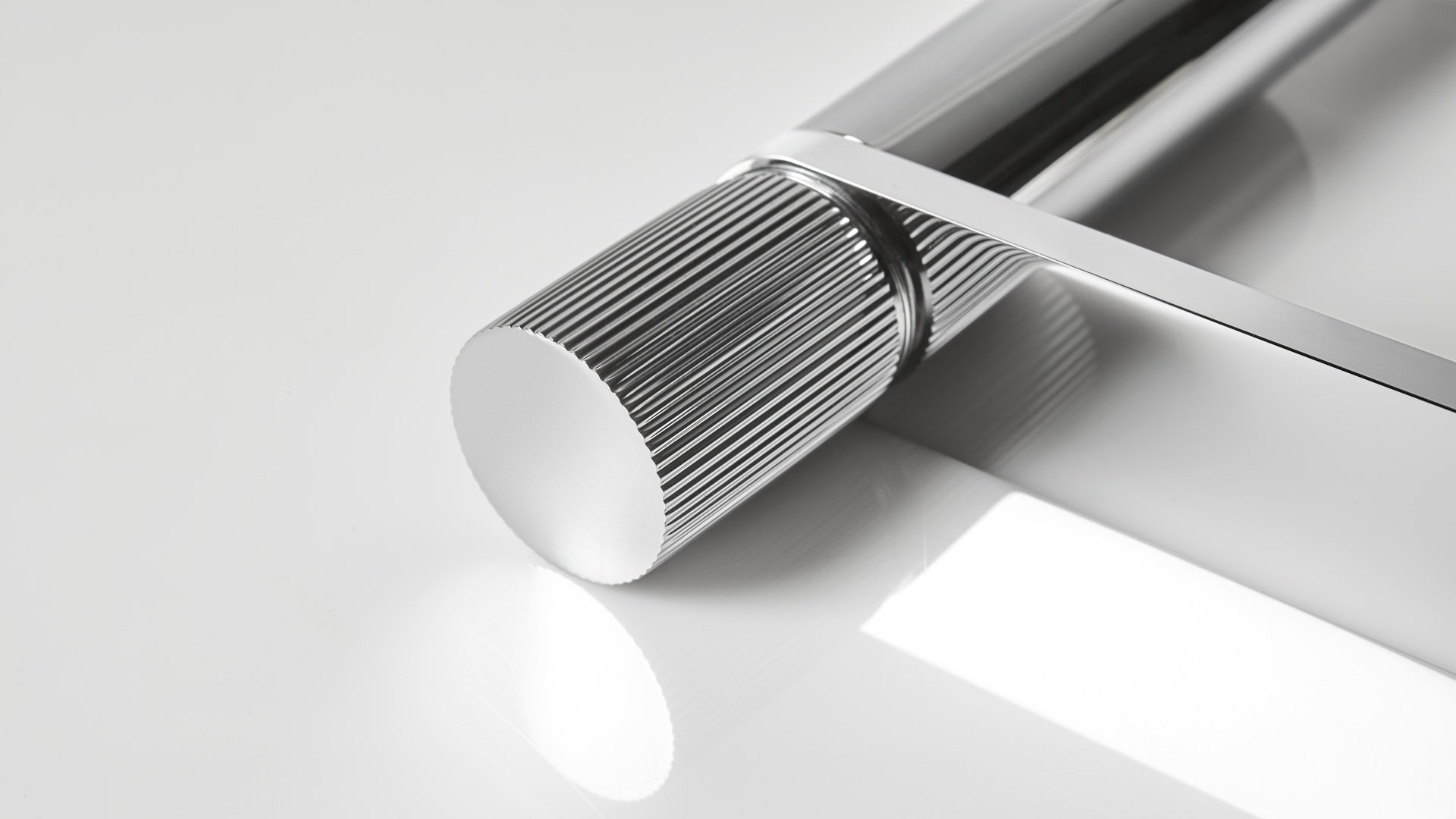 刻有線性凹槽的表面、一系列平行的痕跡和符號裝飾了圓柱形體積,為水龍頭的整體形象賦予了動態外觀。雕塑般的旋鈕成為 INDIGO_Rack 中的一顆明珠,該水龍頭系列具有清晰的幾何形狀和嚴謹的線條。由區分整個 Indigo 系列的明確定義的軌跡的垂直交叉生成的組合物,它在旋鈕中找到排他性和獨特的特征,具有剖析體積的對角線切割的特征。