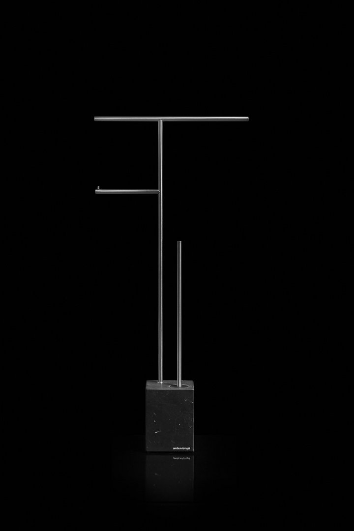 Bivio 系列有一個(gè)圖形和嚴(yán)謹(jǐn)?shù)臉?biāo)志,插入黑色硅膠刮刀刷架,確保完美的衛(wèi)生并賦予物品一個(gè)創(chuàng)新的概念。Carrara Marble 或 Nero Marquinia 的立方體底座,指的是地球的寶貴遺產(chǎn),金屬結(jié)構(gòu)采用黃銅和緞面鋼飾面,可根據(jù)要求提供各種顏色。
