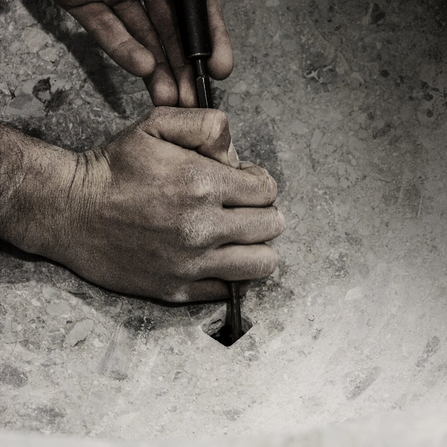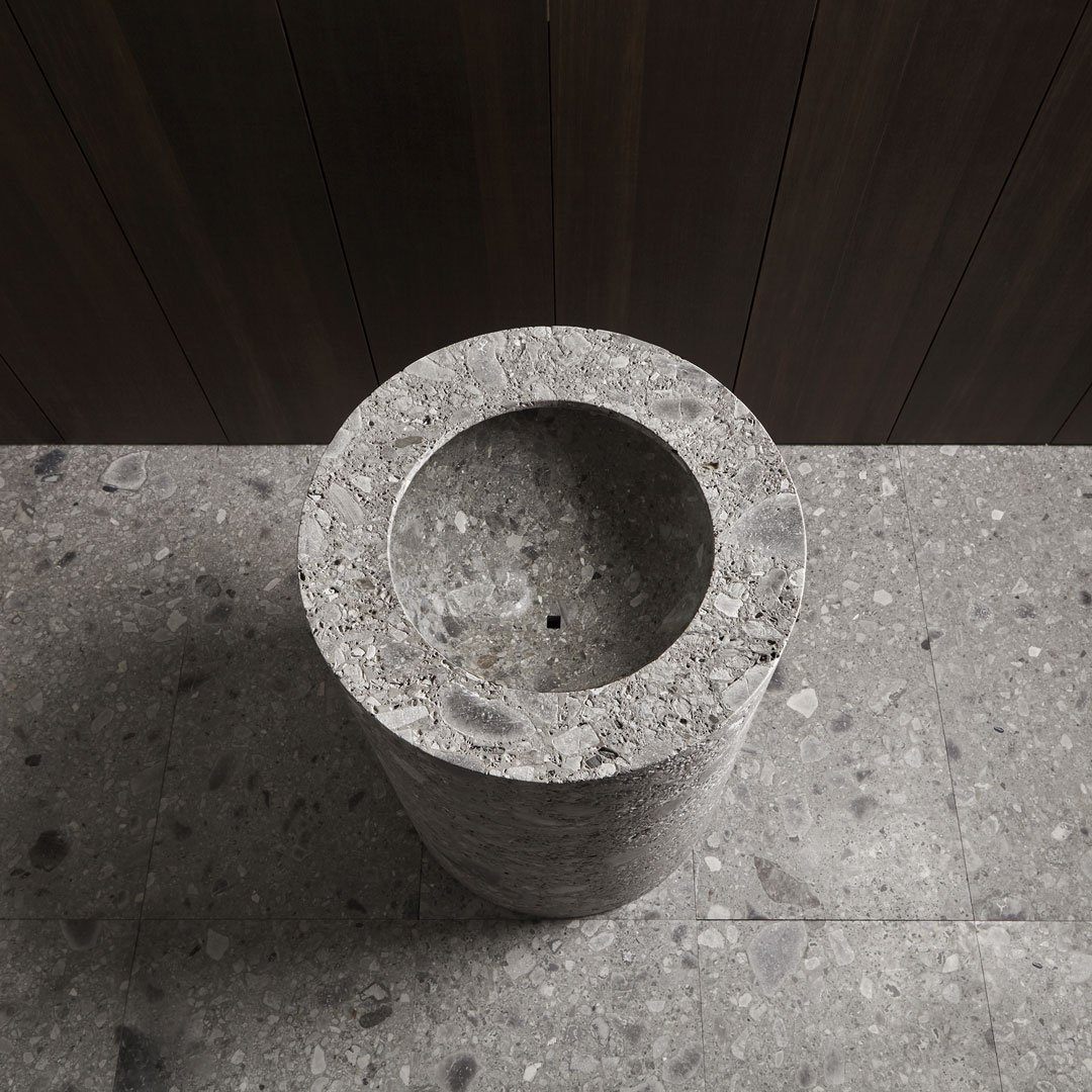 一個完全由天然石材制成的雕塑水槽,甚至傳統的水龍頭也消失了,變成了一個圓柱形的石頭命令。一種漸進和無聲的功能,可將其所有原始力量恢復為水。結果是一個讓人想起洗禮池原型的石柱。