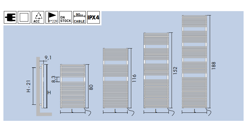 BD 13 electric towel warmer comprises two vertical manifolds with a 35-mm diameter, joined together by means of round-section tubular elements with a diameter of 13 mm, hence the name of the towel warmer itself. The electric version is only available for the single heated towel rail, not for the double version.