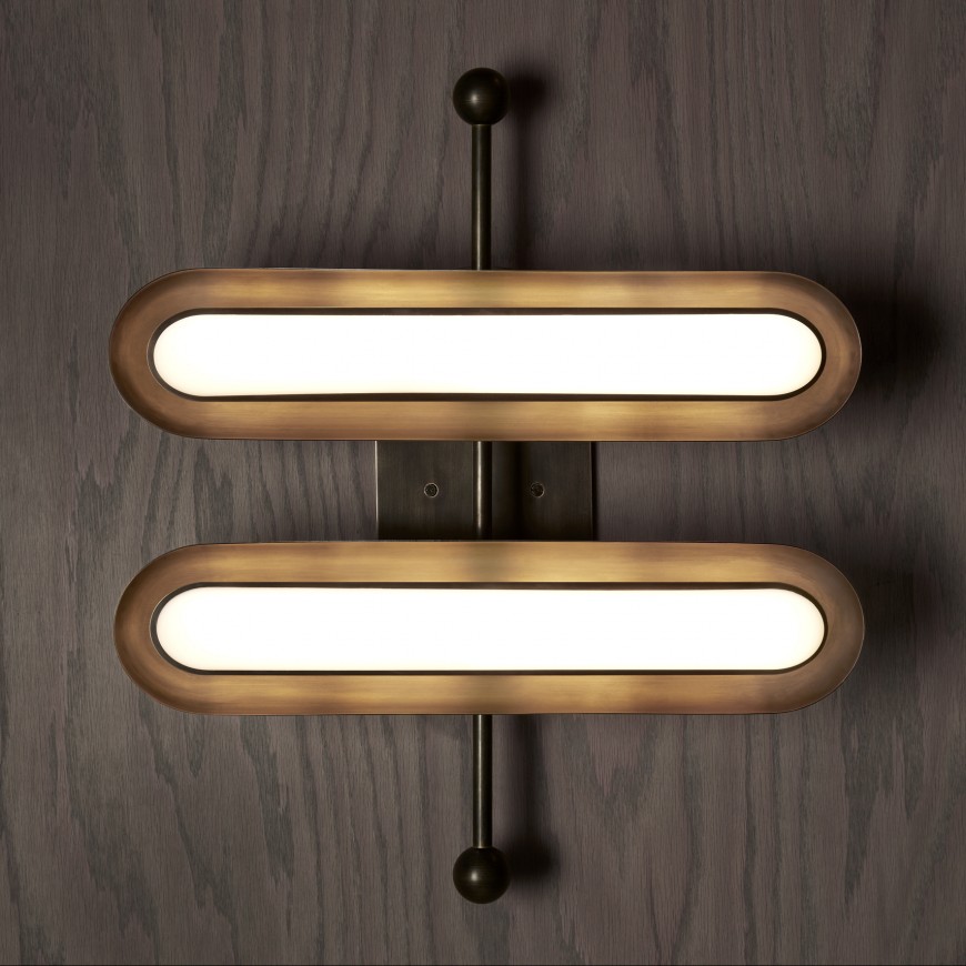 THE CIRCUIT SERIES CREATES RHYTHM WITH THE REPETITION OF PURE SHAPES. A GLOWING GLASS CAPSULE NESTS IN A BRASS SHADE, BECOMING A CONTAINED FORM THAT MULTIPLIES TO CONSTRUCT LARGER FIXTURES.