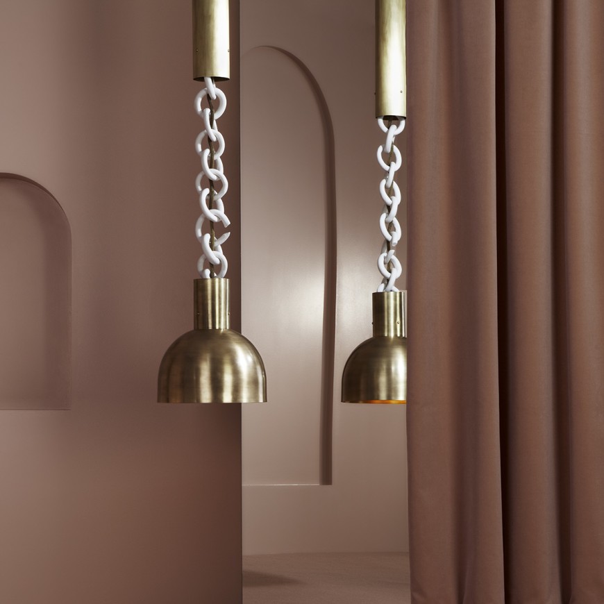 CREATED IN COLLABORATION WITH CERAMICIST ALICE GOLDSMITH, THE LINK PORCELAIN PENDANT EXAMINES BOTH THE STRENGTH AND VULNERABILITY OF THE ARTIST'S PORCELAIN CHAIN. FRACTURED LINKS SUSPEND OVERSIZED BRASS SHADES, THEIR FRAGILITY ANCHORED AND PROTECTED BY THE OPPOSITIONAL METAL.