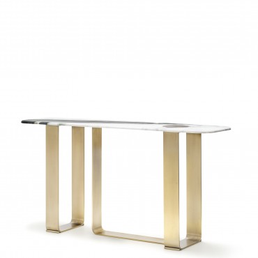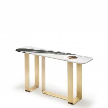 Artisan made by expert hands, our Minerva console table is the outcome of constant quest for new shapes and precious materials. The elegant top in satin Dalmata marble flaunts a beautiful texture which is in rich contrast with the inlay in natural light horn. Supported by a sleek structure in satin metal, this console will lend sophistication to your entryway or living room.