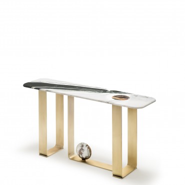 Designed by nature and perfected by expert master craftsmen, our Minerva console table will make a superb addition to a hallway or under a grand mirror. Featuring an elegant top in satin Dalmata marble with an unprecedented marquetry in glossy horn, this console table is a lush interplay of complex textures and subtle natural veins. Sat atop a sleek structure in satin metal, embellished by a decorative horn sphere, Minerva will imbue a contemporary home with sophisticated elegance.