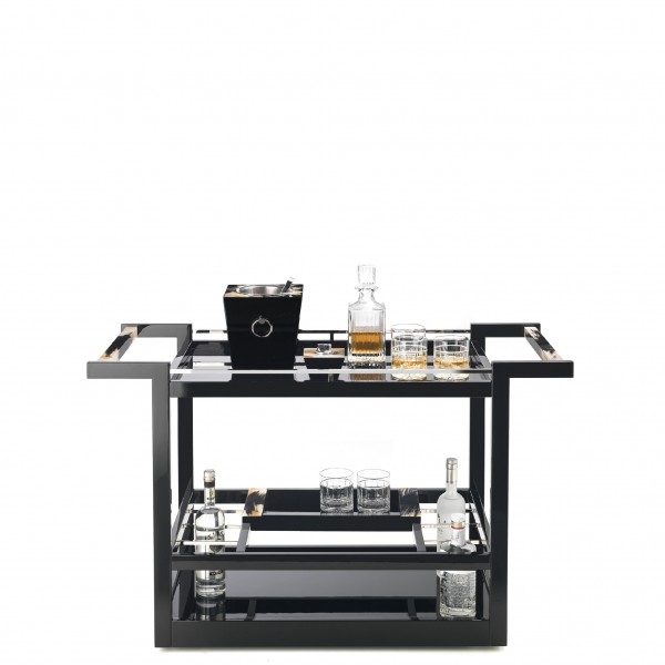 Create an opulent gathering spot at home with Elia trolley, meant to serve your guests and to store your favorite bottles and barware. An objet d'art on days off from entertaining, this trolley features a structure in glossy black lacquered wood embellished by unique handles in dark horn. The design features two bottle racks in chromed brass and a removable serving tray in horn and black lacquered wood with gloss finish. With a set of high quality rubber wheels, this piece can be easily moved around the home.