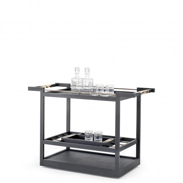 Trolley with rubber wheels in black oak veneer. Handles in matte horn and burnished brass detailing.
