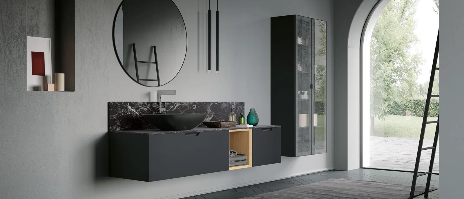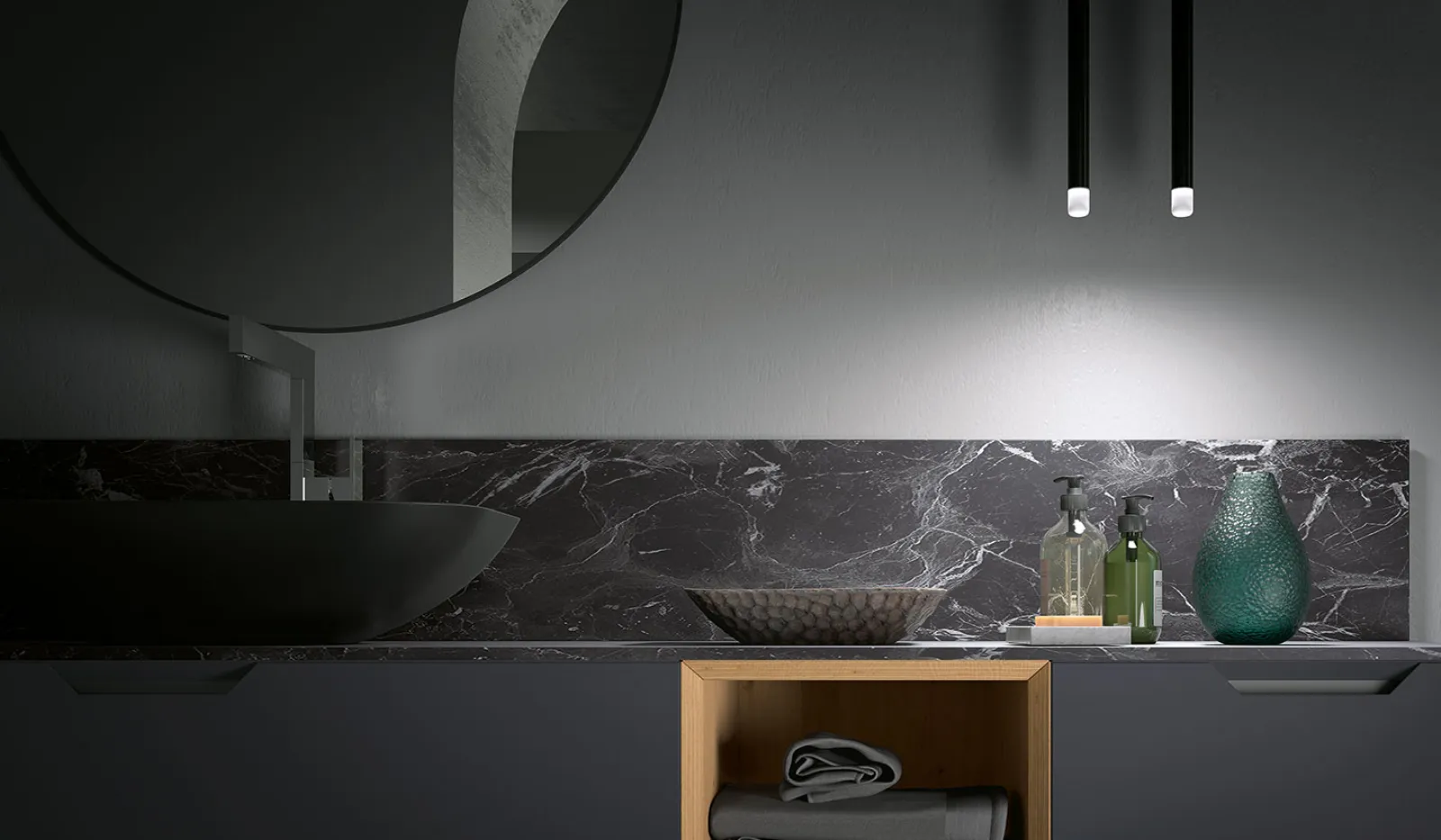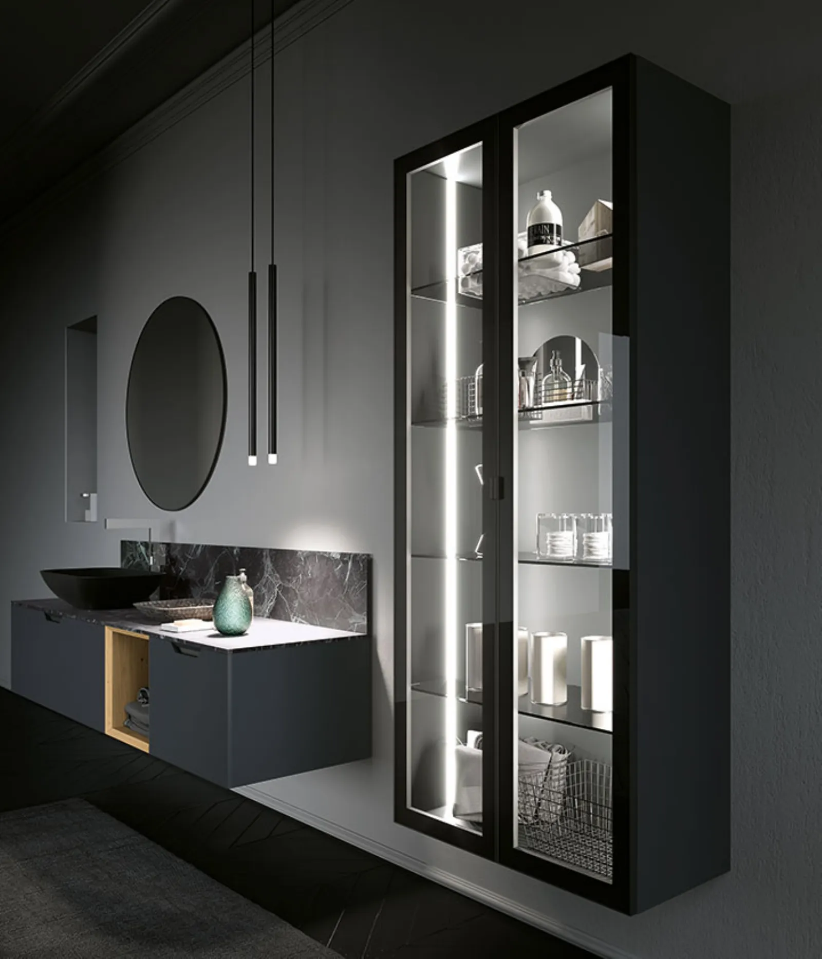 Laccato Ferro Opaco con base a giorno impiallacciato Rovere Nordico naturale, top hpl Impero con lavabo Cover Nero Opaco. Specchio Gamma e lampade Tube in metallo nero. Colonne con telaio Titanio e vetro fumé, illuminazione interna a led.