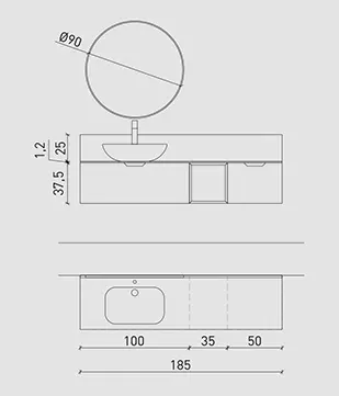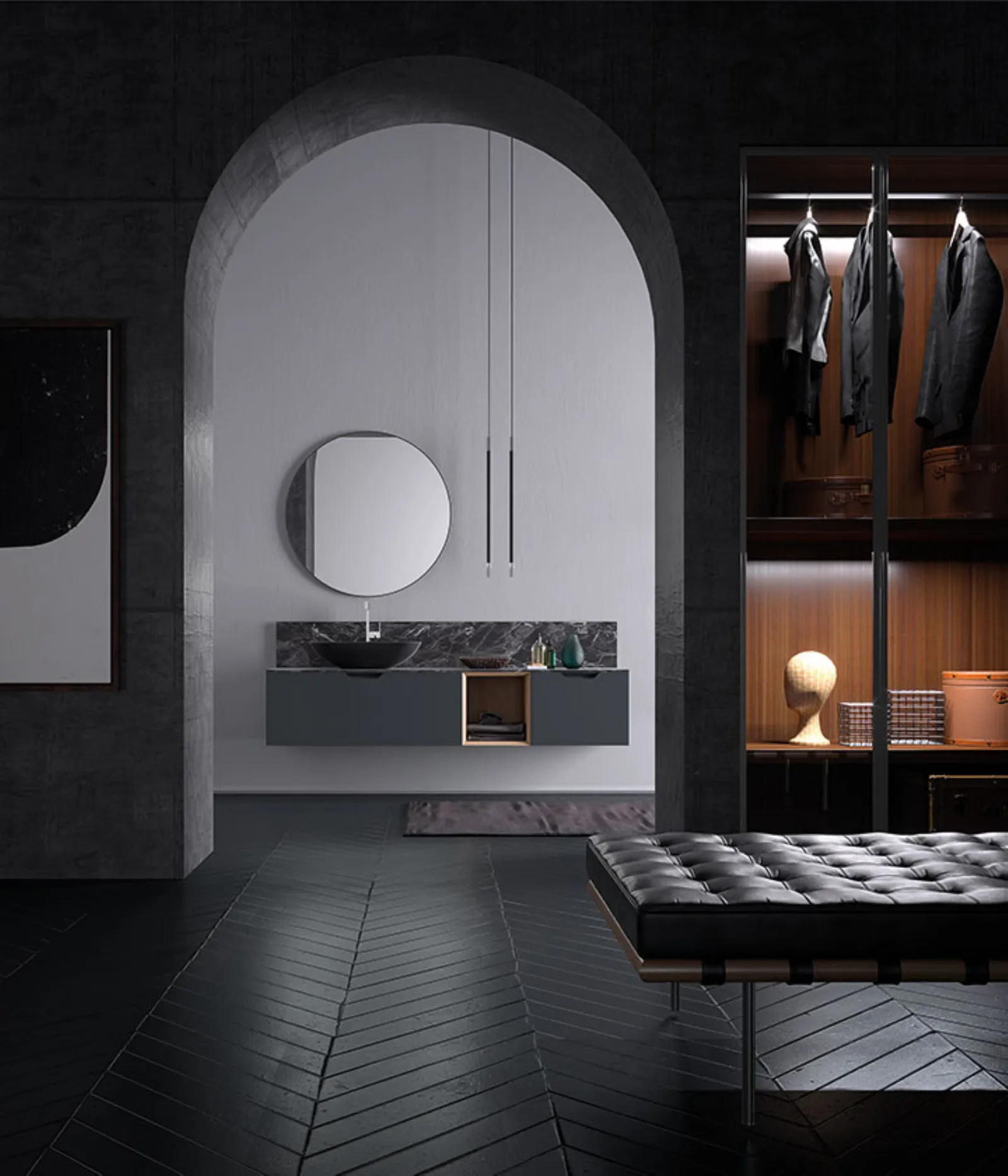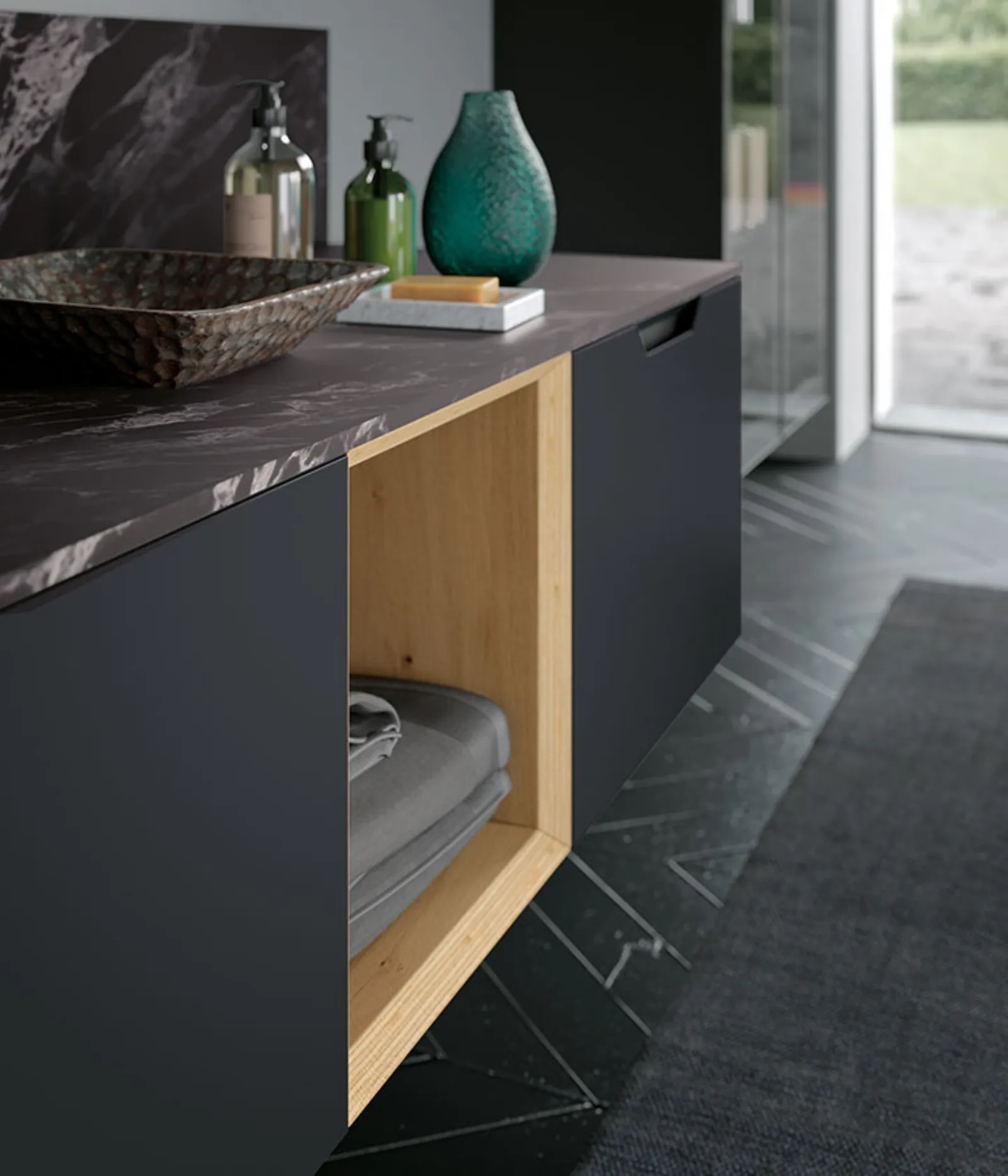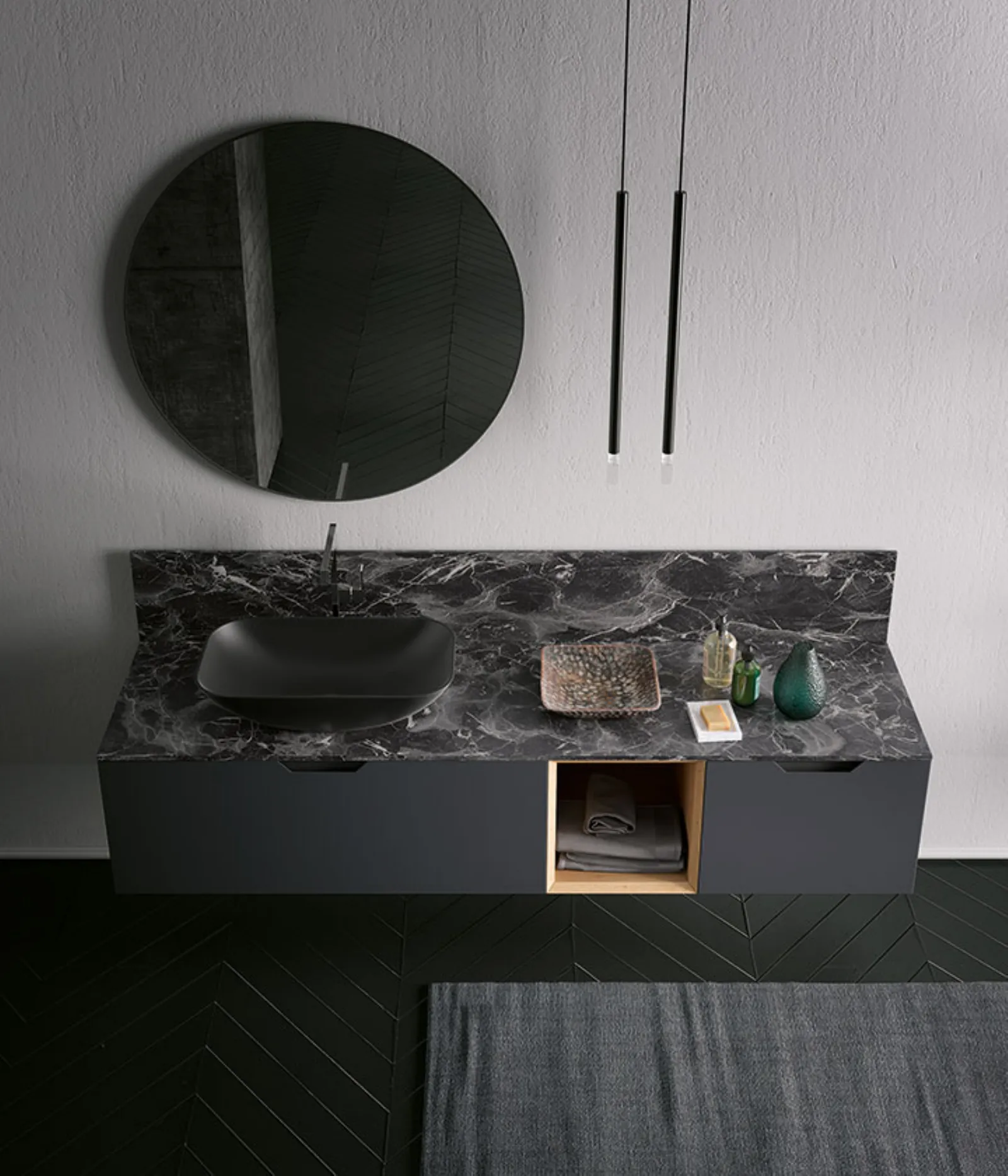 Laccato Ferro Opaco con base a giorno impiallacciato Rovere Nordico naturale, top hpl Impero con lavabo Cover Nero Opaco. Specchio Gamma e lampade Tube in metallo nero. Colonne con telaio Titanio e vetro fumé, illuminazione interna a led.
