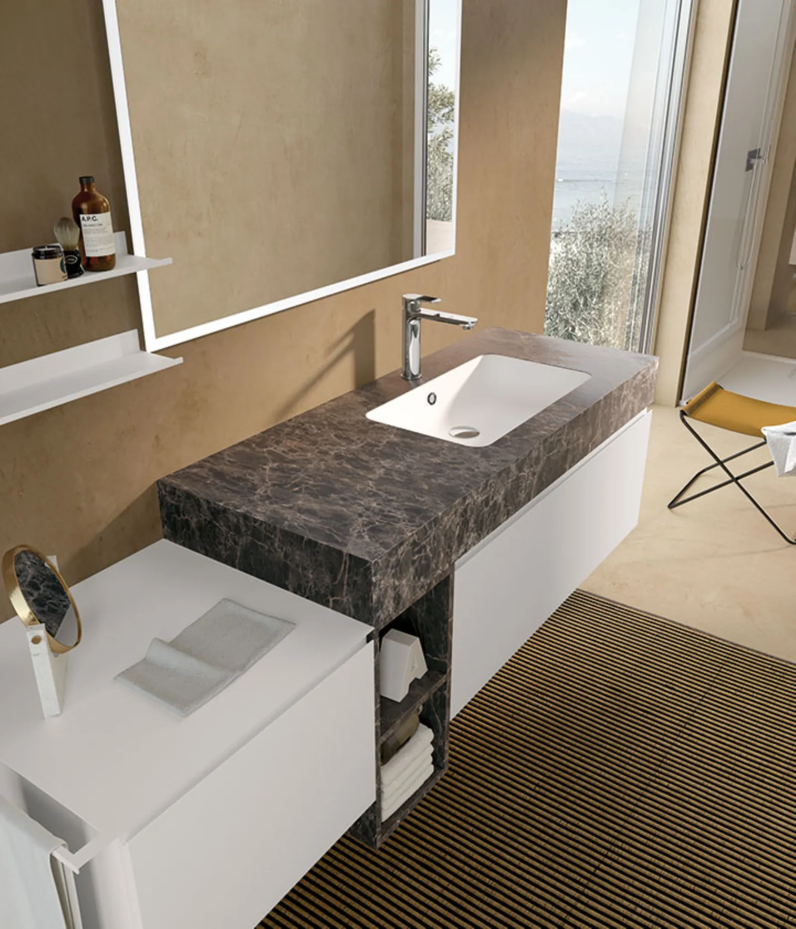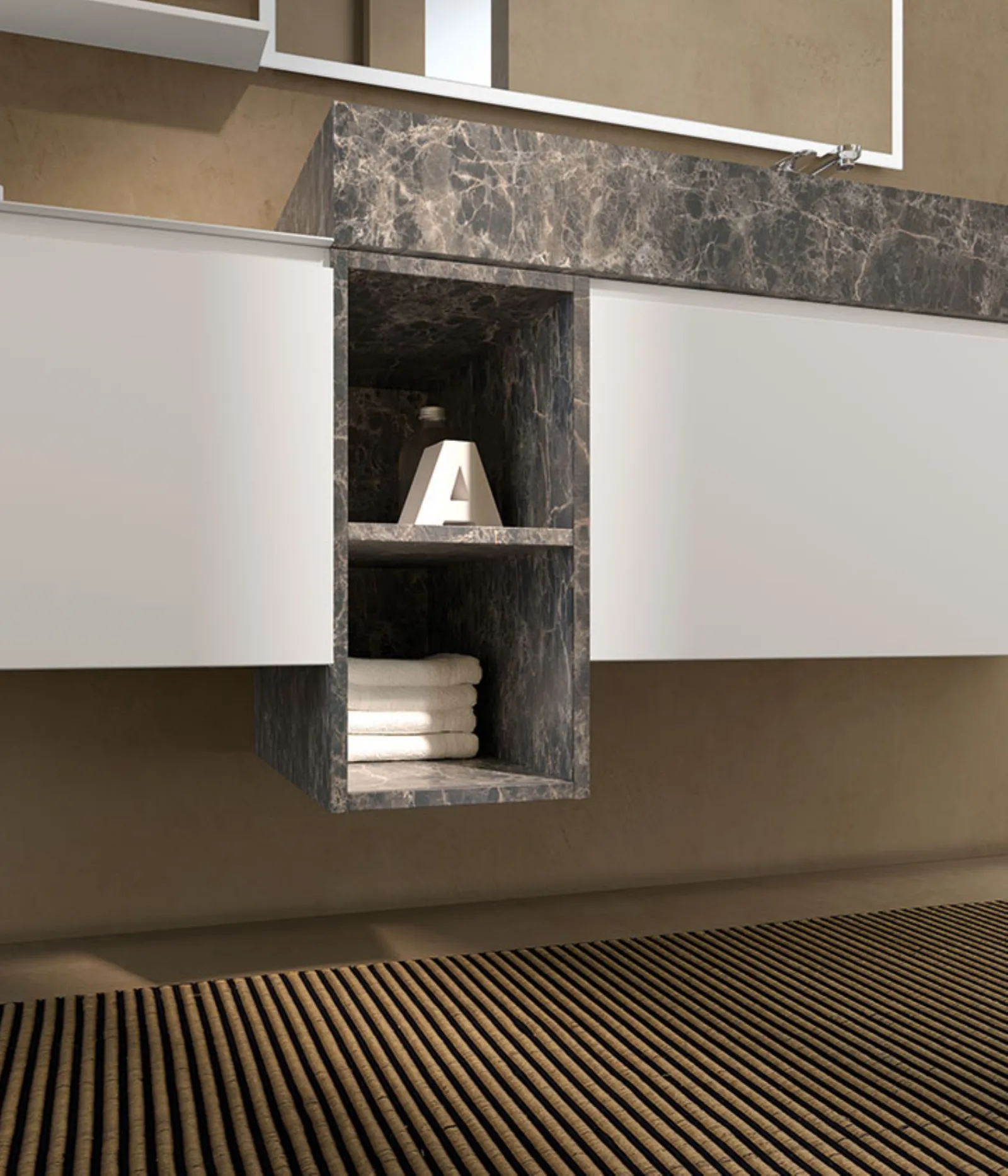 Laccato Bianco Opaco con base a giorno hpl Brown 425. Top hpl Brown 425 con vasca integrata “on” in Ocritech, specchio Luna.