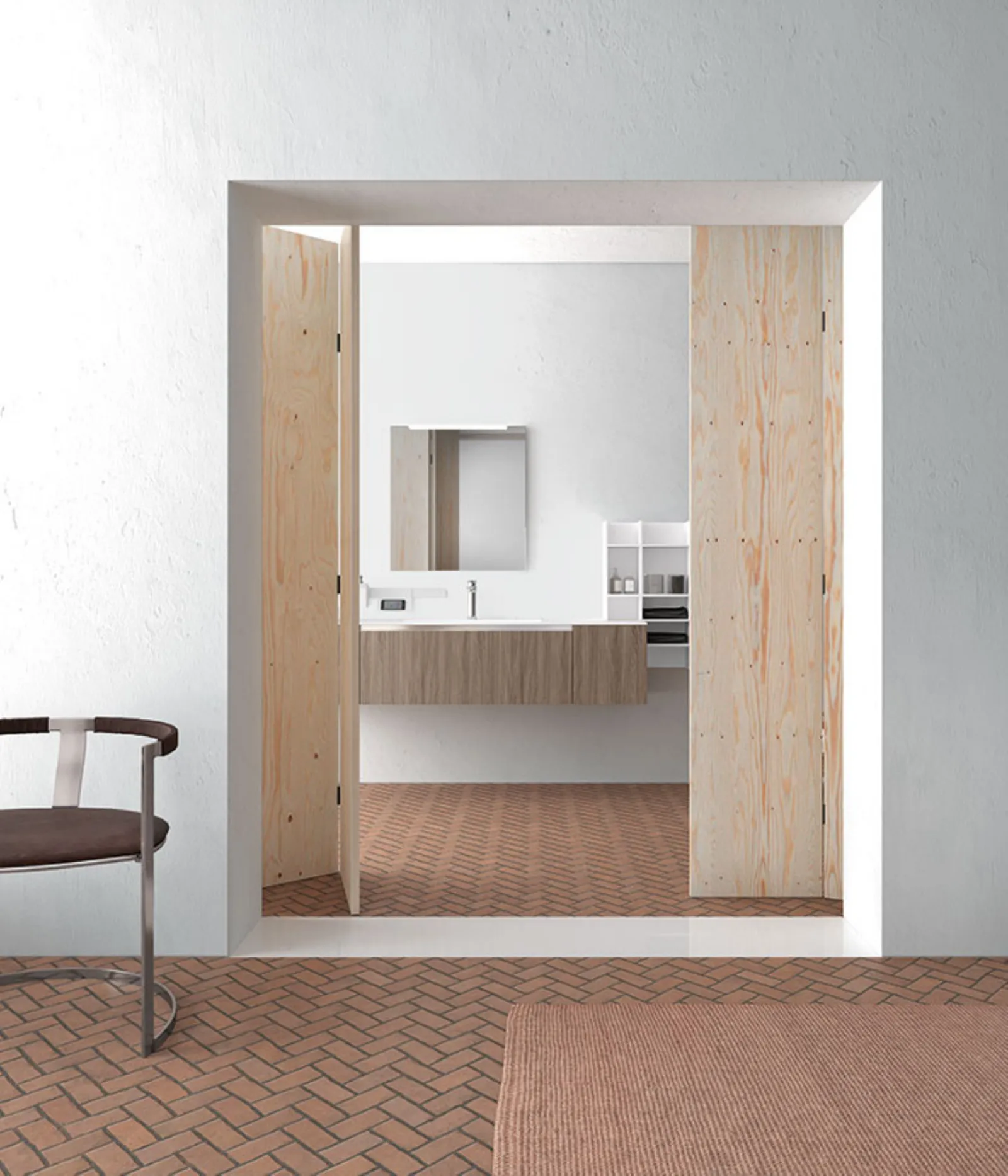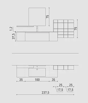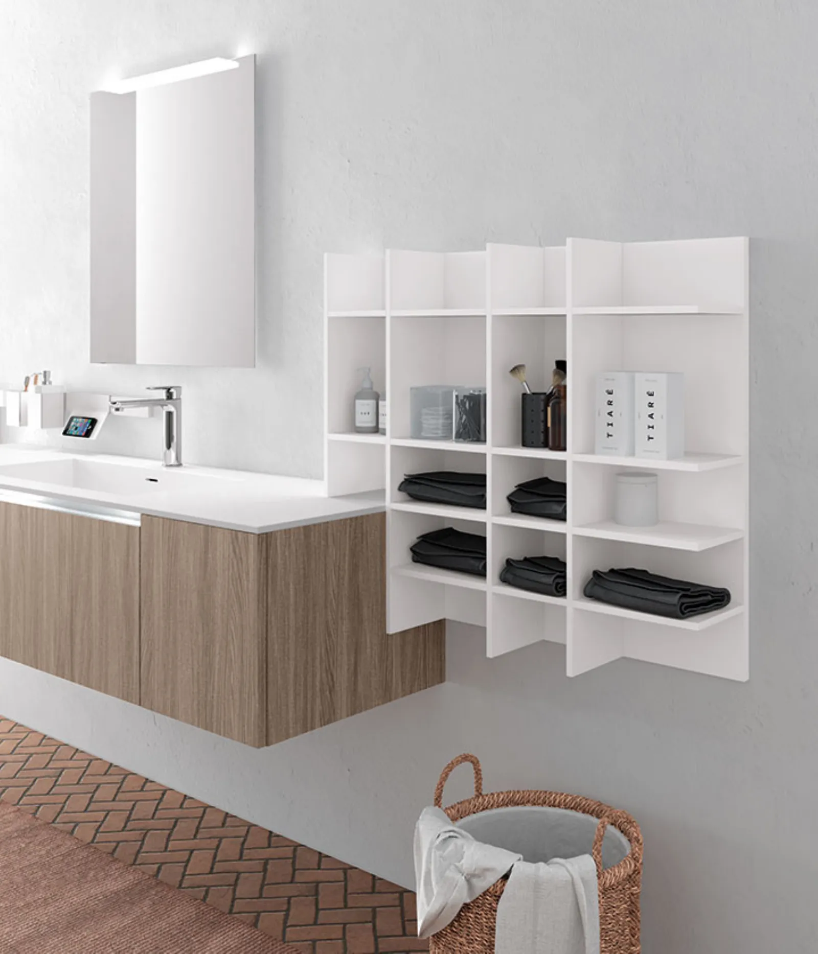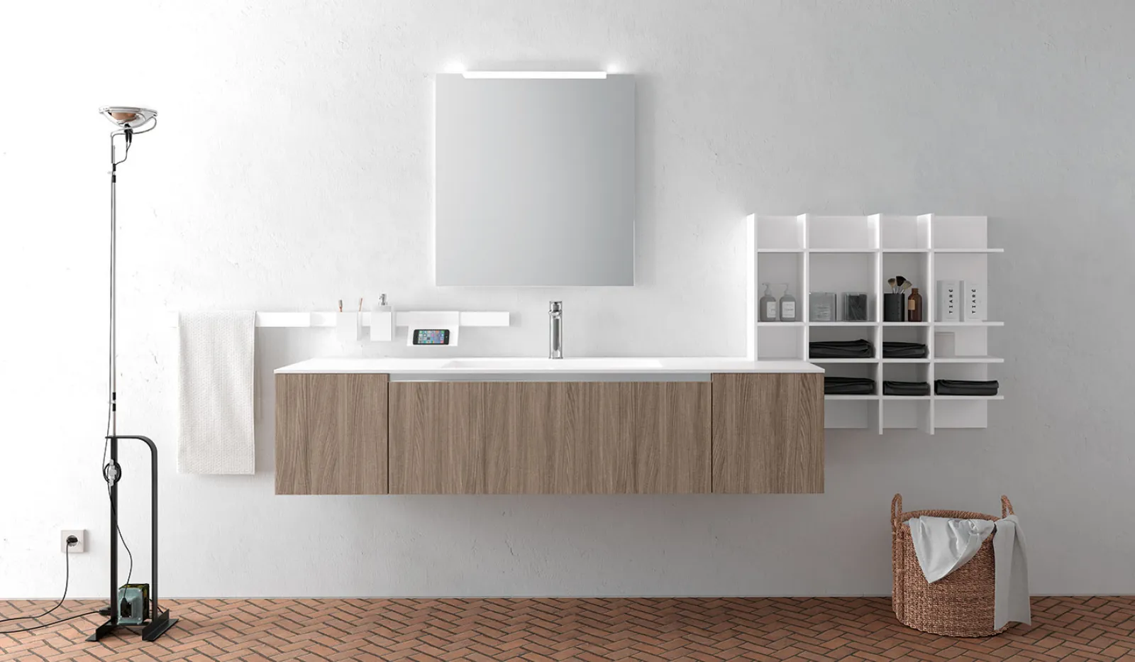 Skin Jerez, elementi a giorno Square laccati Bianco Opaco, maniglia alluminio satinato. Top Tecnoril con vasca integrata “H”, specchio Filo con lampada Clio Slim.