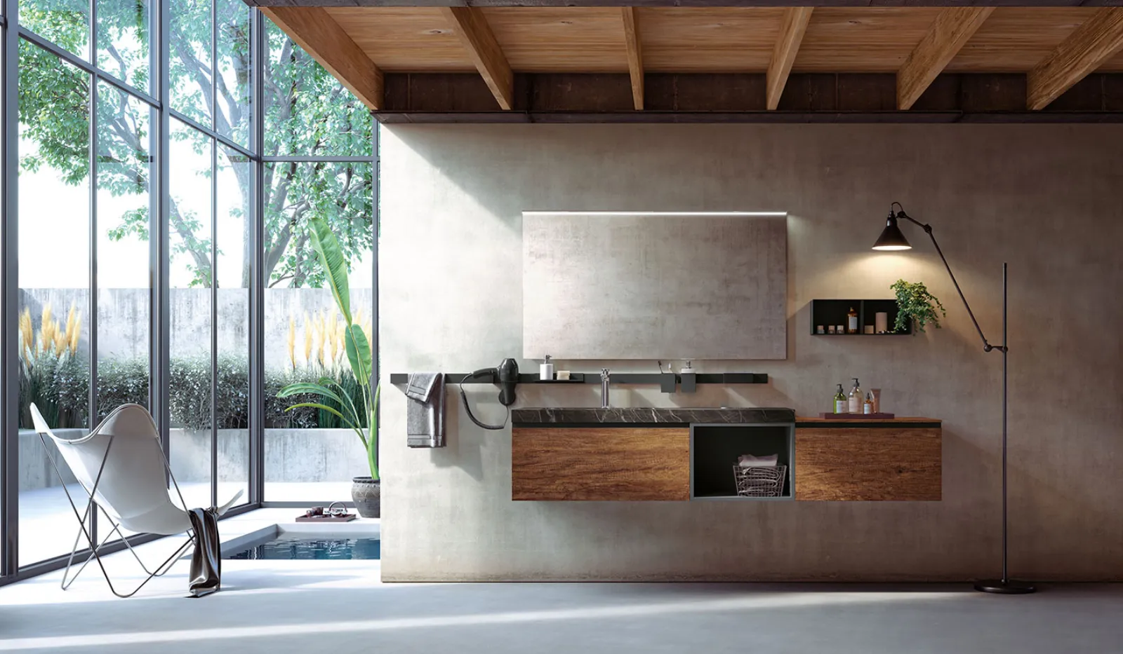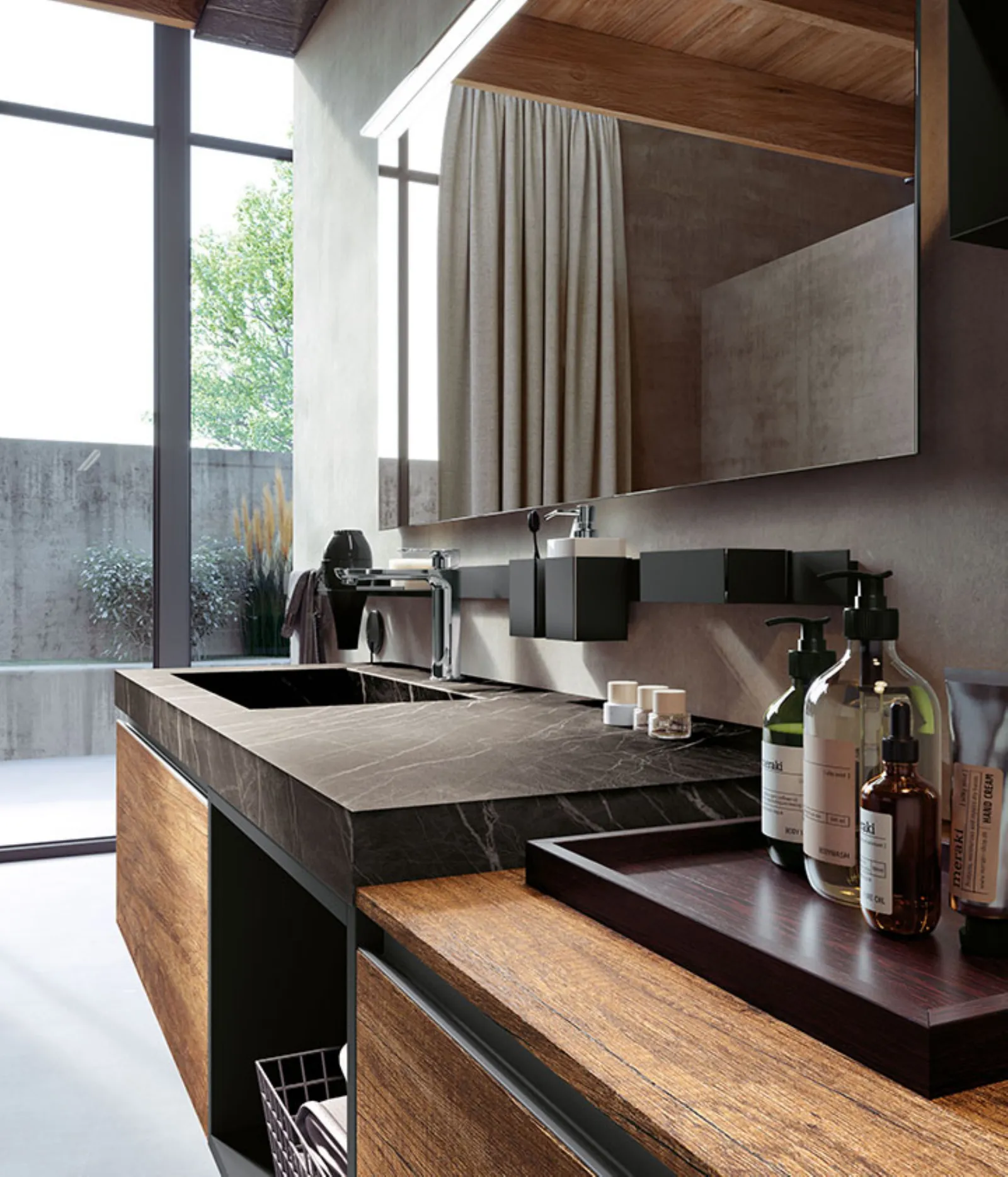 Nodato Canyon con particolari laccati Titanio e maniglia Titanio, top gres Noir Desir opaco sp. 6 cm con vasca integrata “gg”, specchio Filo con lampada Metro.
