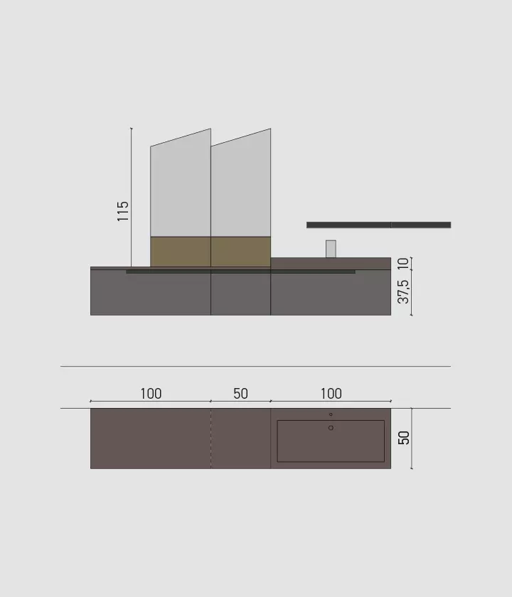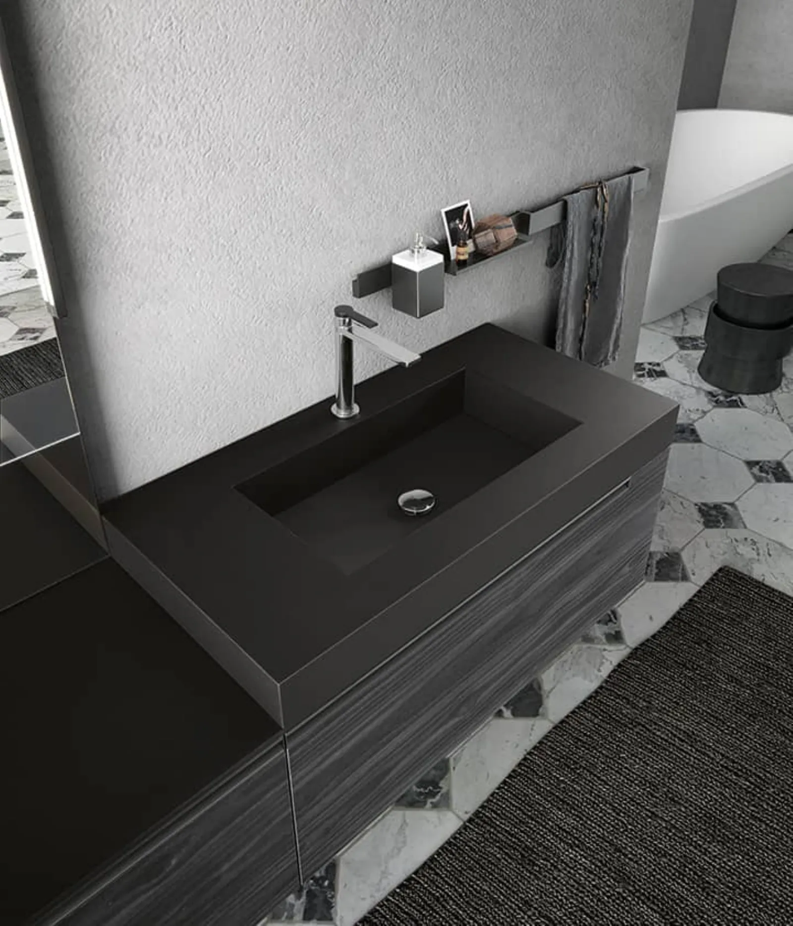 Bimelaminico Shibuya con maniglie titanio. Top in fenix nero 720 con vasca integrata HG. Specchi Line con lampada Compasso.