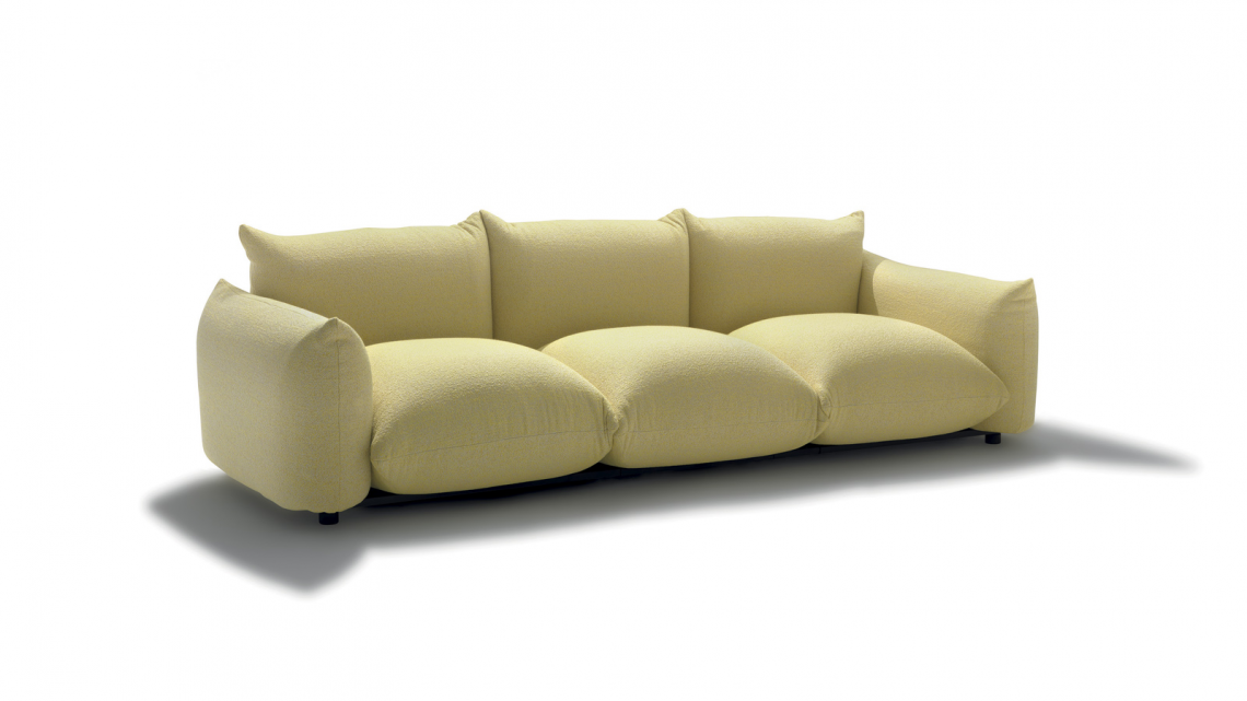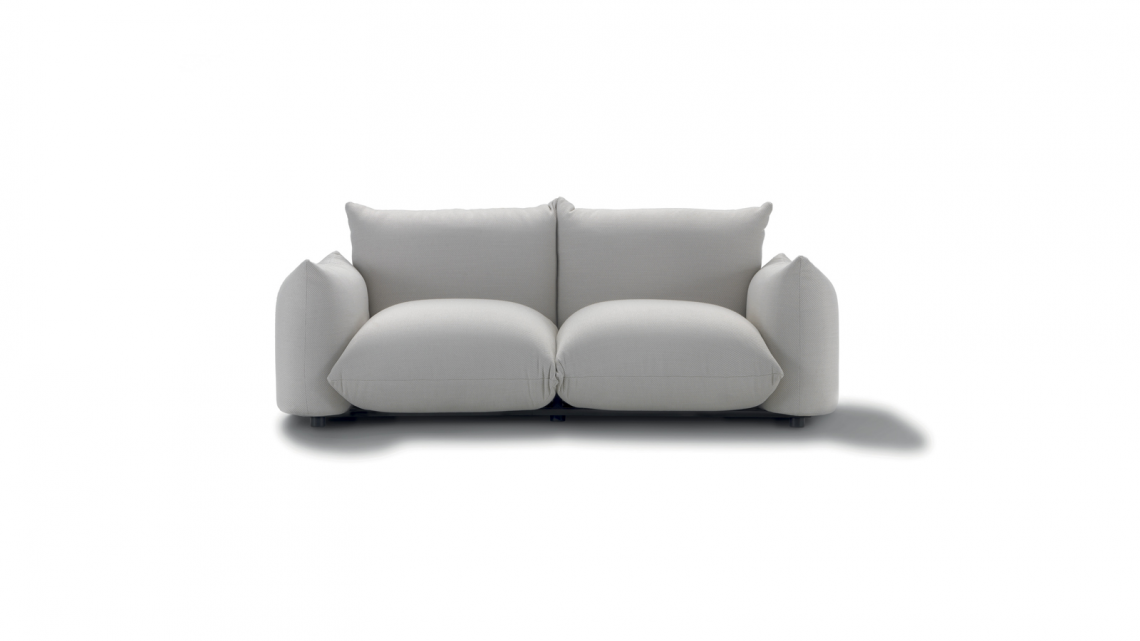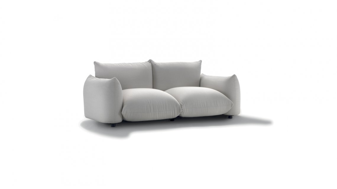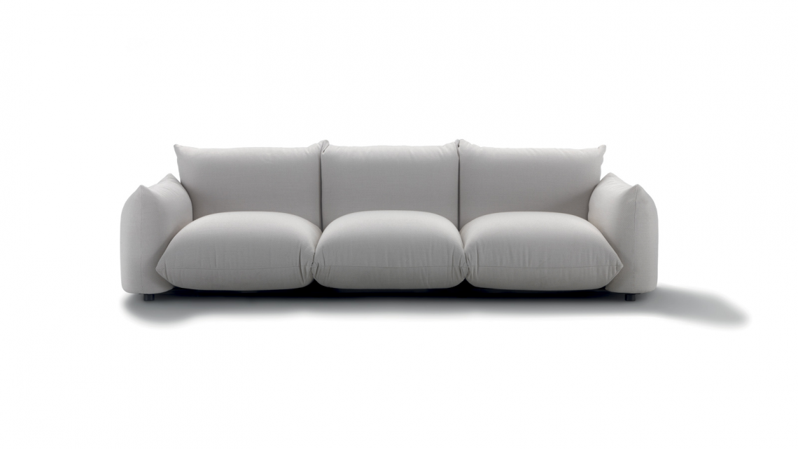 Linear sofa with soft, rounded shapes, which can be used to furnish both residential and hospitality verandas.